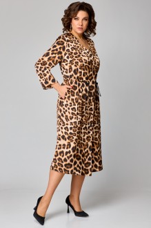 Женское платье Х-силуэта выполнено из атласа «леопард» длиной миди. По переду нагрудные вытачки. Спинка со средним швом. По линии талии настрочена кулиса в которую вдет декоративный шнур, имеется фиксатор и наконечник.V-образный вырез горловины. Рукав втачной одношовный с притачной манжетой. Центральная застежка на 7 пуговиц и петель.