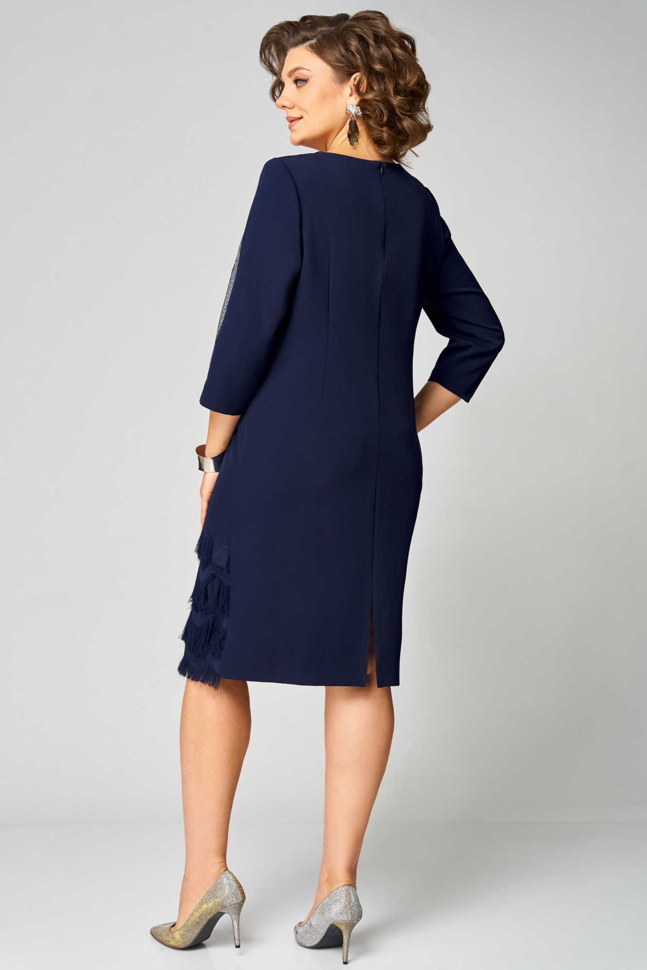 Платье полуприлегающего силуэта. Округлый вырез горловины, обработан обтачкой. Перед с нагрудными вытачками и подрезом из бахромы по диагонали. Трикотажная подкладка идет от подреза только по переду. Рукав втачной, по центру рукава вставка из сетки. Спинка со средним швом и разрезом по низу, застежка на потайную тесьму-молнию.