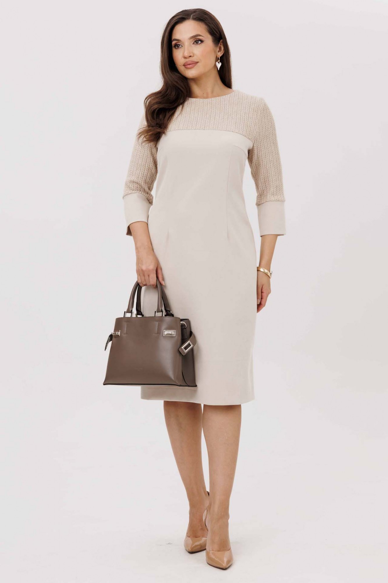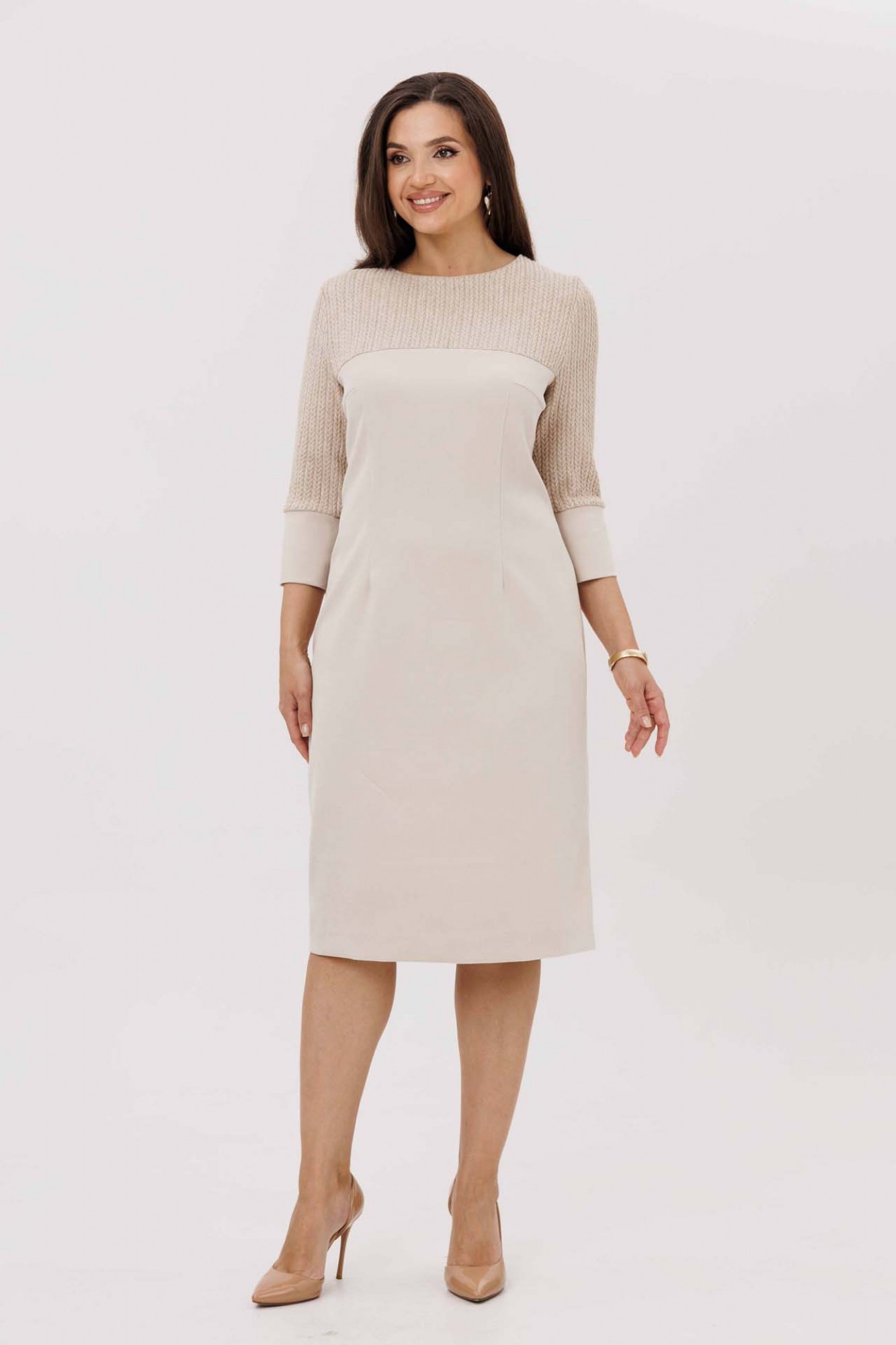 Платье полуприлегающего силуэта. Перед с отрезной кокеткой из отделочной ткани и с нагрудными и талиевыми вытачками. Спинка со средним швом, в который вставлена тесьма-молния). На спинке талиевые вытачки. Средний шов заканчивается шлицей. Рукав одношовный втачной из отделочной ткани с притачным манжетом из основной ткани.