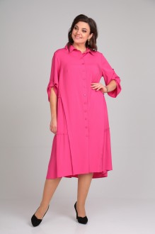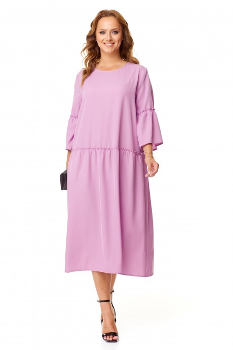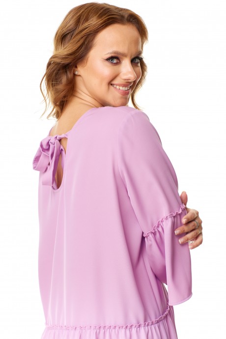 Платье свободного прямого кроя, выполненное из плательной ткани (не тянется). Платье отрезное ниже линии талии. Верхняя часть переда и спинки цельные, в нижней части отрезной присборенный волан. Горловина платья по переду –округлой формы, по спинке – фигурной формы, завязывается на бант из основной ткани. Рукава втачные, одношовные с отрезными присборенными воланами.