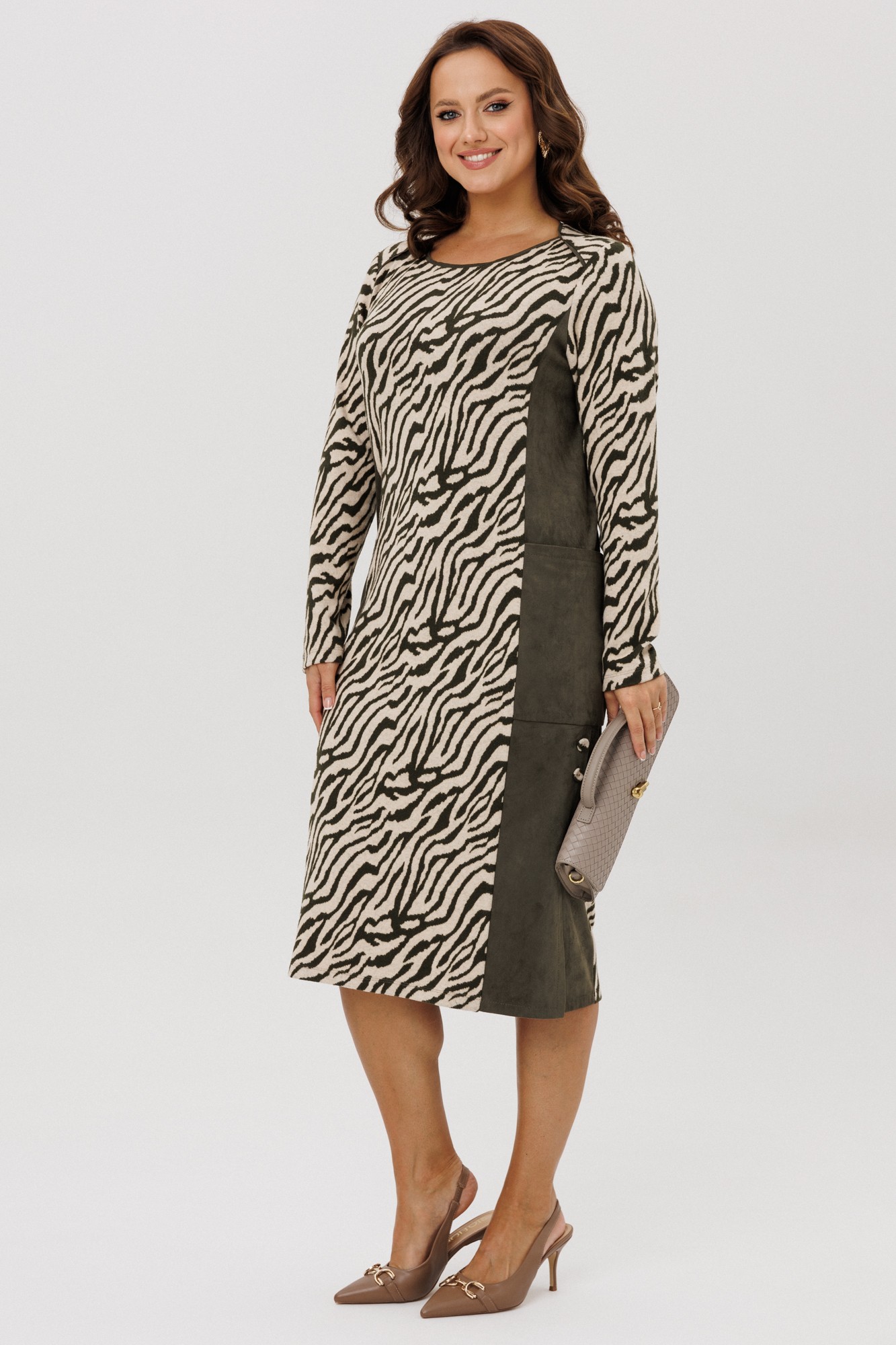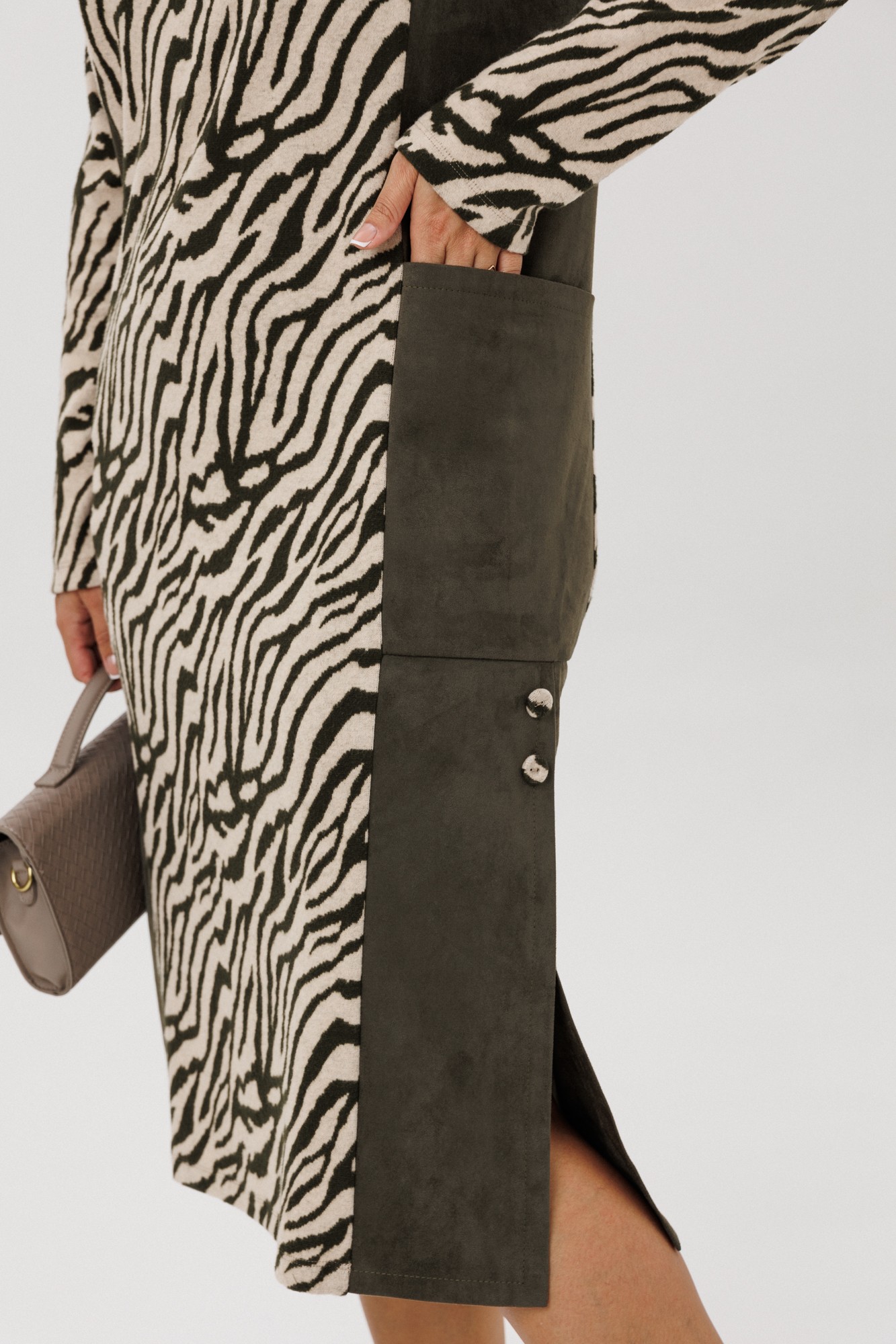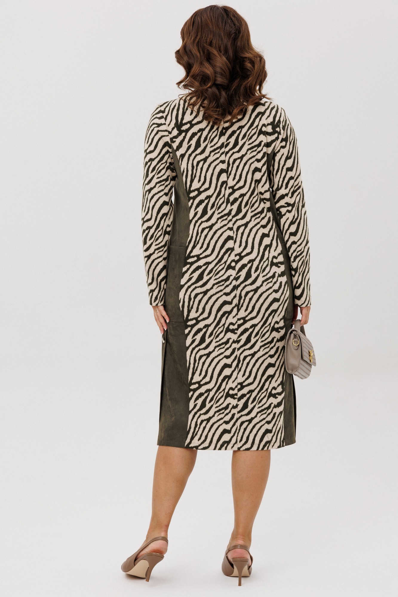 Платье женское полуприлегающего силуэта, выполненное из двух видов ткани: мягкого трикотажного полотна с принтом «Зебра» и плательной ткани «Замша», которые немного тянутся. По переду и спинке отрезной бочок, накладной карман. По боковым швам низ платья со шлицами и отделочными пуговицами. По спинке средний шов. Горловина переда – «Лодочка», по спинке – округлая, переходящая в линию кокетки. Срезы горловины обработаны отделочными кантами. Рукава втачные, одношовные. Платье без подкладки.