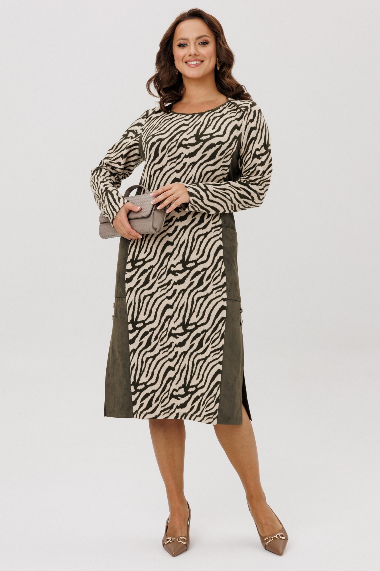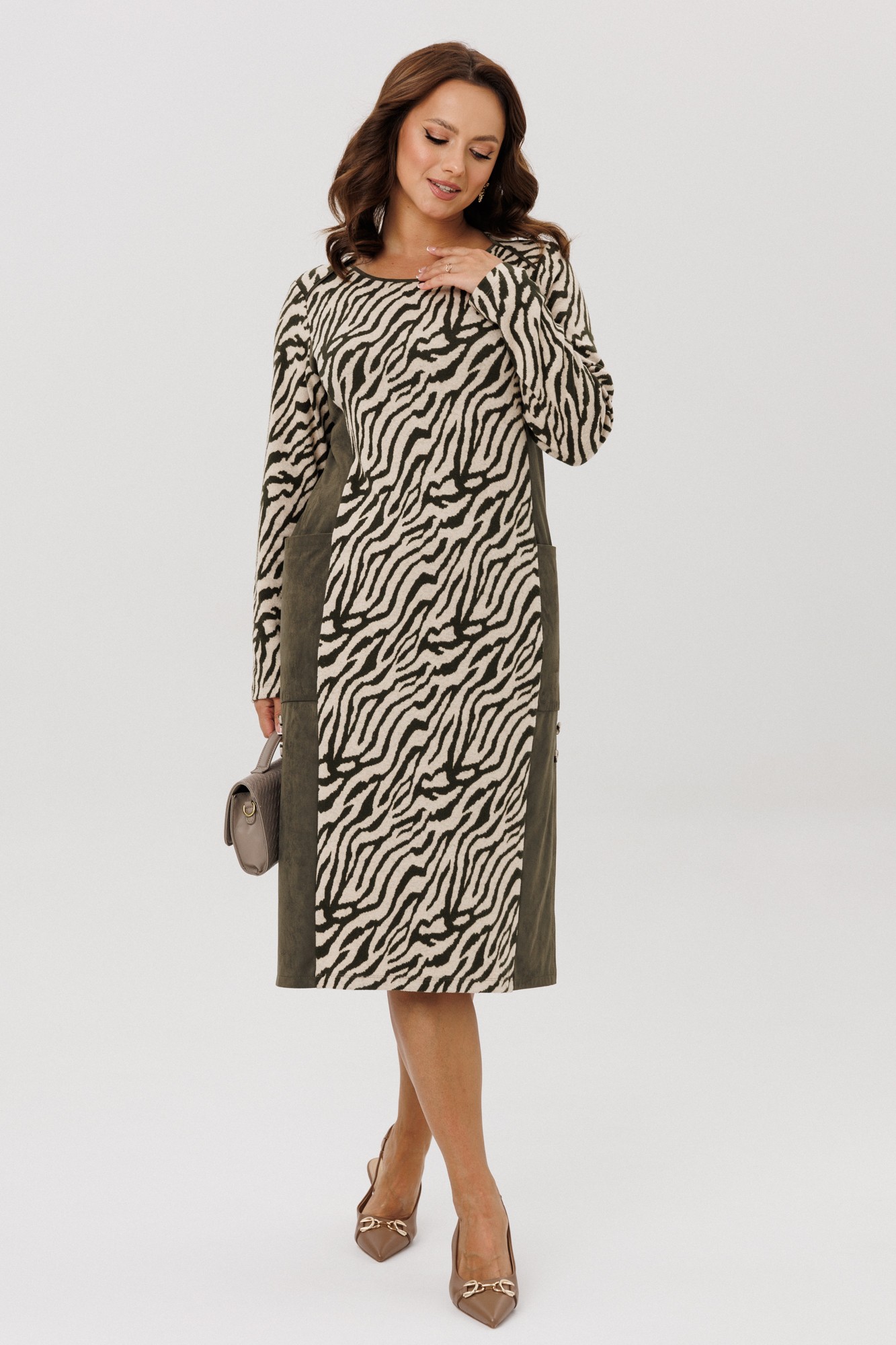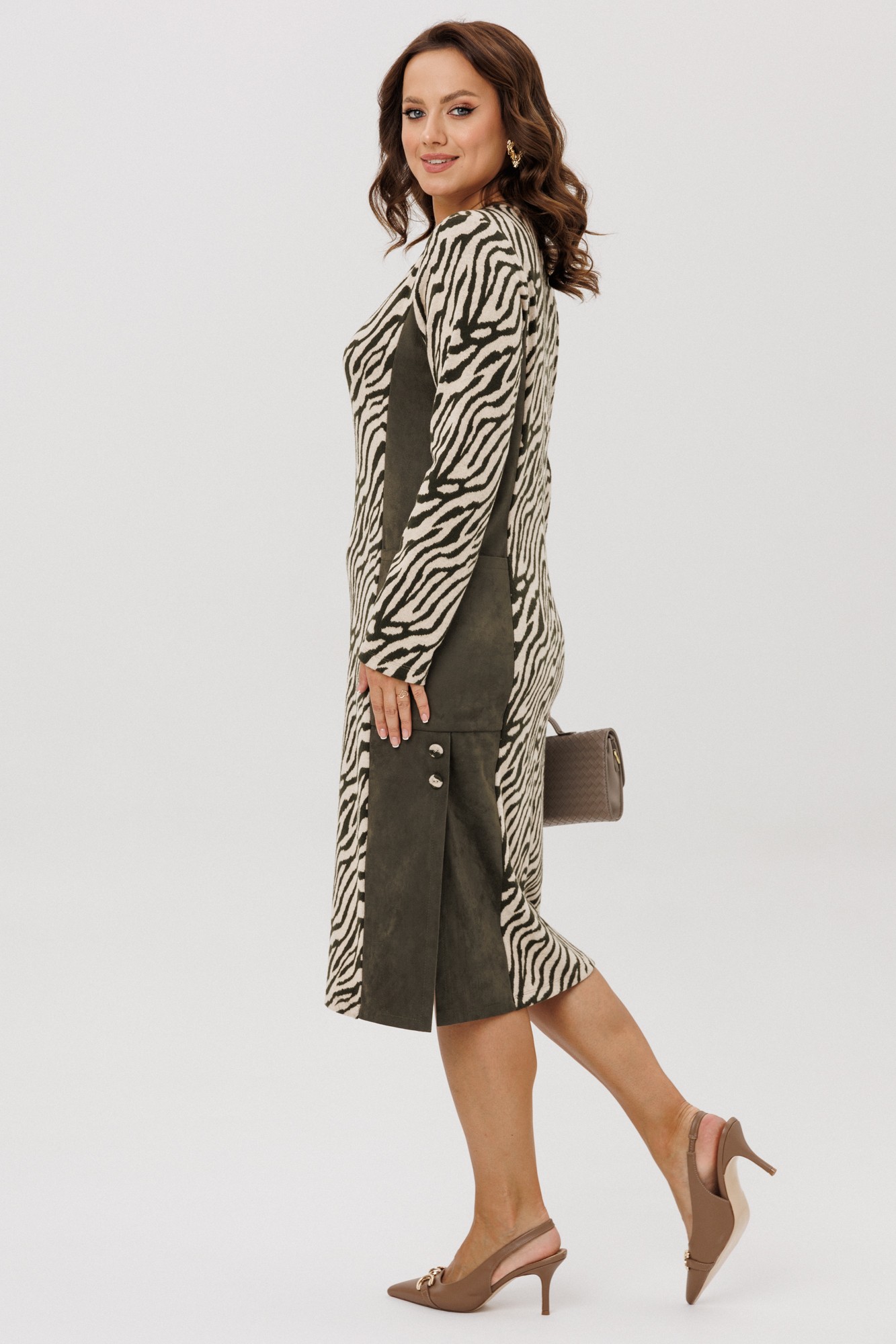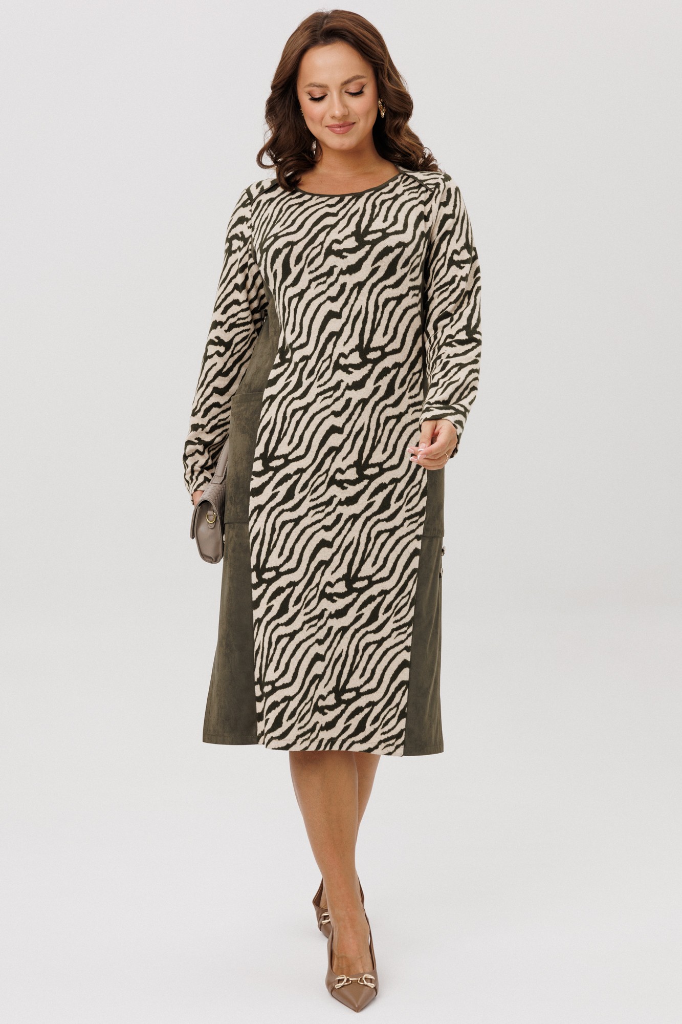 Платье женское полуприлегающего силуэта, выполненное из двух видов ткани: мягкого трикотажного полотна с принтом «Зебра» и плательной ткани «Замша», которые немного тянутся. По переду и спинке отрезной бочок, накладной карман. По боковым швам низ платья со шлицами и отделочными пуговицами. По спинке средний шов. Горловина переда – «Лодочка», по спинке – округлая, переходящая в линию кокетки. Срезы горловины обработаны отделочными кантами. Рукава втачные, одношовные. Платье без подкладки.