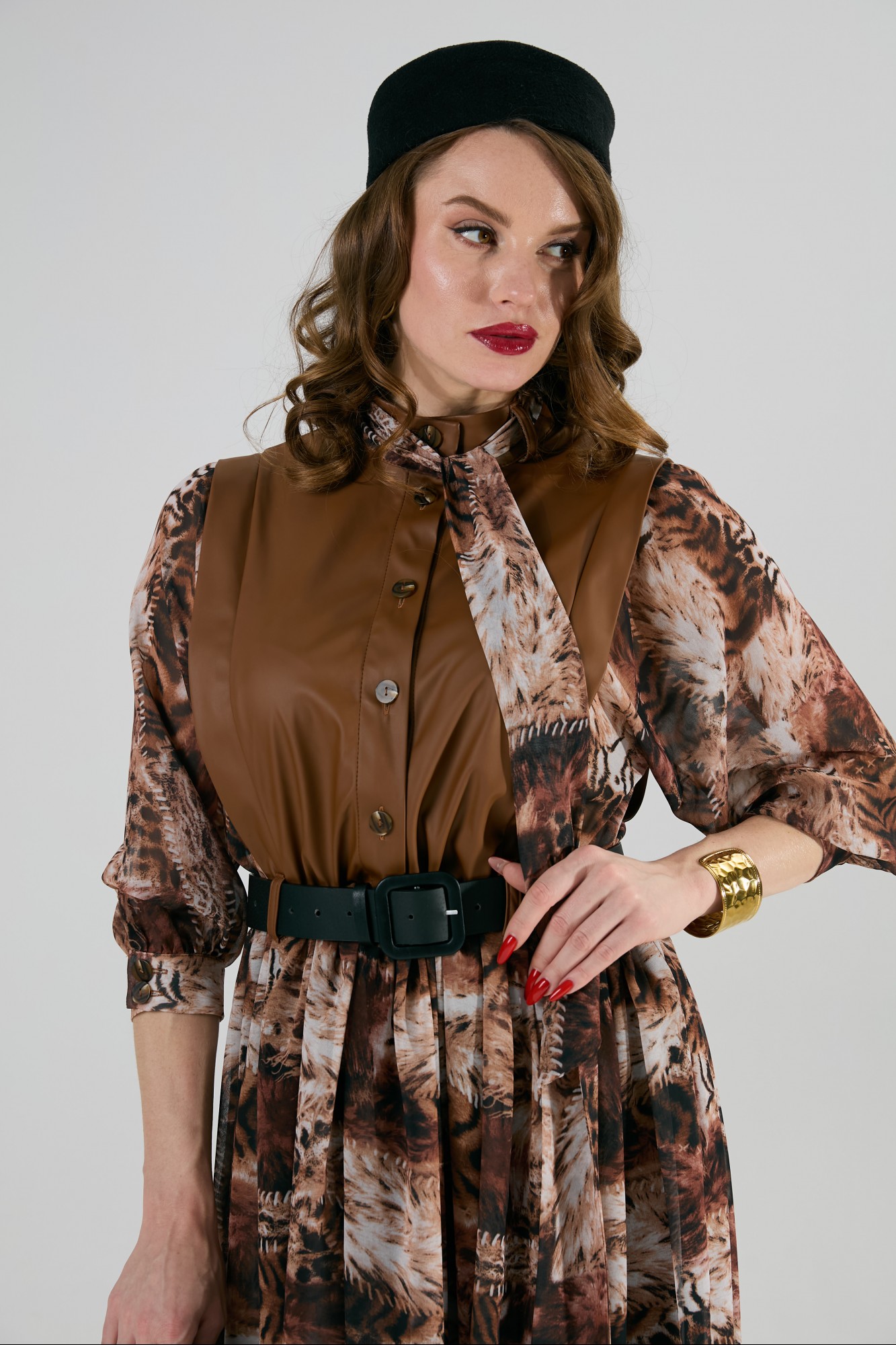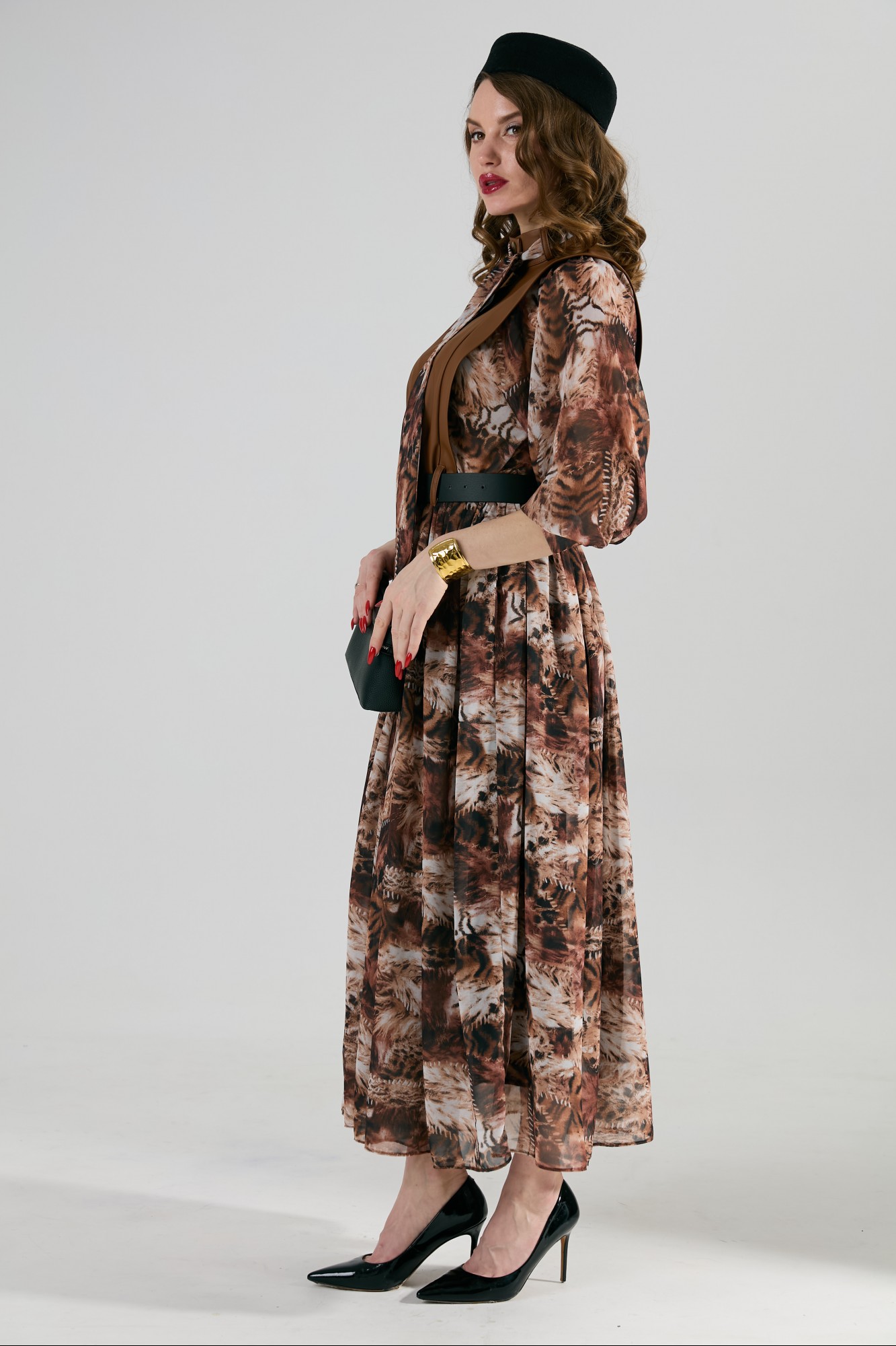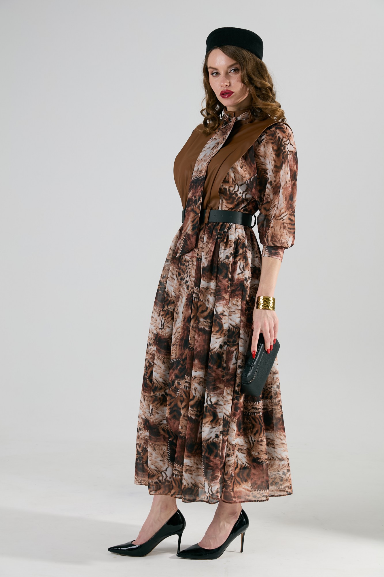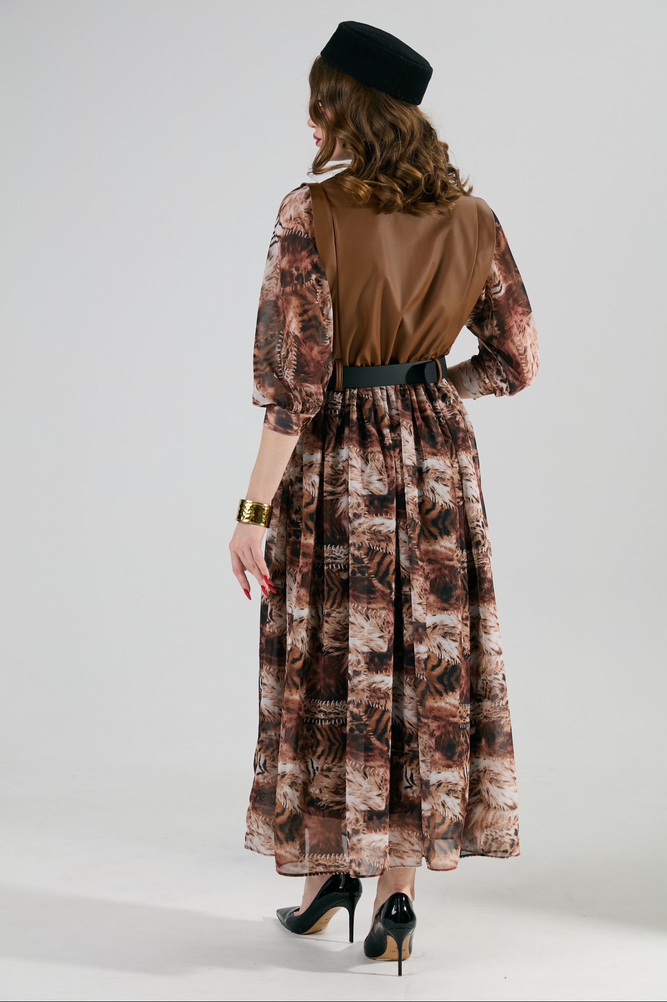 Платье комбинированное длиной макси, отрезное по линии талии с цельнокроеными рукавами. Застежка центральная с цельнокроеными планками на петли и пуговицы. Верхние части переда и спинки с вертикальными рельефами, начинающимися от линии плеча. Бантовая складка расположена по центру, боковые складки направлены от центра изделия в сторону бокового шва. Рукав цельнокроеный с боковыми частями переда и спинки с углубленной до линии талии проймой. По центру оката рукава сборка. Нижний срез рукава обработан притачной манжетой. Застежка манжеты на петли и пуговицы. Платье по линии талии собрано на резинку. Горловина изделия круглой формы, обработана воротником-стойкой, с застежкой на петли и пуговицы. Платье дополнено съёмным бантом. Бант съёмный, продевается в шлевки, расположенные на воротнике-стойке. В комплект к изделию идёт ремень из экокожи.
