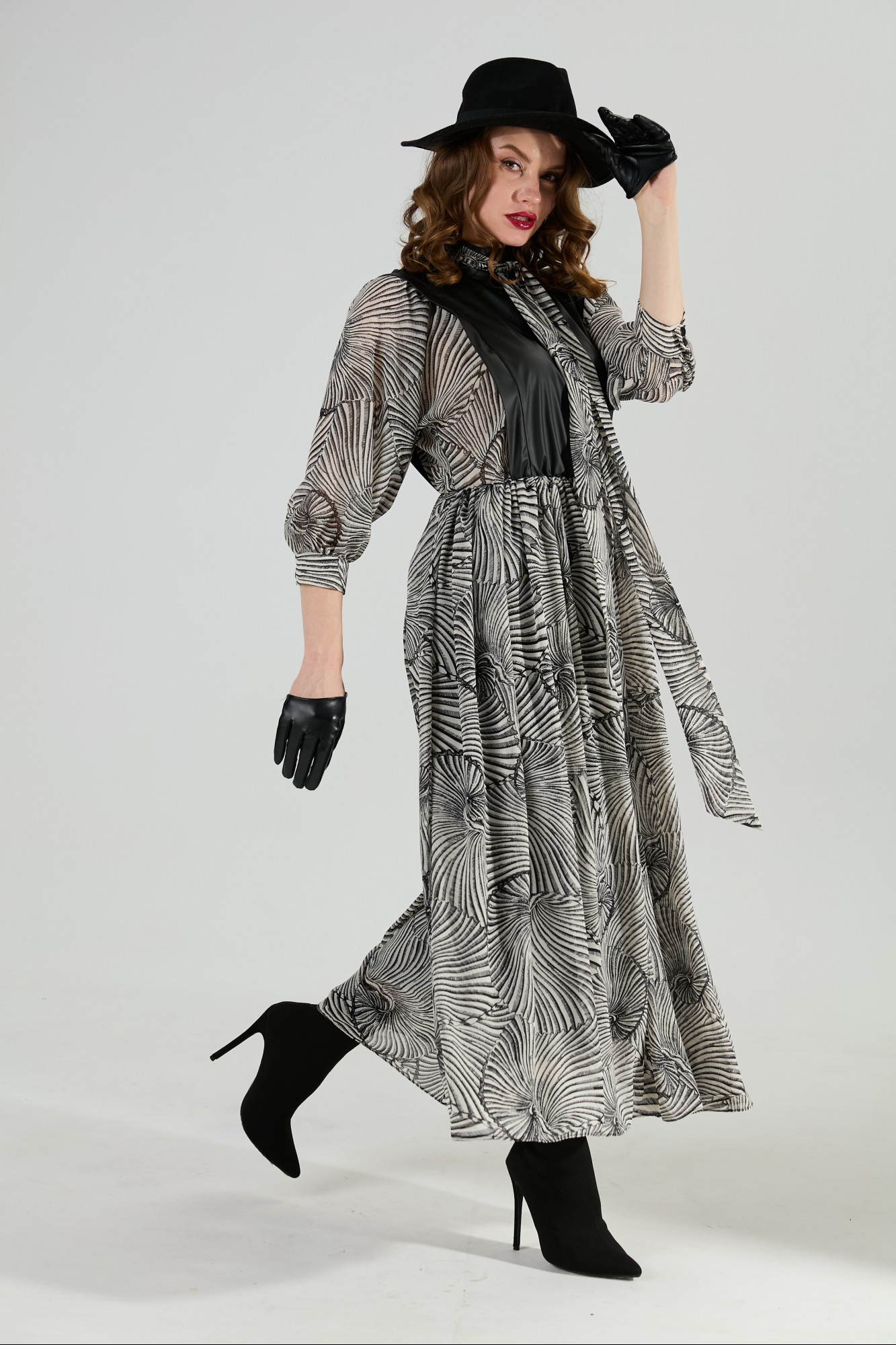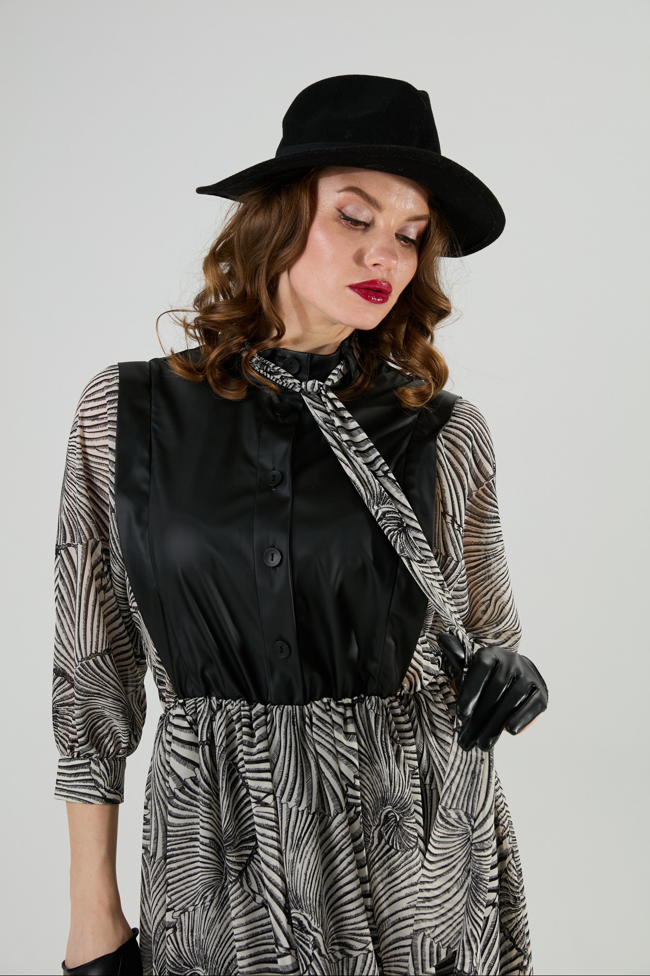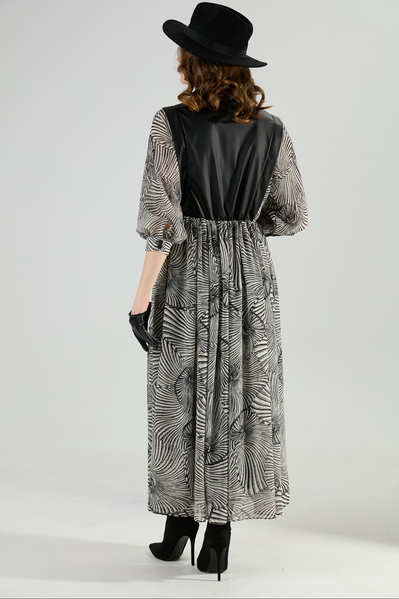 Платье комбинированное длиной макси, отрезное по линии талии с цельнокроеными рукавами. Застежка центральная с цельнокроеными планками на петли и пуговицы. Верхние части переда и спинки с вертикальными рельефами, начинающимися от линии плеча. Бантовая складка расположена по центру, боковые складки направлены от центра изделия в сторону бокового шва. Рукав цельнокроеный с боковыми частями переда и спинки с углубленной до линии талии проймой. По центру оката рукава сборка. Нижний срез рукава обработан притачной манжетой. Застежка манжеты на петли и пуговицы. Платье по линии талии собрано на резинку. Горловина изделия круглой формы, обработана воротником-стойкой, с застежкой на петли и пуговицы. Платье дополнено съёмным бантом. Бант съёмный, продевается в шлевки, расположенные на воротнике-стойке. В комплект к изделию идёт ремень из экокожи.