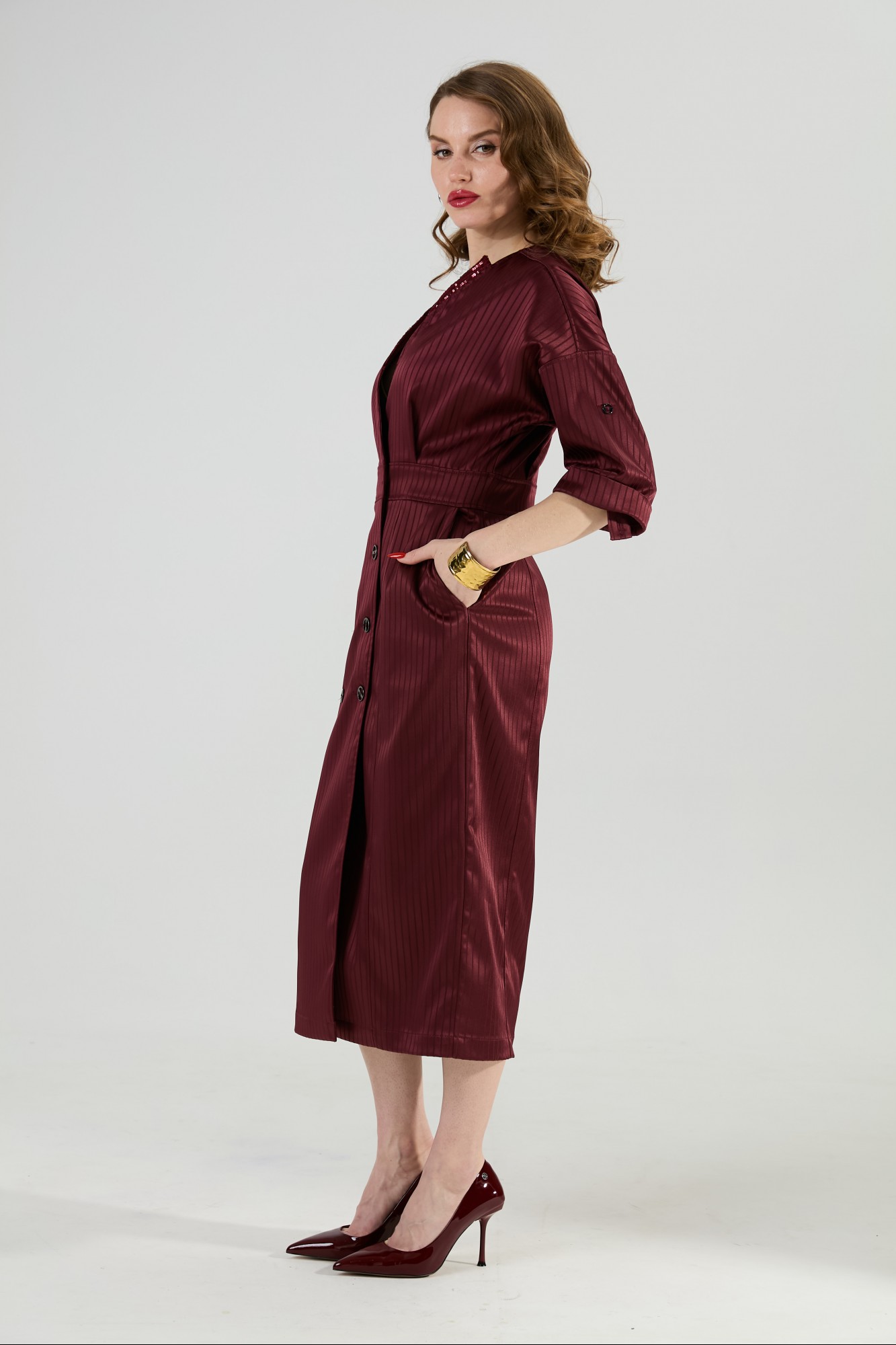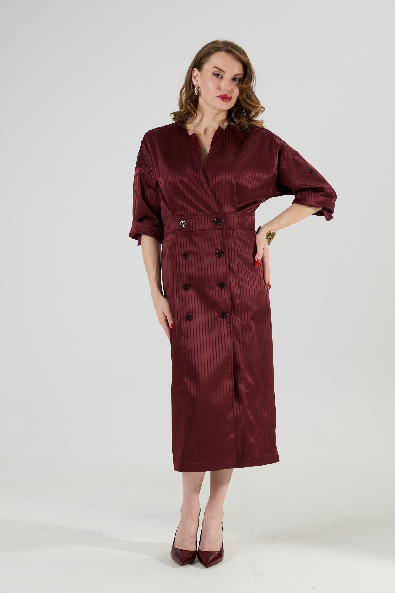 Эффектное двубортное платье длиной миди полуприлегающего силуэта. Линия плеча приспущена, рукав втачной три четверти с манжетой и патой. Горловина обработана обтачкой с V-образным вырезом, декорирована пайетками. Линия талии акцентирована притачным поясом. Имеются карманы в боковых швах. Изделие застёгивается на пуговицы. Без подкладки.