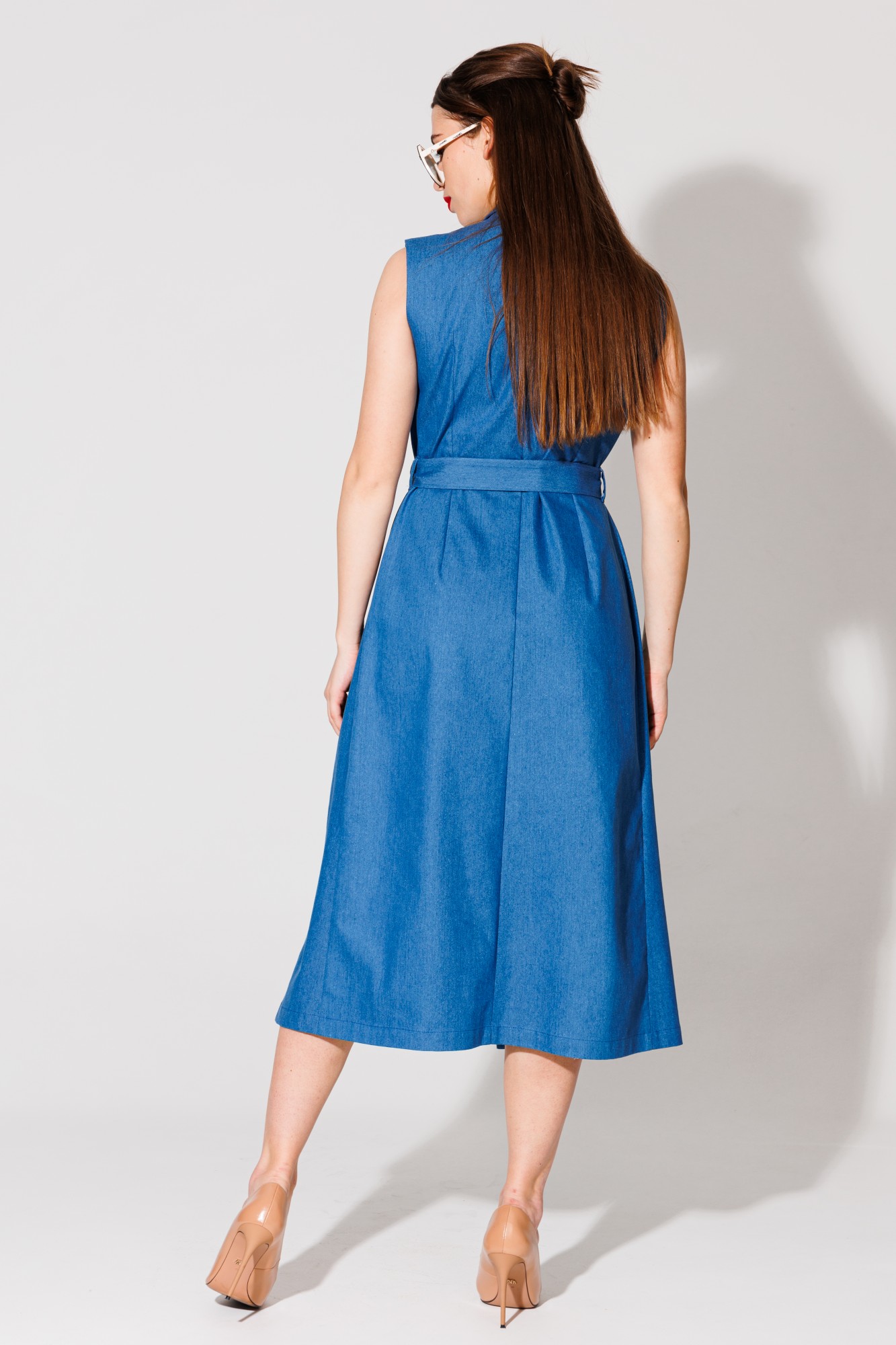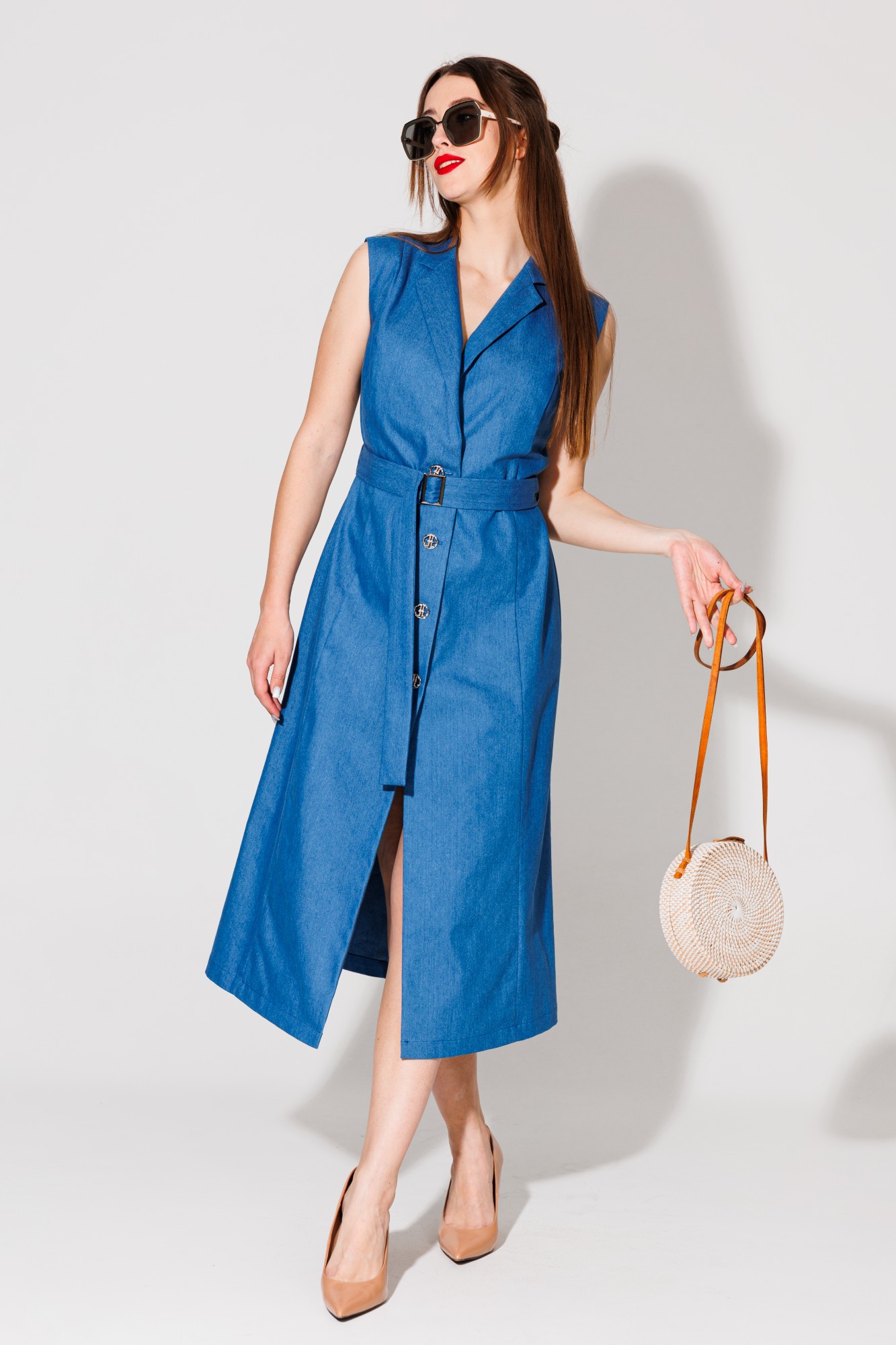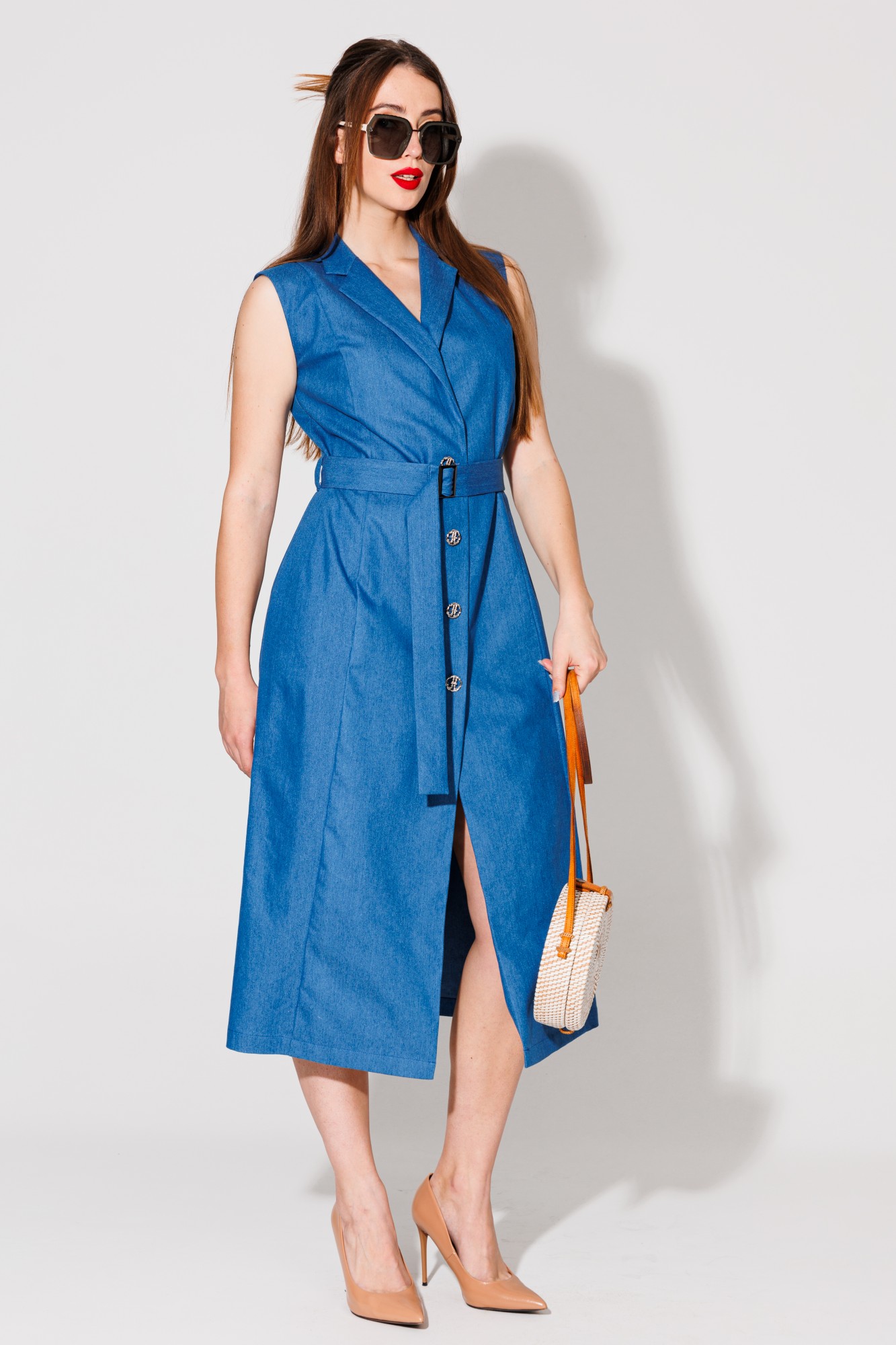 Платье-жилет макси полуприлегающей силуэтной формы без рукавов. Полочка со смещённым бортовым краем назапах, с рельефными швами от линии плеча до низа. Застежка на петли и пуговицы. Спинка со средним швом и талиевыми вытачками. Воротник отложной с отрезной стойкой. В комплект входит пояс из основной ткани с отделочной пряжкой. Идеально комплектуется с брюками в качестве удлиненного жилета.