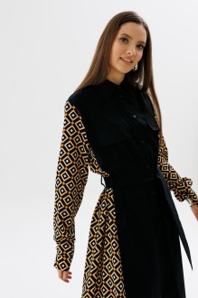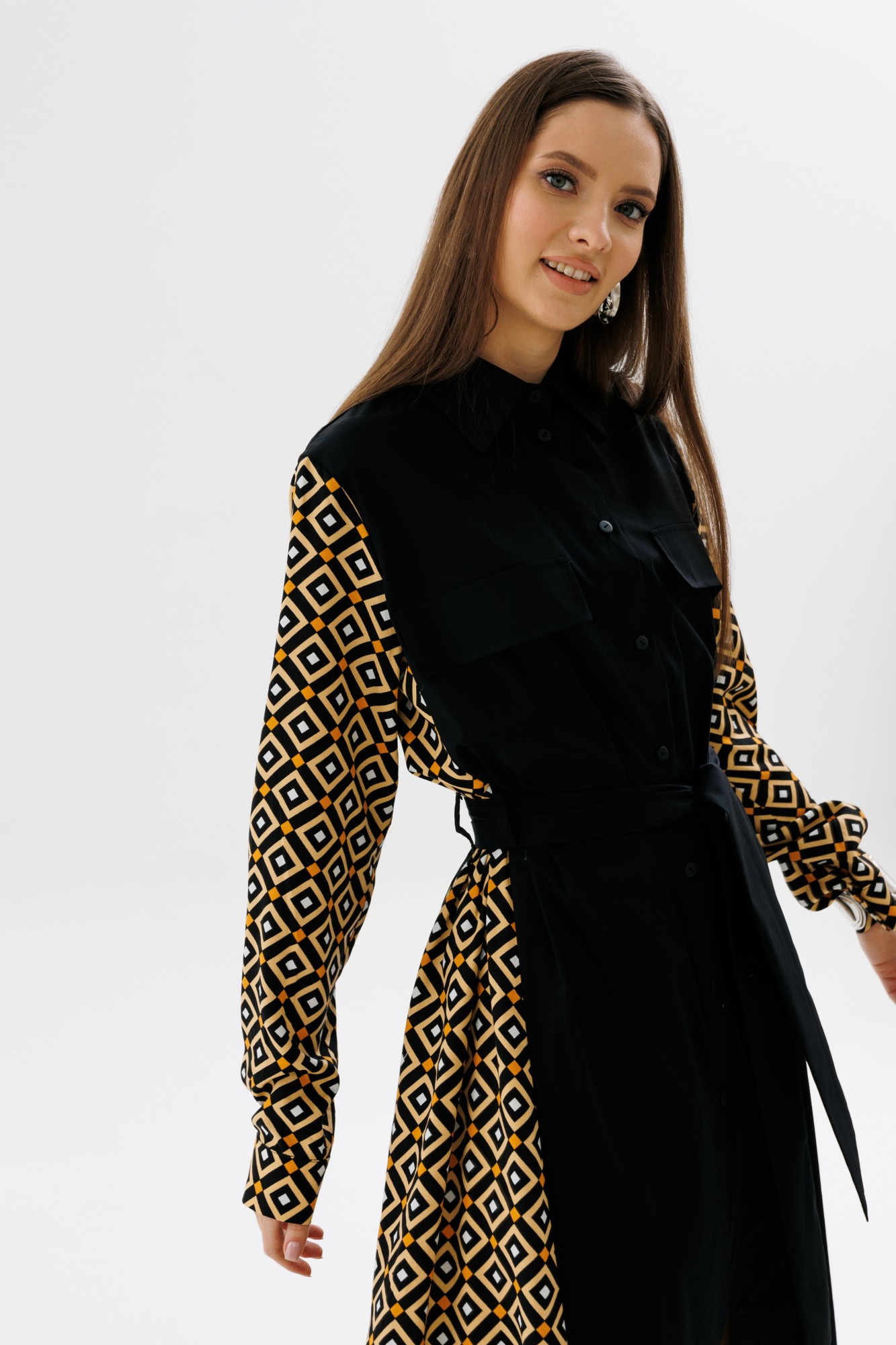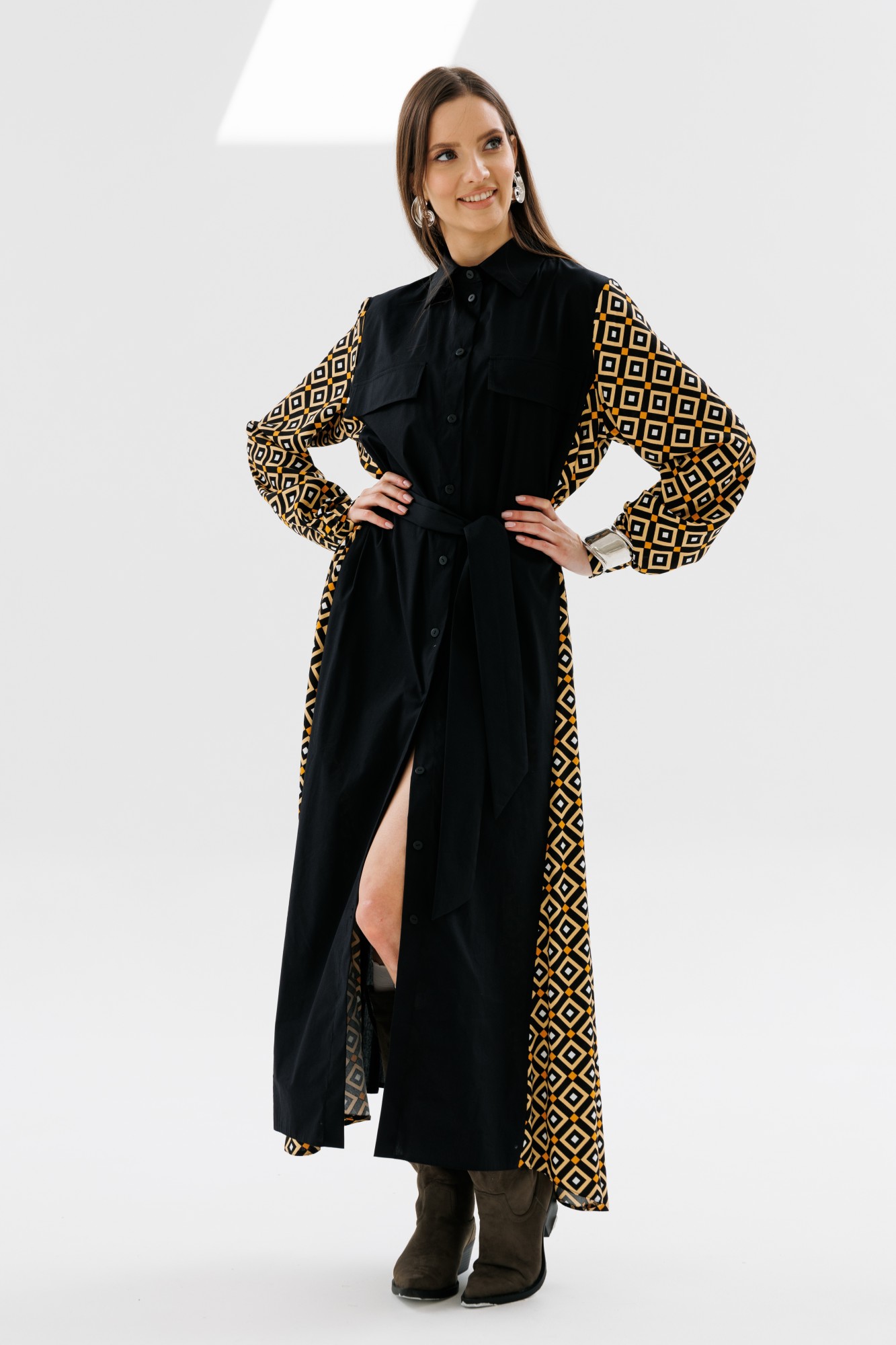 Классическое платье-рубашка прямого кроя в пол. Воротник отложной на стойке. Линия плеча немного приспущена. По груди расположены клапаны. Застёжка центральная на петли и пуговицы. Объёмный рукав с манжетой. Фигурные боковые вставки и рукава из отделочной ткани. Пояс из основной ткани входит в комплект.