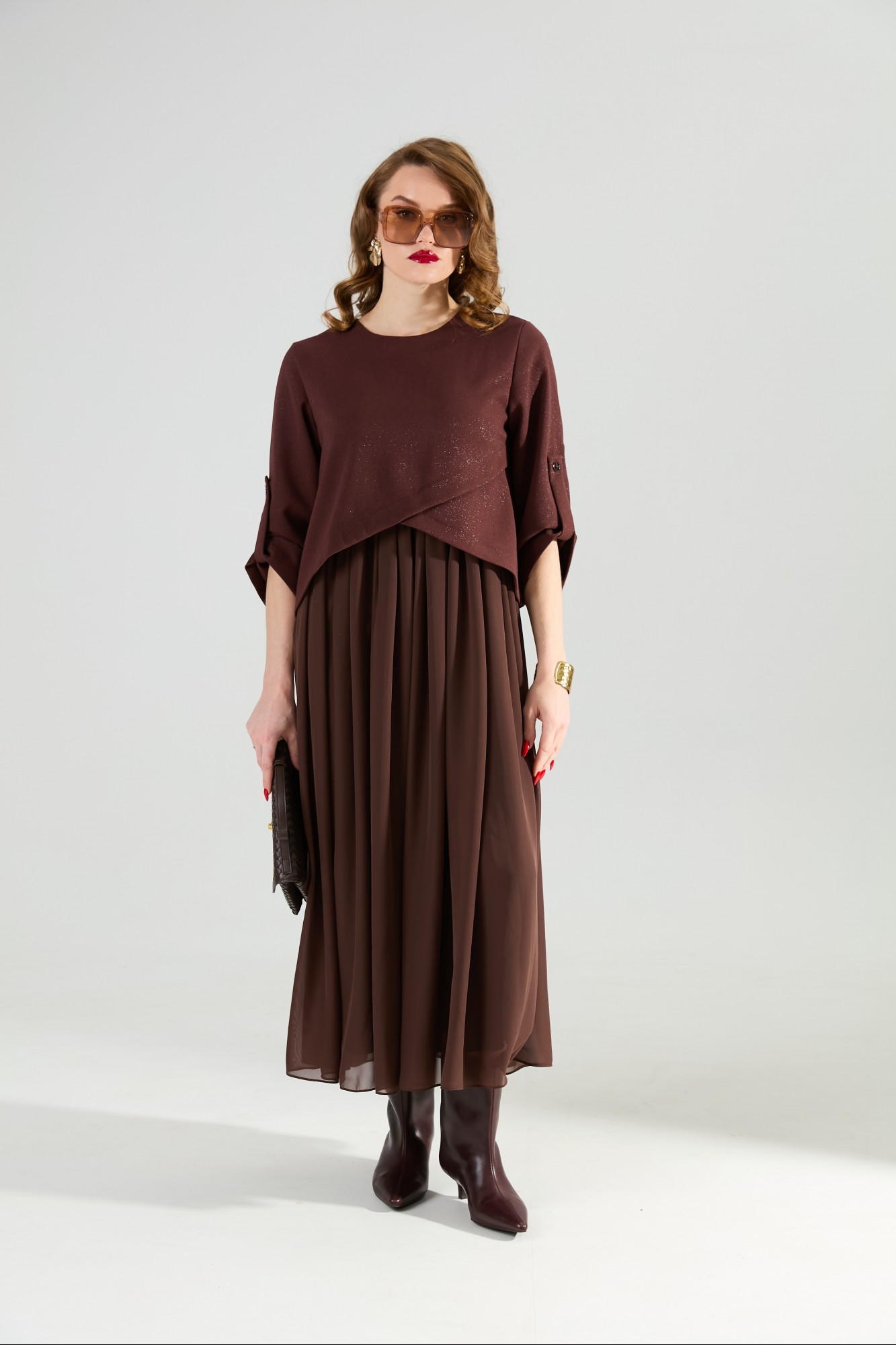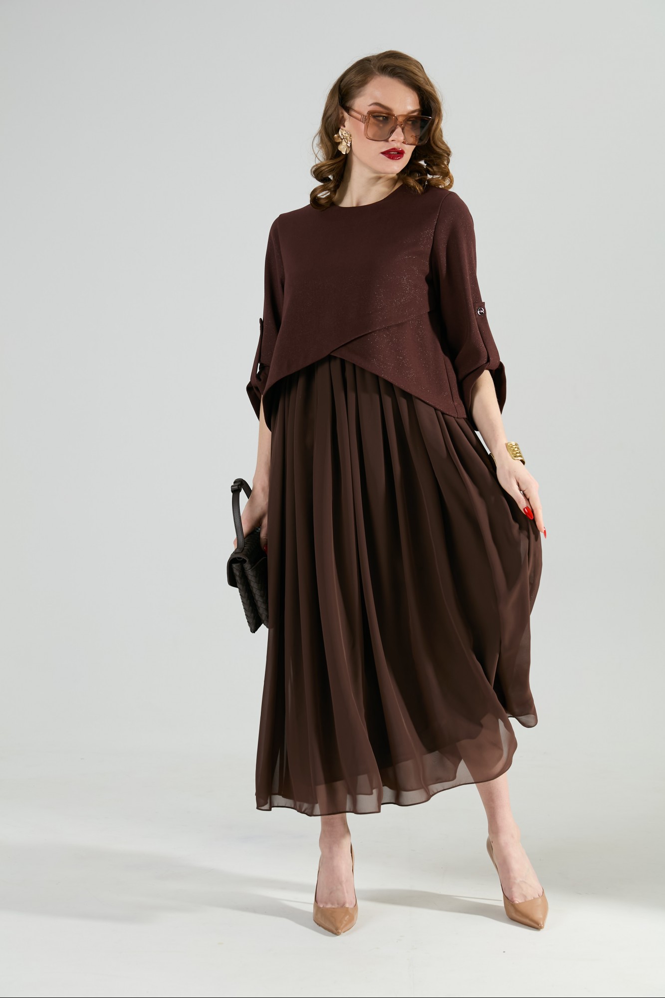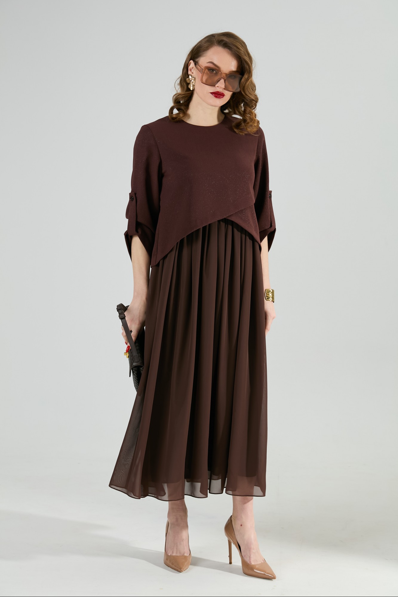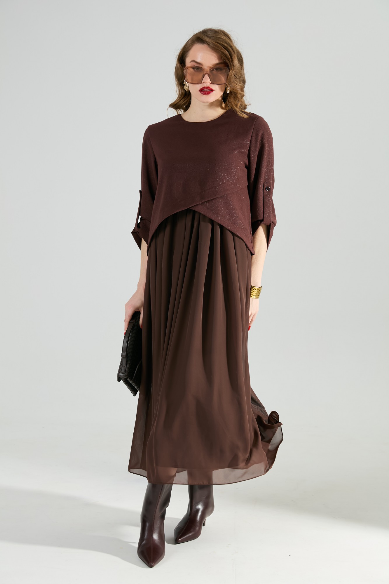 Платье макси комбинированное, двухцветное. Лиф фигурный по низу. Вырез горловины полукруглый, по спинке заcтежка на молнию. Рукава втачные на патах. Юбка на резинке, драпирующаяся, расширенного силуэта из шифона. На подкладке.
