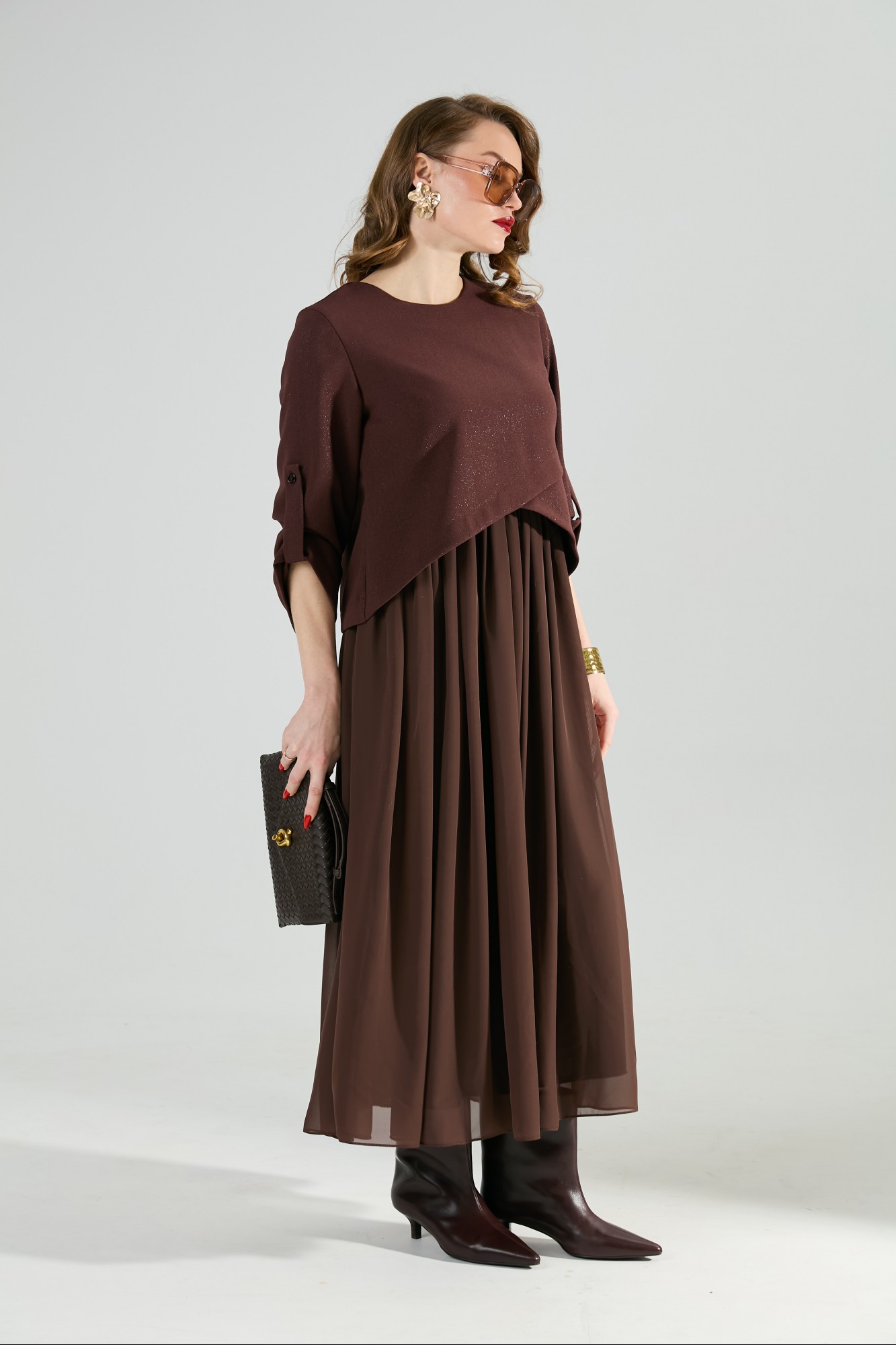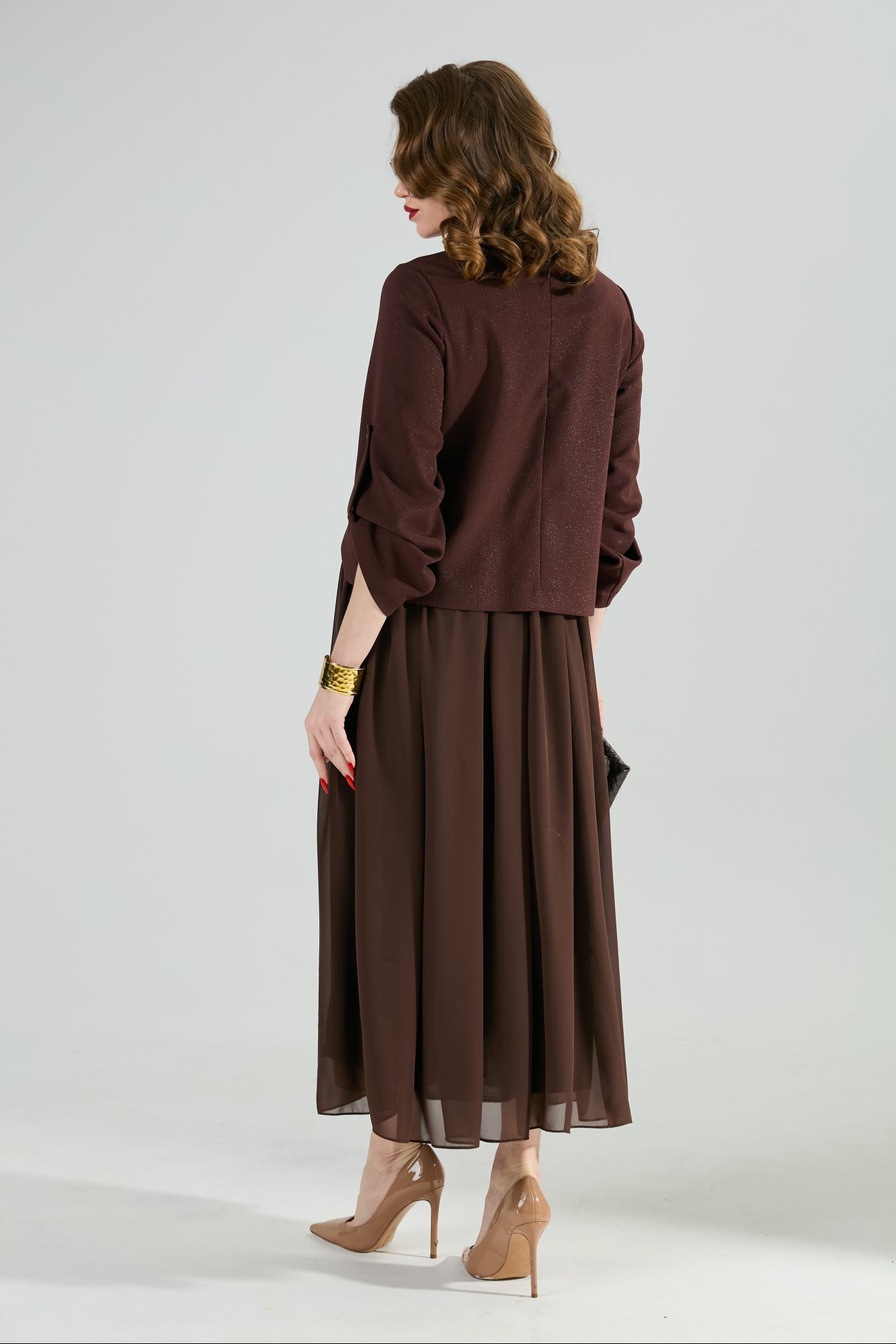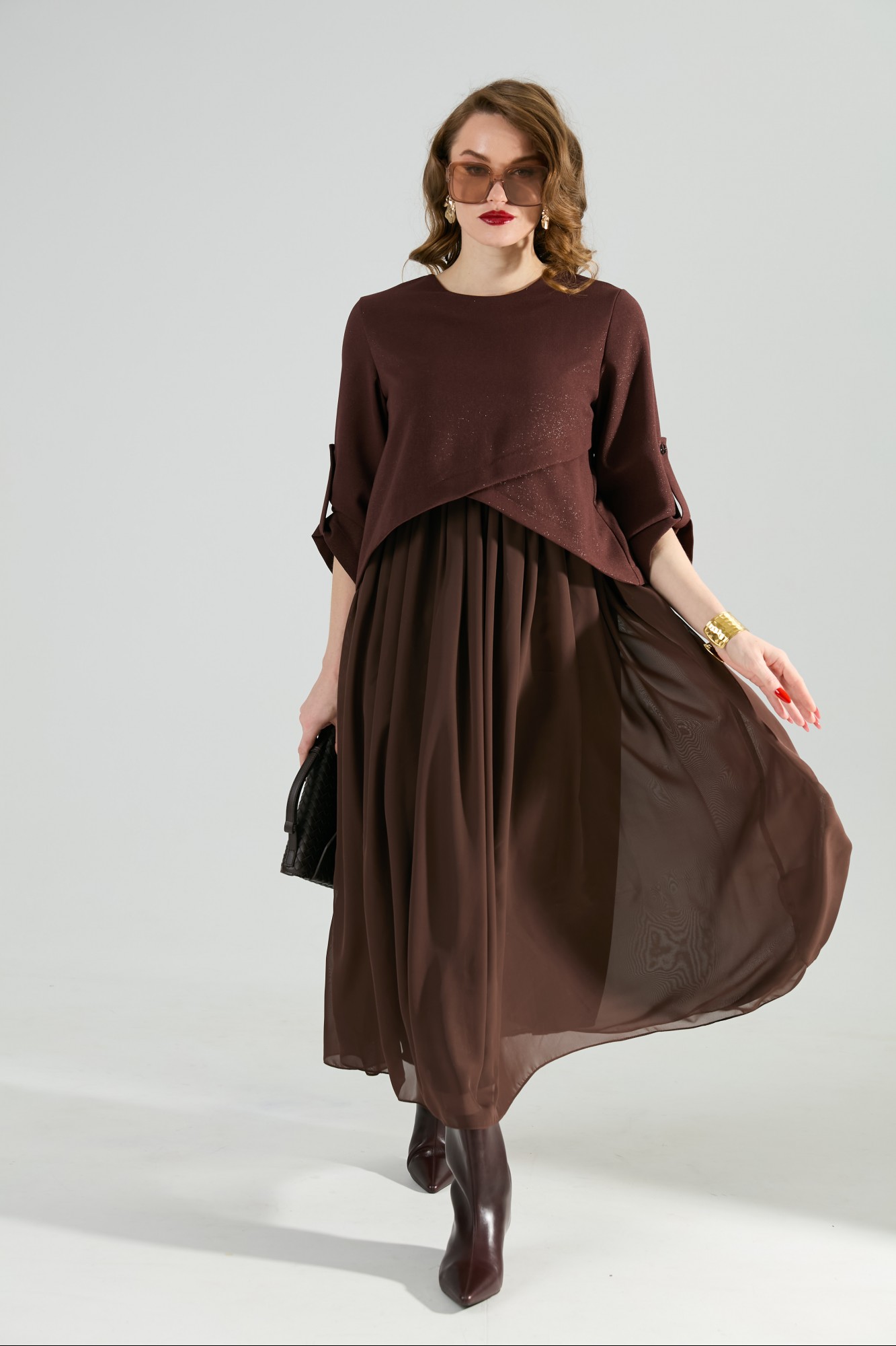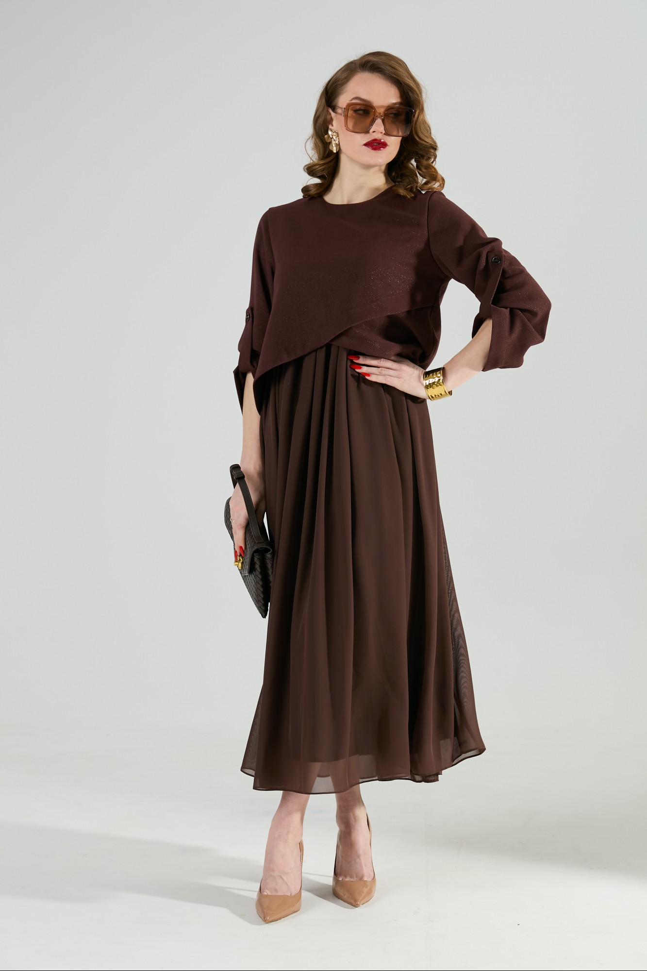 Платье макси комбинированное, двухцветное. Лиф фигурный по низу. Вырез горловины полукруглый, по спинке заcтежка на молнию. Рукава втачные на патах. Юбка на резинке, драпирующаяся, расширенного силуэта из шифона. На подкладке.