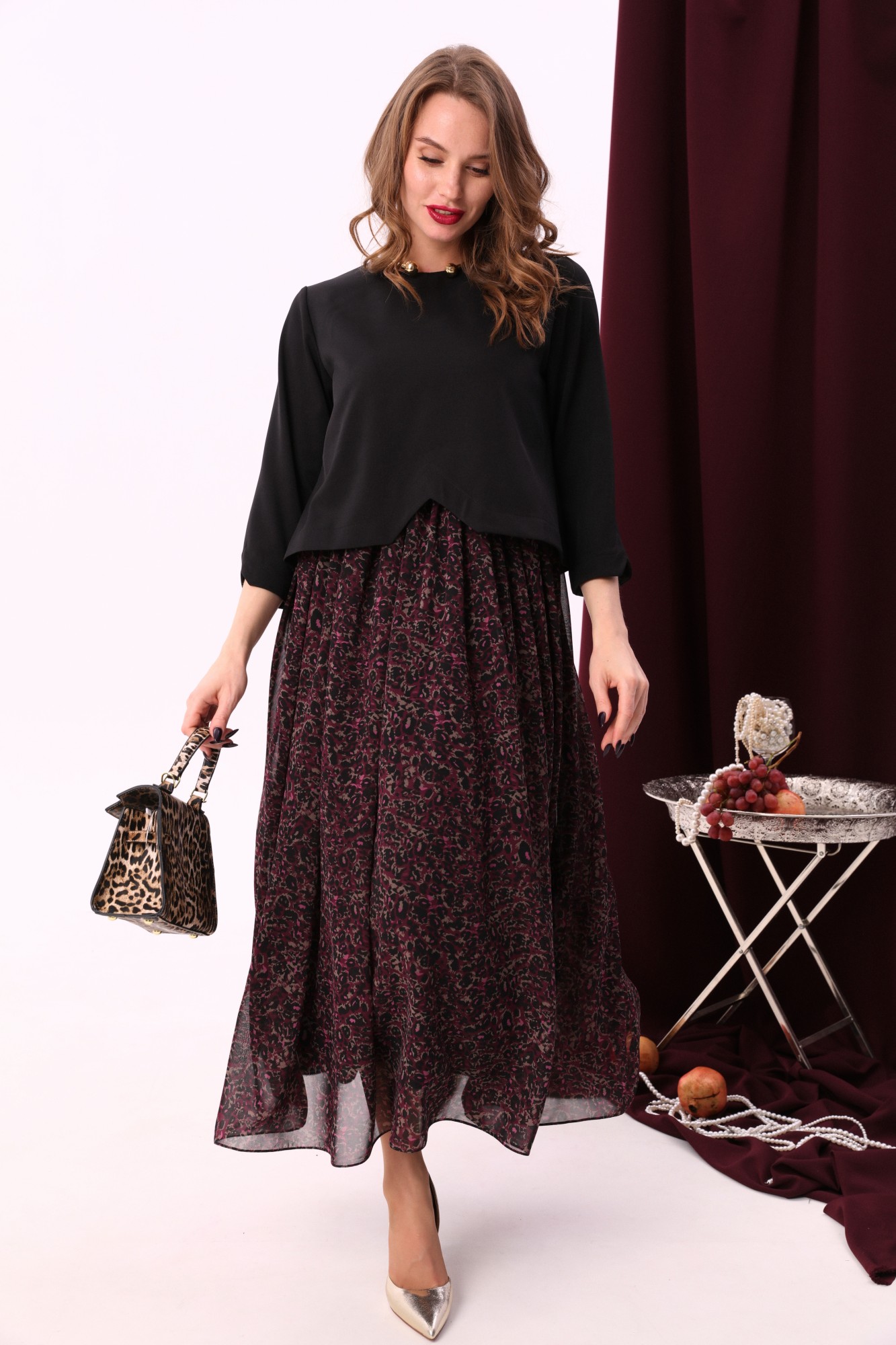 Платье макси комбинированное, двухцветное. Лиф фигурный по низу, выполнен из костюмной ткани. Вырез горловины полукруглый, по спинке затежка на молнию. Рукава втачные. Юбка на резинке, драпирующаяся, расширенного силуэта из шифона. На подкладке.