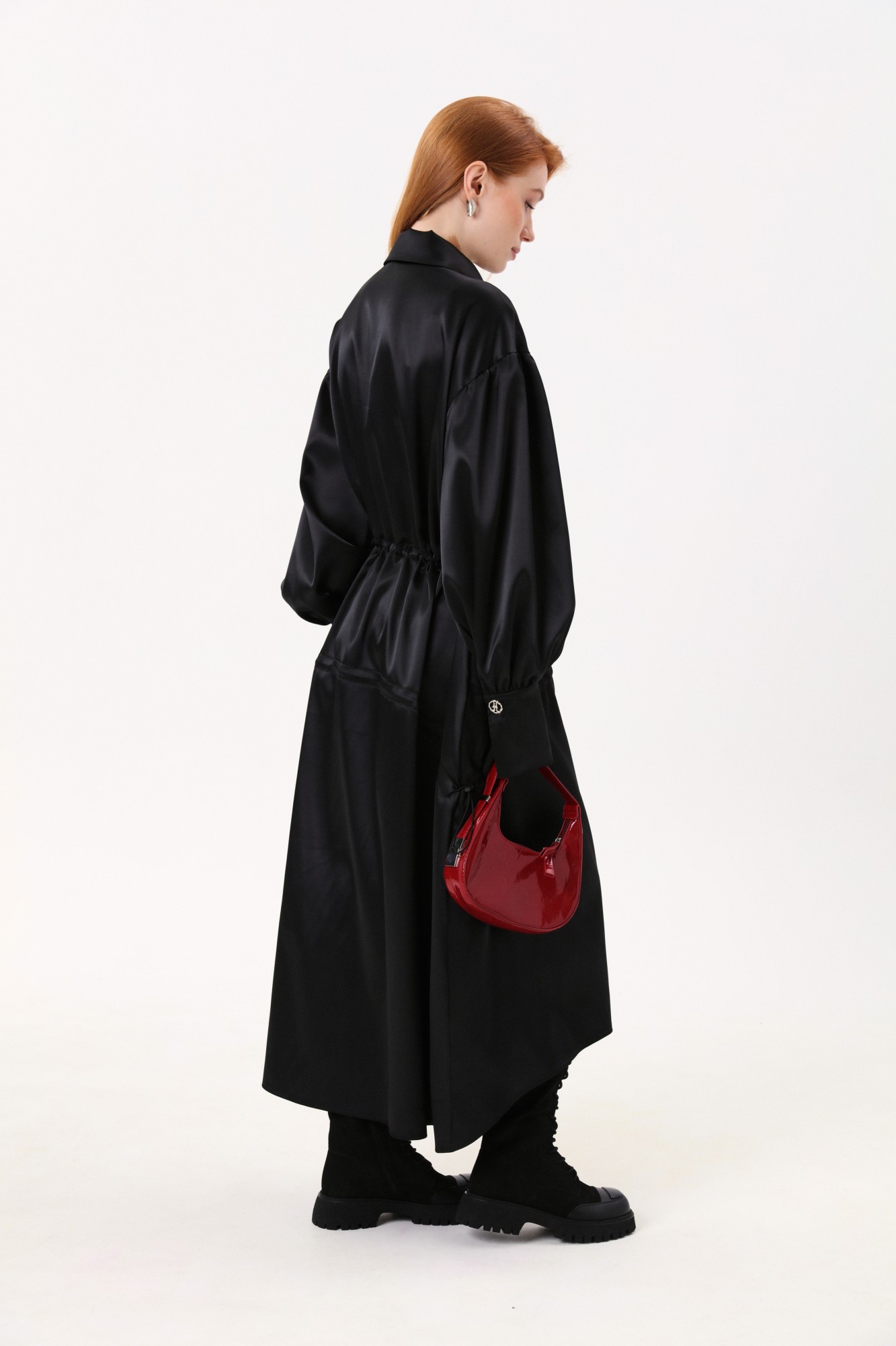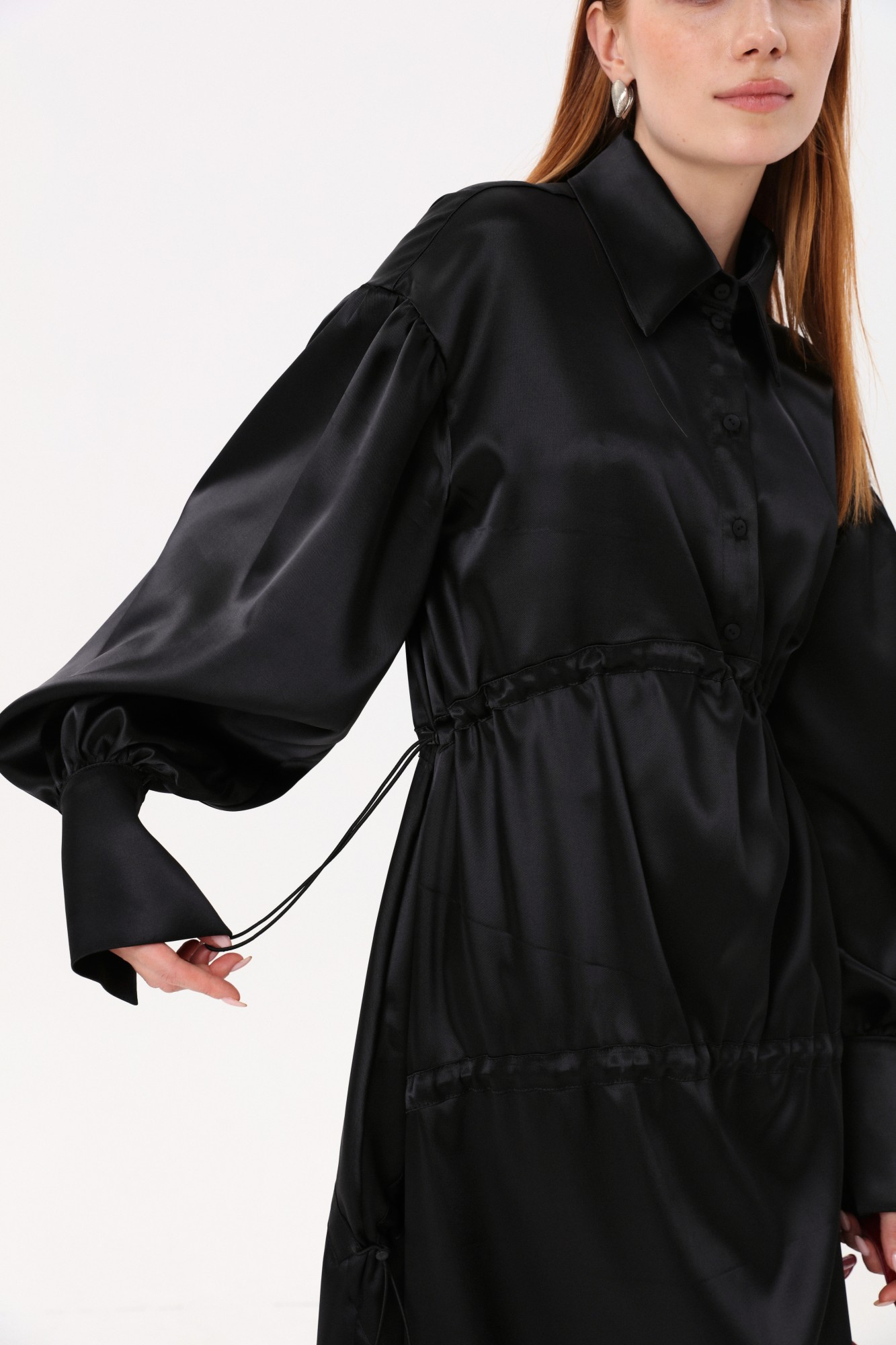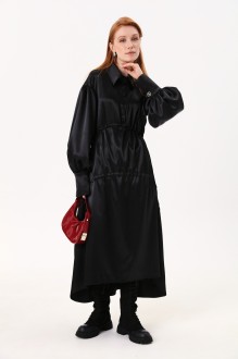 Платье прямого свободного кроя длиной миди, отрезное выше линии талии с двумя настрочными фигурными кулисами по переду и спинке. В кулисы вставлена шляпная резинка с фиксаторами по бокам. Воротник стояче-отложной рубашечного типа. Центральная застёжка на петли и пуговицы. Рукав втачной со сборкой по окату. Фигурная линия низа. В комплект входит деталь, имитирующая жилет. Фиксируется на декоративную тесьму и полукольца. Фурнитура может отличаться от фото.