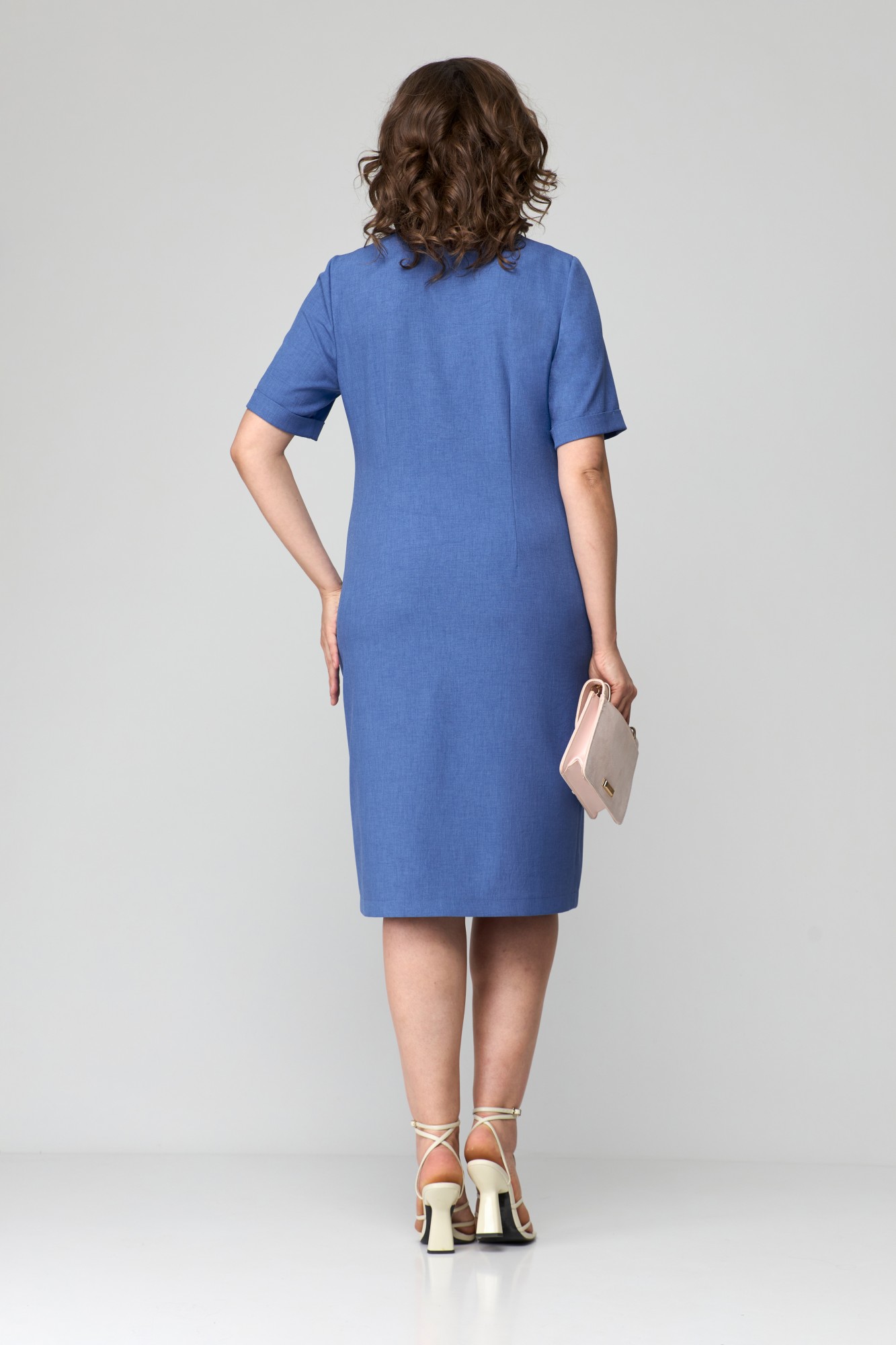 Платье женское, полуприлегающего силуэта, втачного покроя с центрально-бортовой застежкой на притачную планку на петли-пуговицы до линии талии. Рукав короткий, с манжетой, горловина округлой формы. По переду платье ассиметричное: в левой части переда расположена отлетная кокетка до уровня талии с деталями в области плеча из отделочной ткани, в правой части в области бедер расположен накладной карман. Дополнением платья служат пуговицы в цвет отделки.