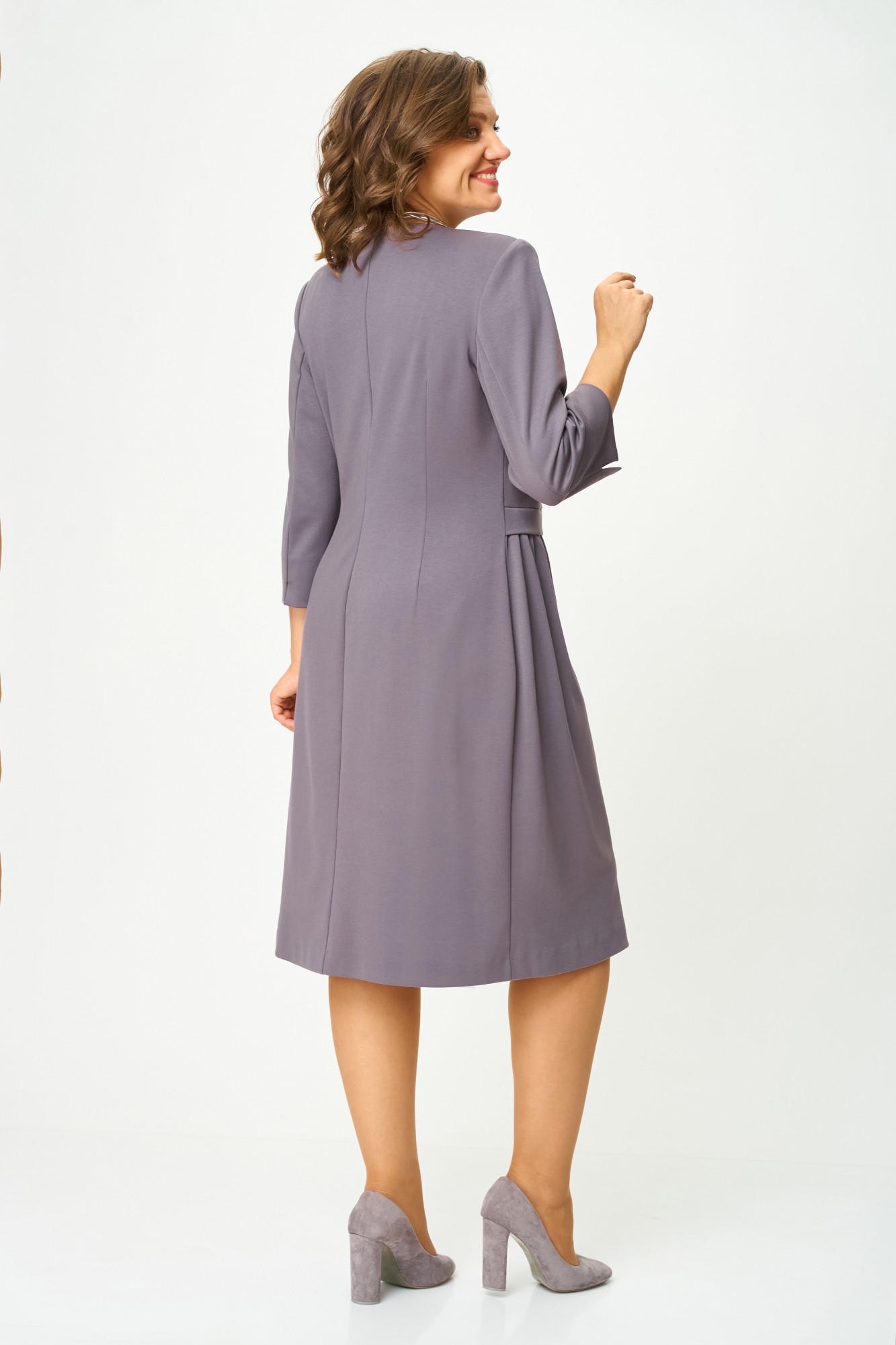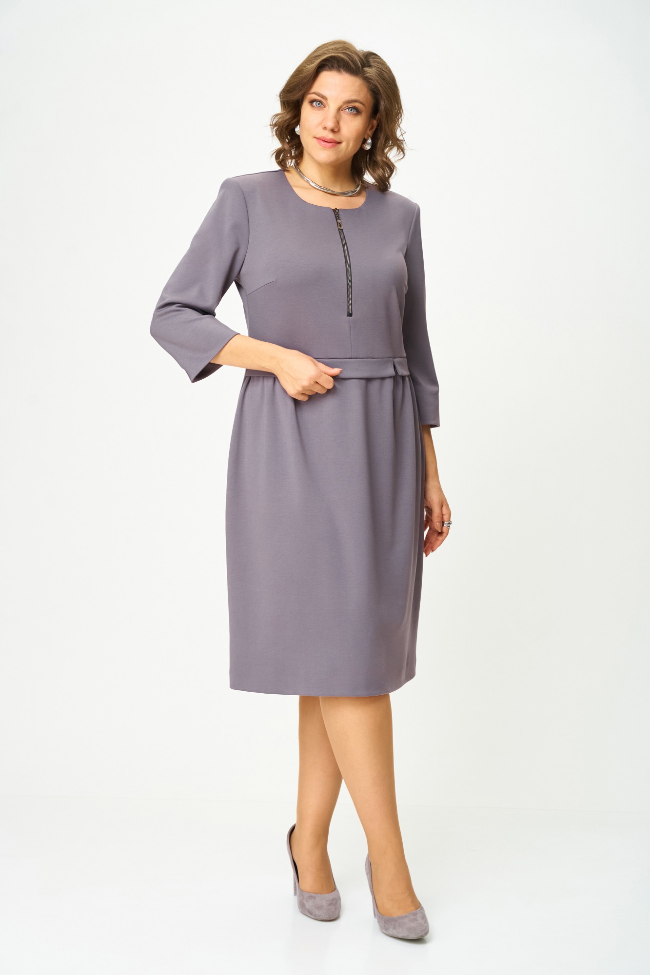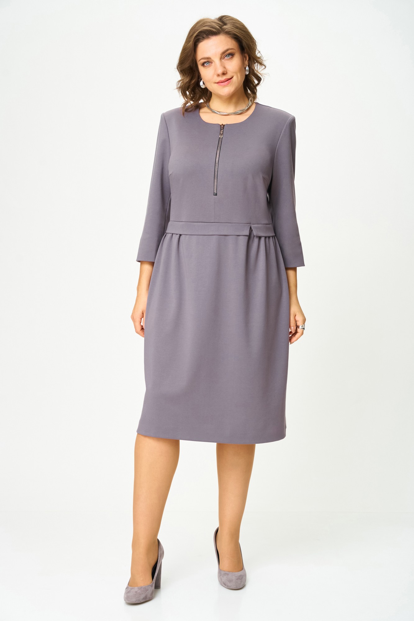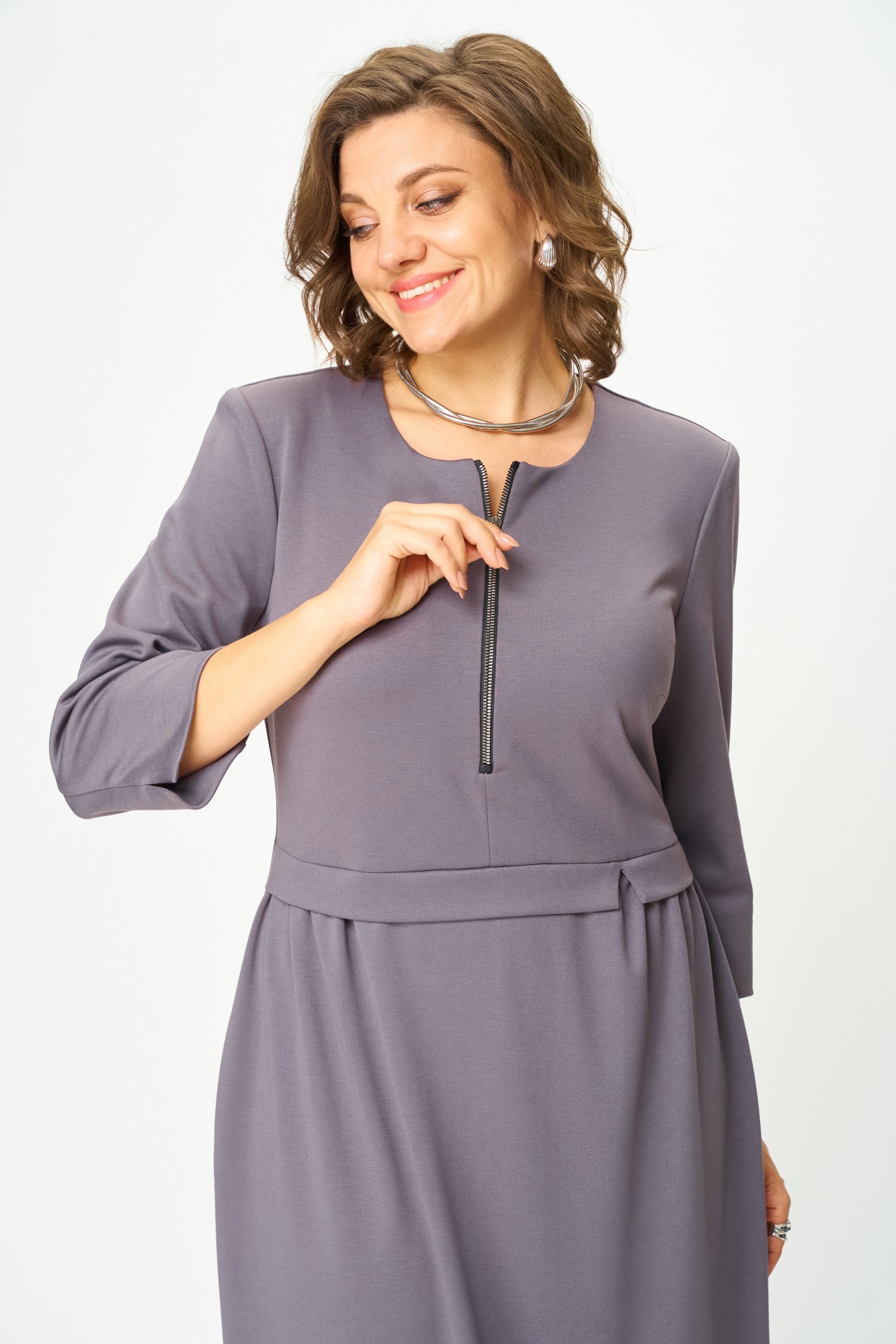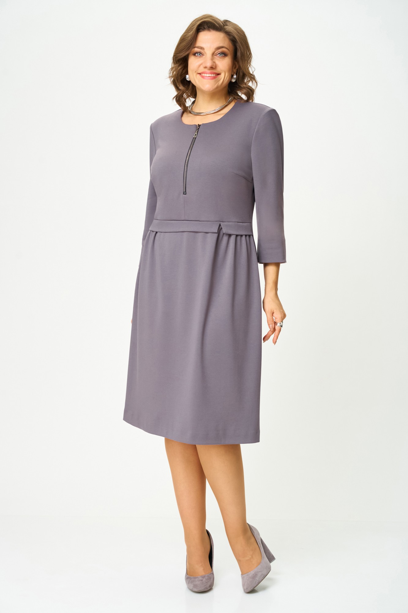 Платье женское полуприлегающего силуэта, втачного покроя рукава, выполнено из трикотажного полотна. По переду платье отрезное по линии талии, в шов вставлена горизонтальная планка, с уголком в левой части. Нижняя часть переда на сборке в боковых частях. Верхняя часть переда со швом по центру, в который вставлена отделочная молния, а так же с нагрудными вытачками из боковых швов. Горловина округлой формы. Спинка со средним швом и таллиевыми вытачками. Рукав ¾ двухшовный, с небольшим разрезом по локтевому шву.