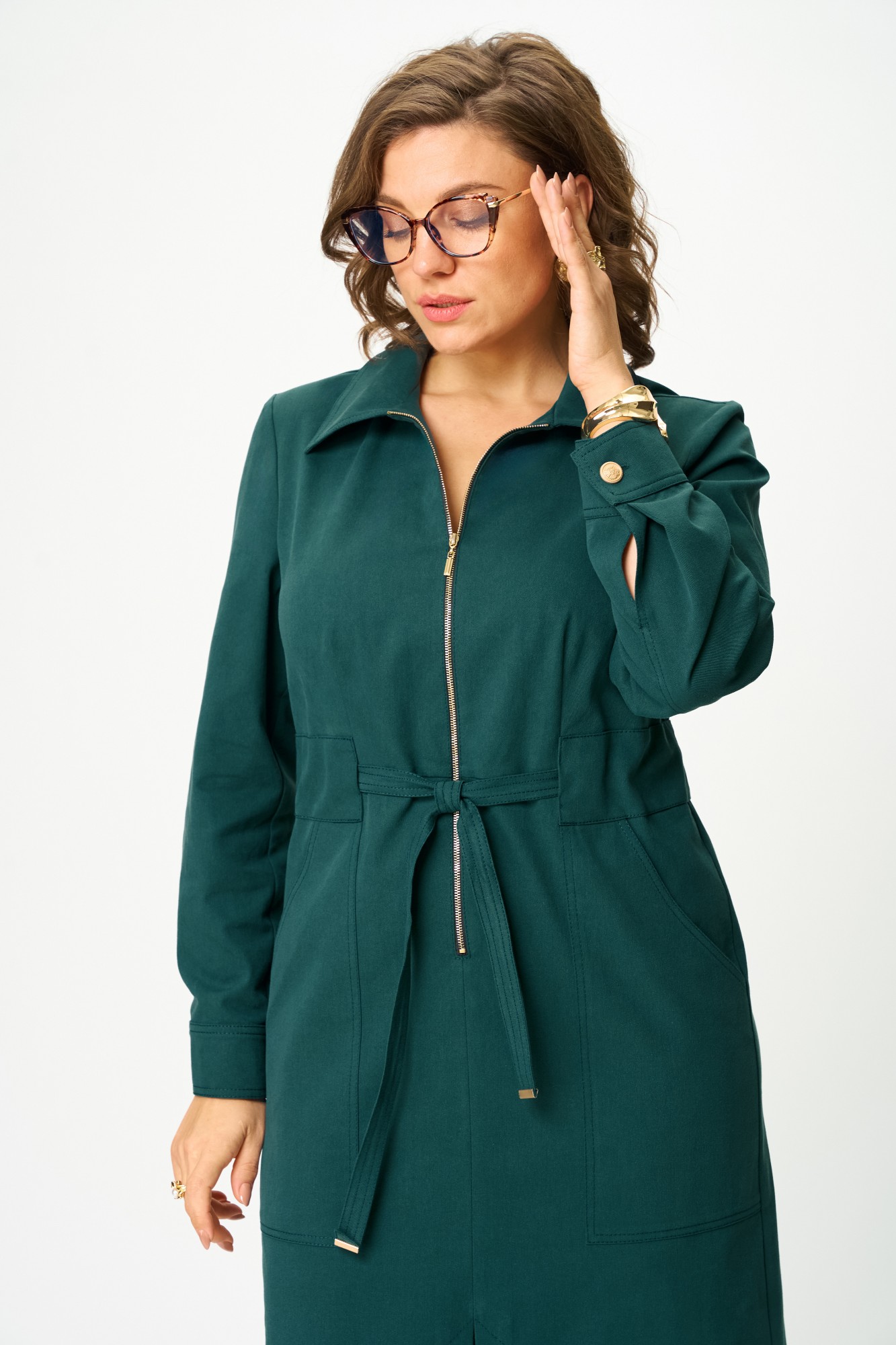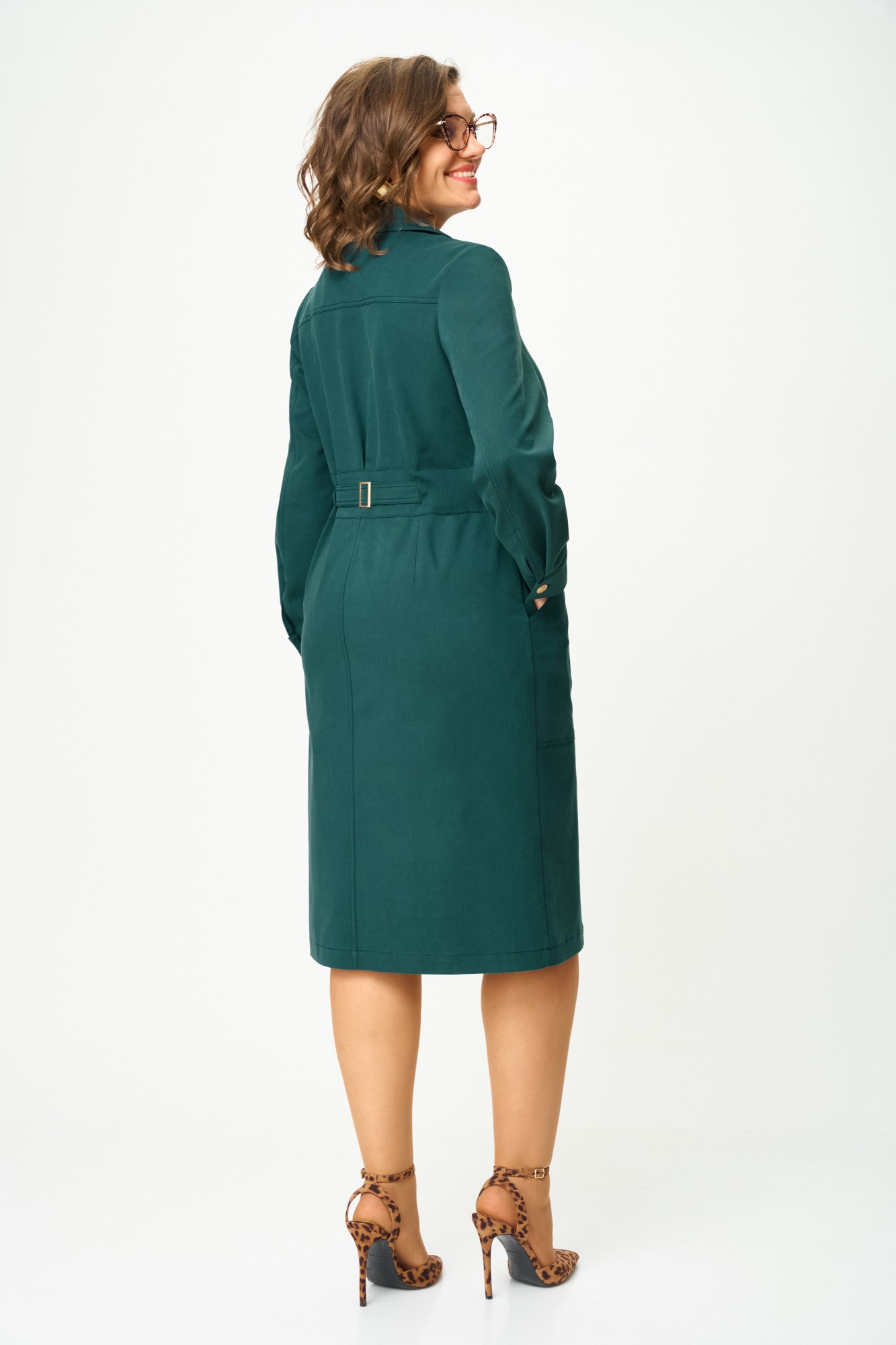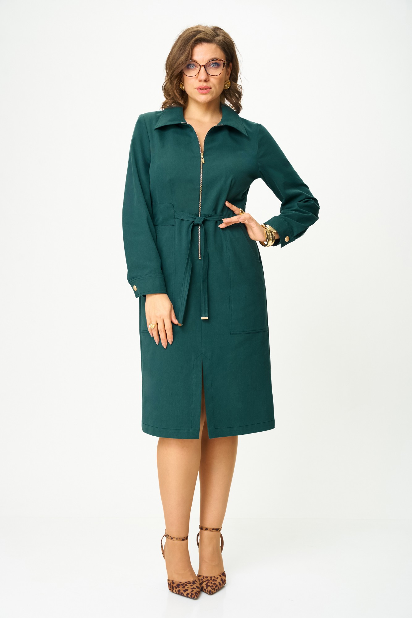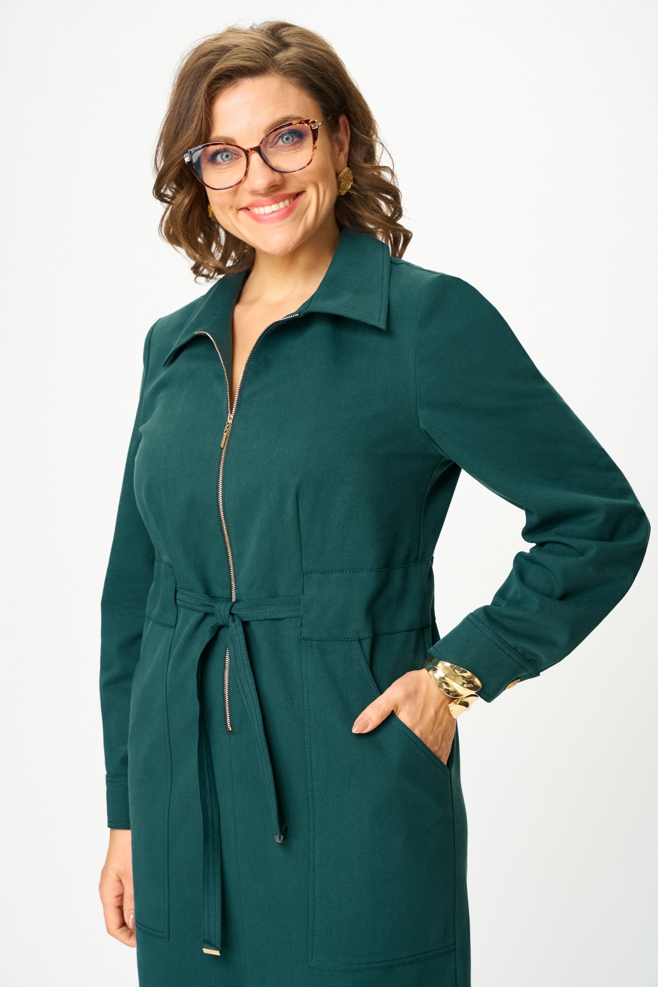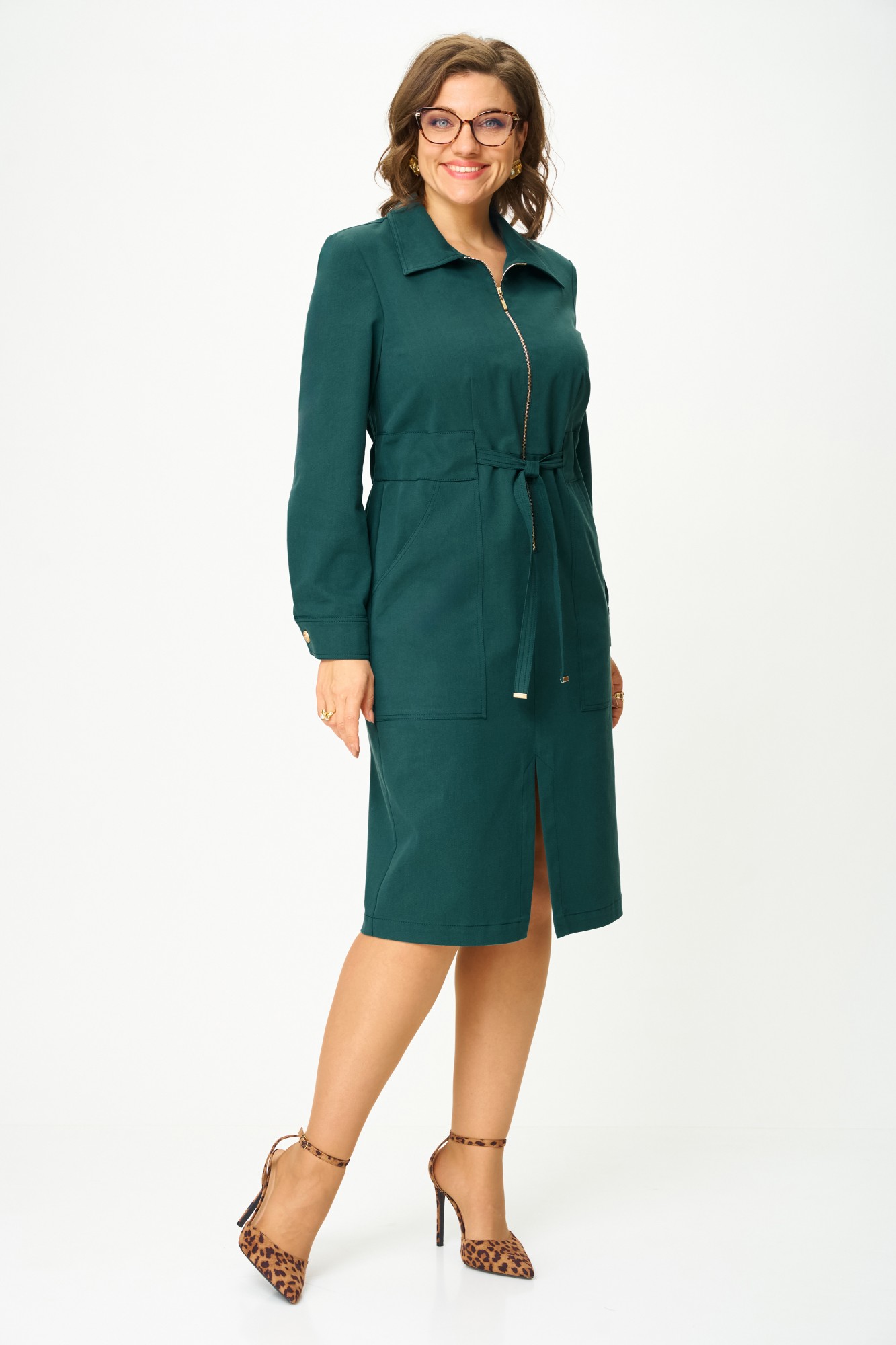 Платье женское, полуприлегающего силуэта, втачного покроя рукава, выполнено из джинсовой ткани. По центру переда вставлена отделочная молния, внизу разрез. Перед отрезной по линии талии, в нижней части с накладными карманами, сверху с нагрудной вытачкой снизу вверх. Спинка так же отрезная по линии талии, нижняя часть со средним швом и таллиевыми вытачками, верхняя часть со встречной складкой на уровне талии и кокеткой. На уровне талии настрачивается деталь, через которую на спинке протягивается пояс с пряжкой, по переду пояс завязывается по центру. Рукав длинный, двухшовный, внизу с манжетой, застегивающейся на петлю-пуговицу.