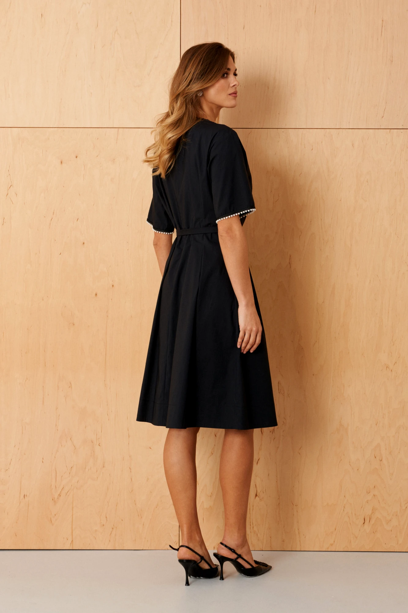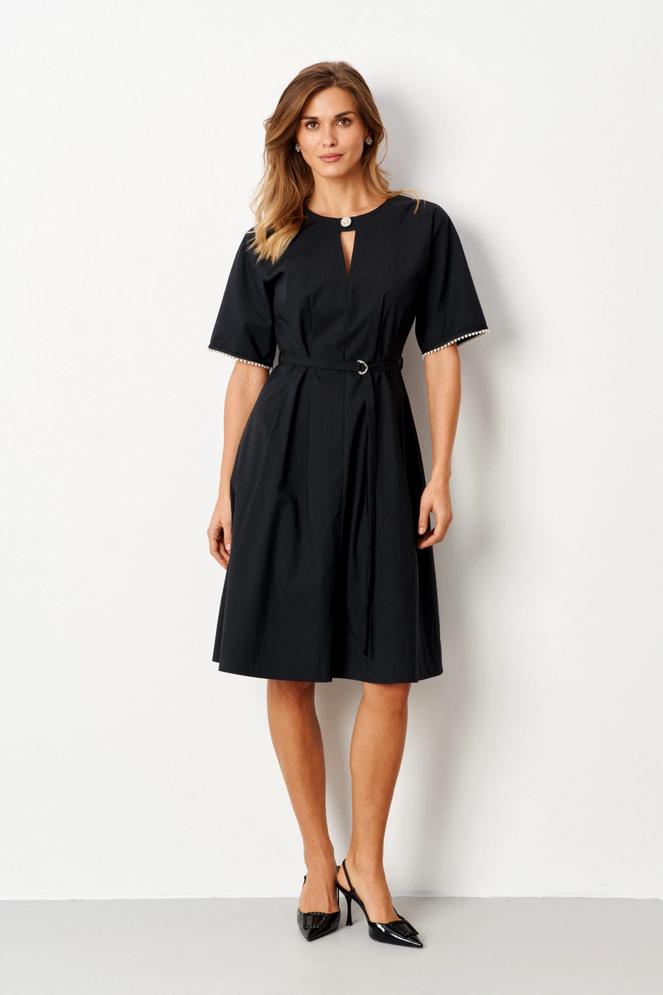Это женское повседневное платье из мягкой хлопковой ткани, выполненное в элегантном черном цвете. Модель обладает комфортным кроем и стильными деталями, идеально подходящими для ежедневной носки. Передняя часть украшена средним швом и изящными защипами, придающими образу слегка романтический и свежий вид. Спинка выполнена по аналогичной конструкции с средним швом и защипами, дополнена потайной молнией в среднем шве для удобства надевания. Горловина обрисована V-образным вырезом, украшенной небольшой декоративной обтачкой и жемчужной пуговицей, что добавляет платью нотки изящества. Вырез оформлен округлой формой, создавая гармоничный и женственный силуэт. Рукава втачные, длиной на уровне локтя, низ украшен декоративной тесьмой с бусинами, что придает образу изящества и оригинальности. В боковых швах расположены шлевки и пояс, позволяющие подчеркнуть талию и дополнить образ стилем. Длина платья чуть ниже колена делает его универсальным вариантом для повседневной носки и создает аккуратный и современный внешний вид.