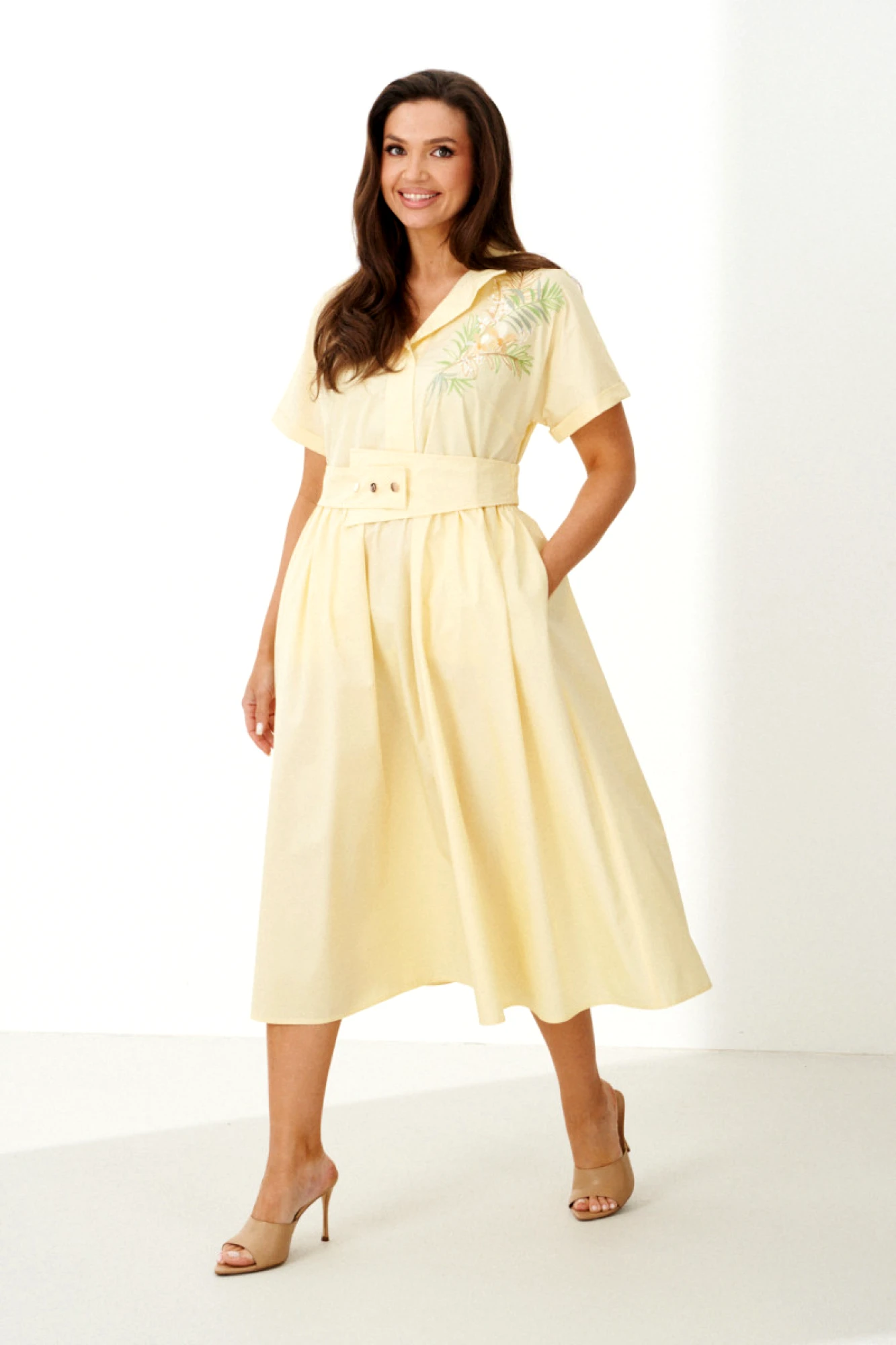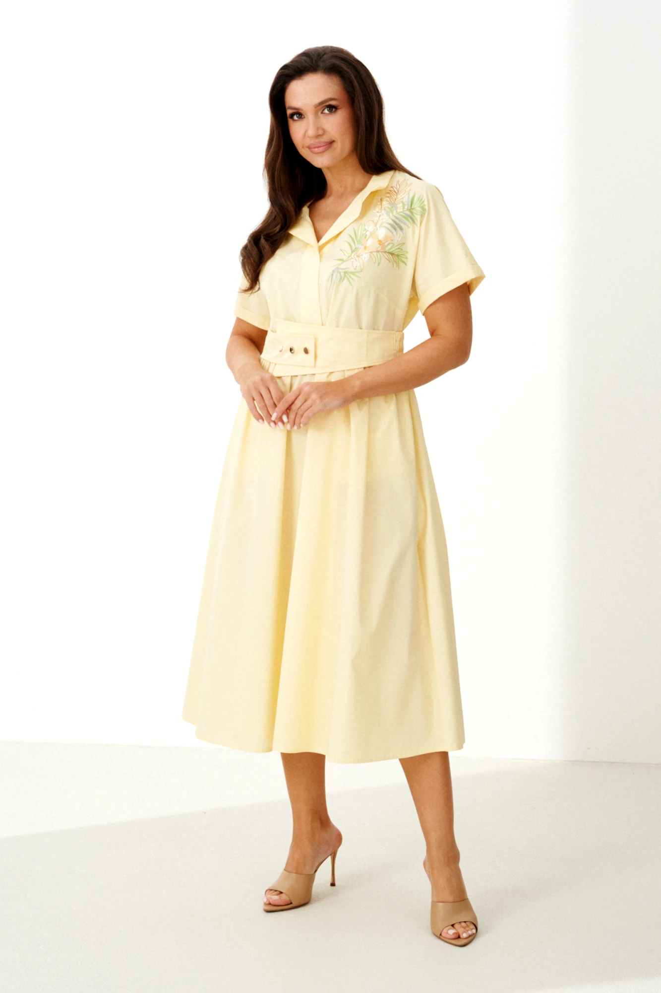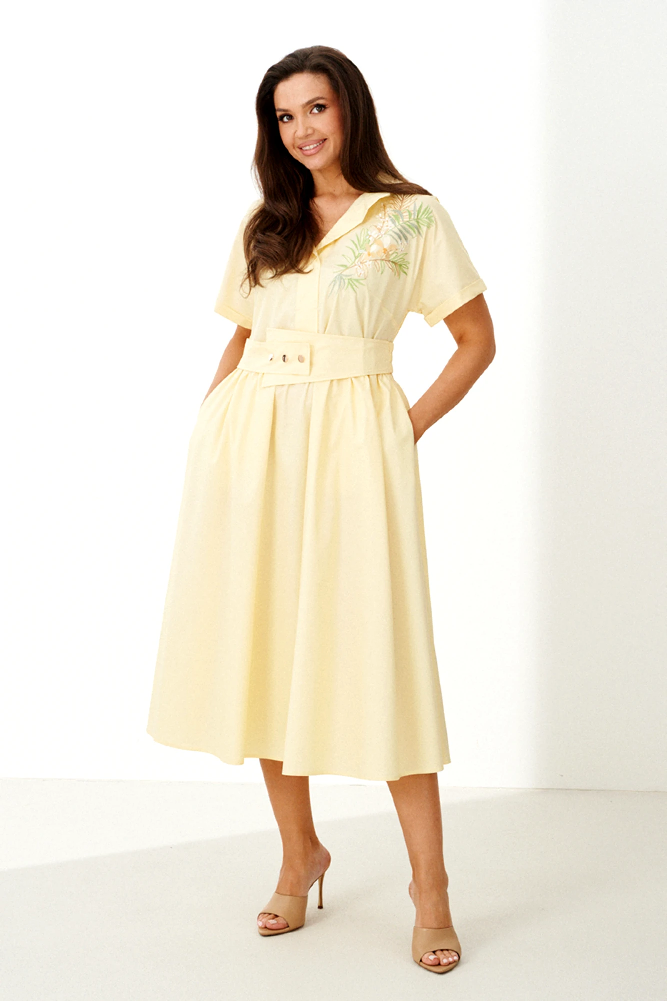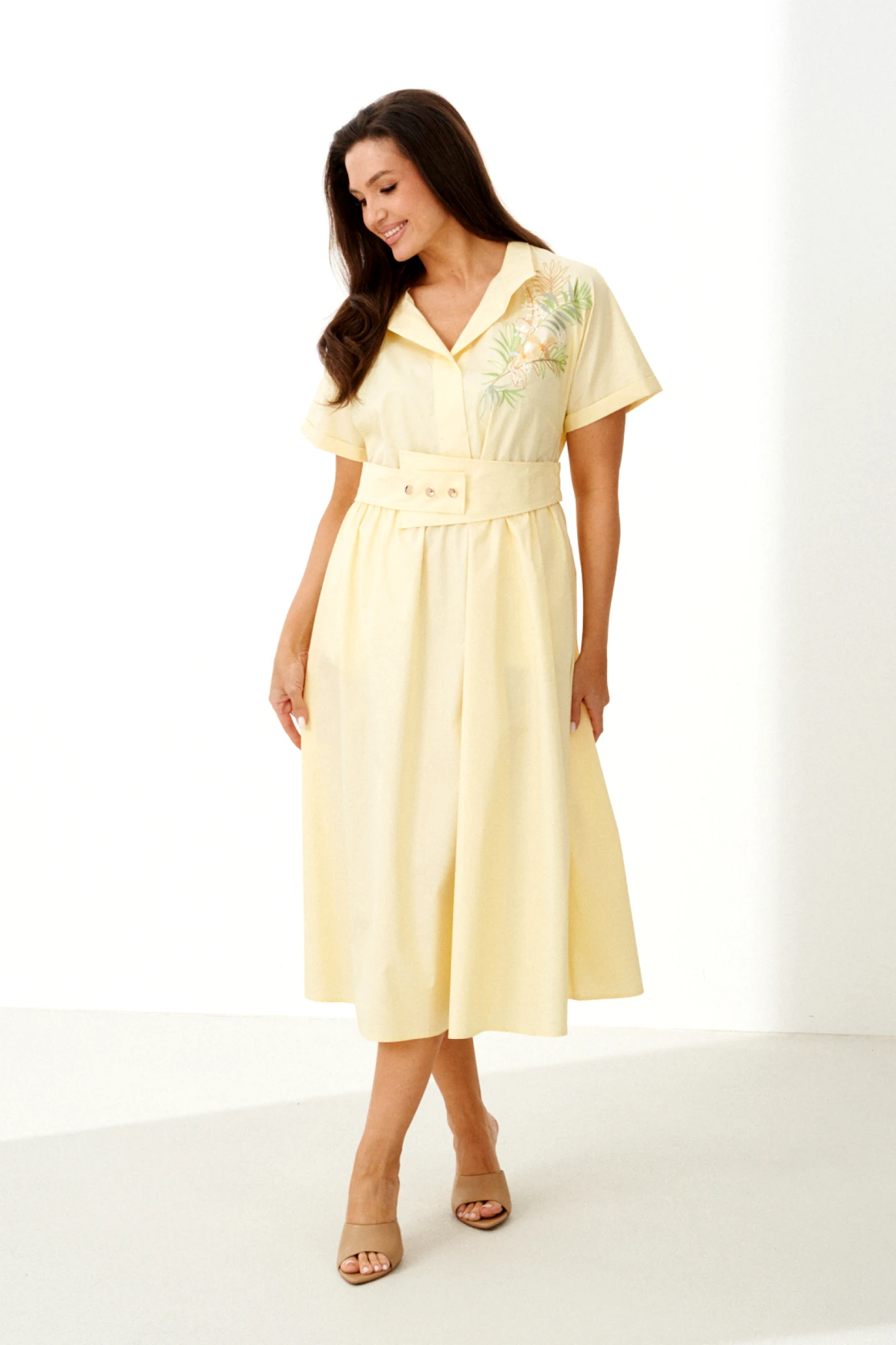 Платье женское из смесовой ткани для повседневной носки. Платье, расширенное к низу, а также отрезное по линии талии и имеет сборку. Перед имеет дизайнерскую вышивку в виде очаровательных цветов, а также две нагрудные вытачки. В боковом шве имеются потайные прорезные карманы. Горловина обработана втачной планкой и стойкой. Рукава цельнокроеные, низ рукава обработан отлетной манжетой, длинна рукава чуть выше локтя. Длинна платья макси. Для придания формы в области талии имеется пояс из основной ткани с застежкой на кнопки. В платье имеются по планке декоративные закрепки. Платье нежного светло-жёлтого цвета, в котором вы будете выглядеть очень привлекательно. За счет большого содержания хлопка в платье, ваша кожа будет чувствовать себя комфортно. Красивое и элегантное платье в котором вы будете выглядеть неотразимо.