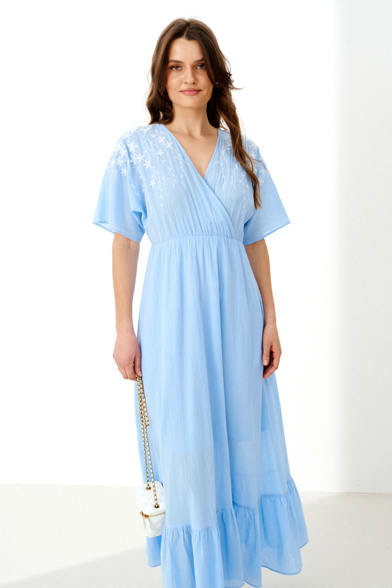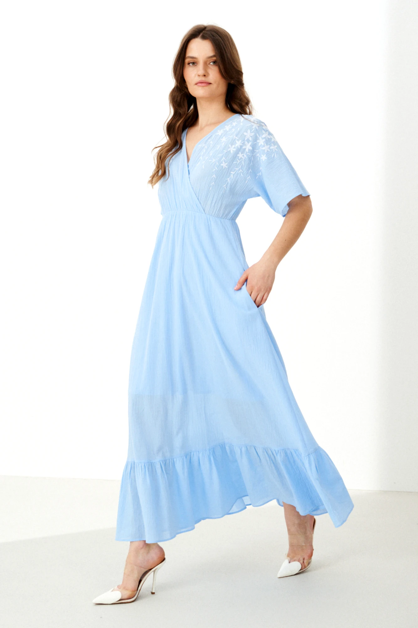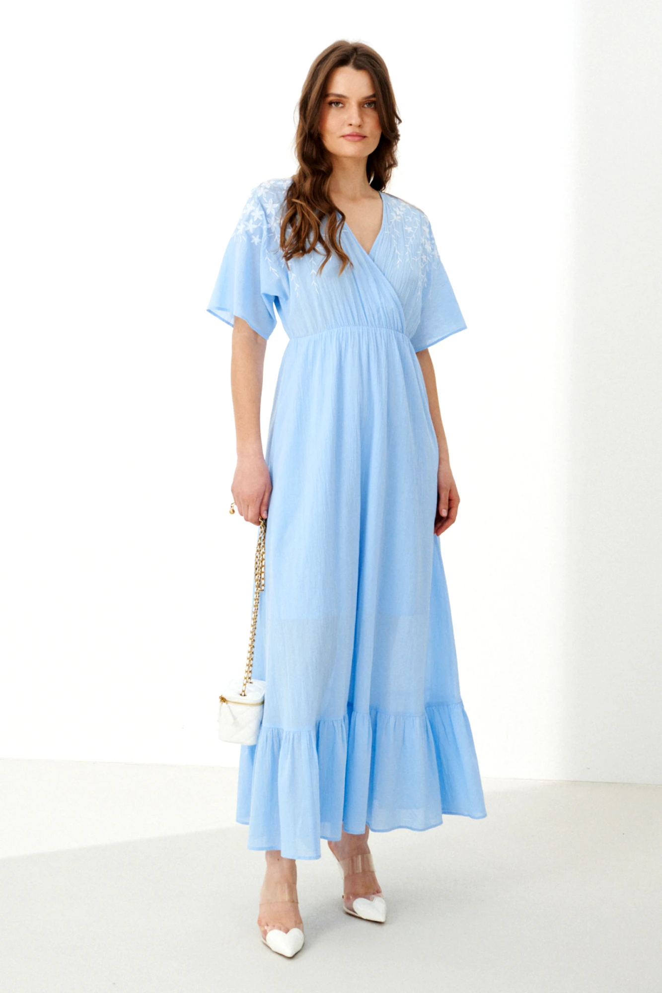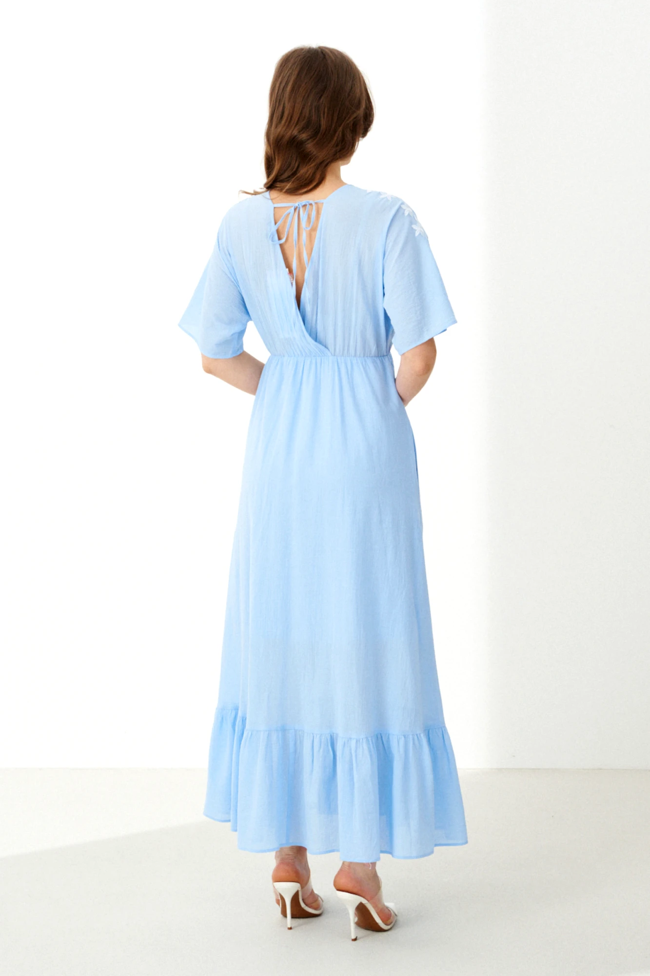 Женственное платье голубого оттенка. Модель из практичной смесовой ткани с добавлением хлопка, которая не только приятна к телу и комфортна в носке, но и обладает легким эффектом сжатия. Платье отличается сложным и продуманным кроем: оно отрезное по линии талии, где в шов встроена эластичная резинка, обеспечивающая идеальную посадку и подчеркивающая талию. Верхняя часть, лиф, является цельнокроеной для спинки и переда и выполнена на запах. Изюминкой лифа служит дизайнерская вышивка в виде цветов на передней части, добавляющая образу изысканности и уникальности. Задняя часть лифа оформлена завязками, которые позволяют регулировать посадку и создают эффектный вид со спины. Юбка платья расширенная, а ее динамику и объем подчеркивает вставной отрезной волан по низу. Цельнокроеные рукава длиной до локтя добавляют образу завершенности и гармонии. Модель не забывает и о практичности — в боковых швах юбки скрыты аккуратные потайные карманы. Это платье — прекрасный выбор для создания запоминающегося образа на особое мероприятие или для романтичной повседневной прогулки, где комфорт и стиль идут рука об руку.