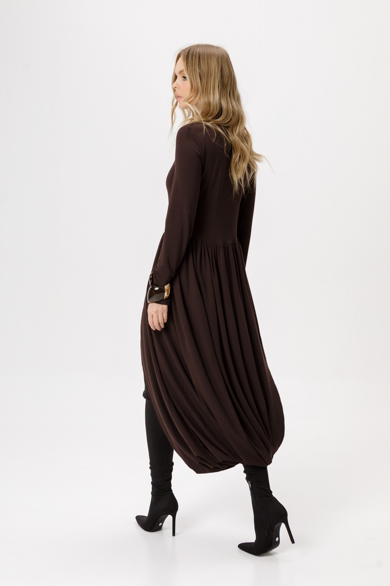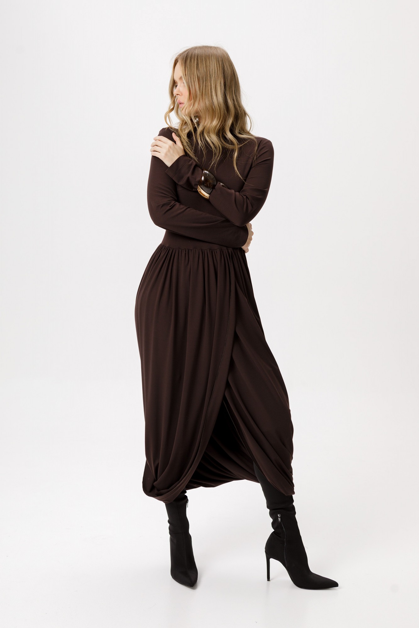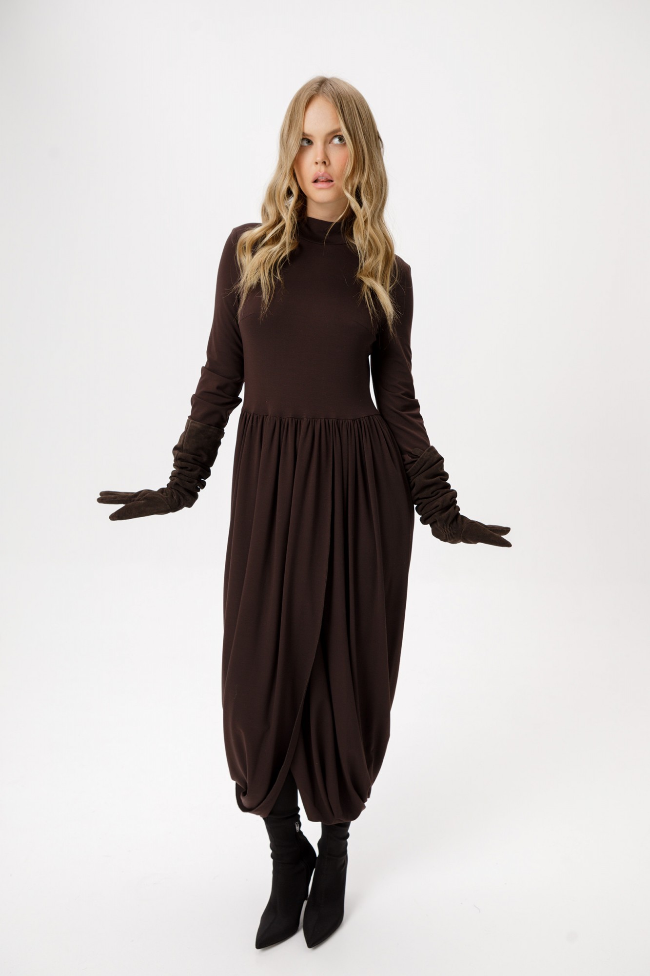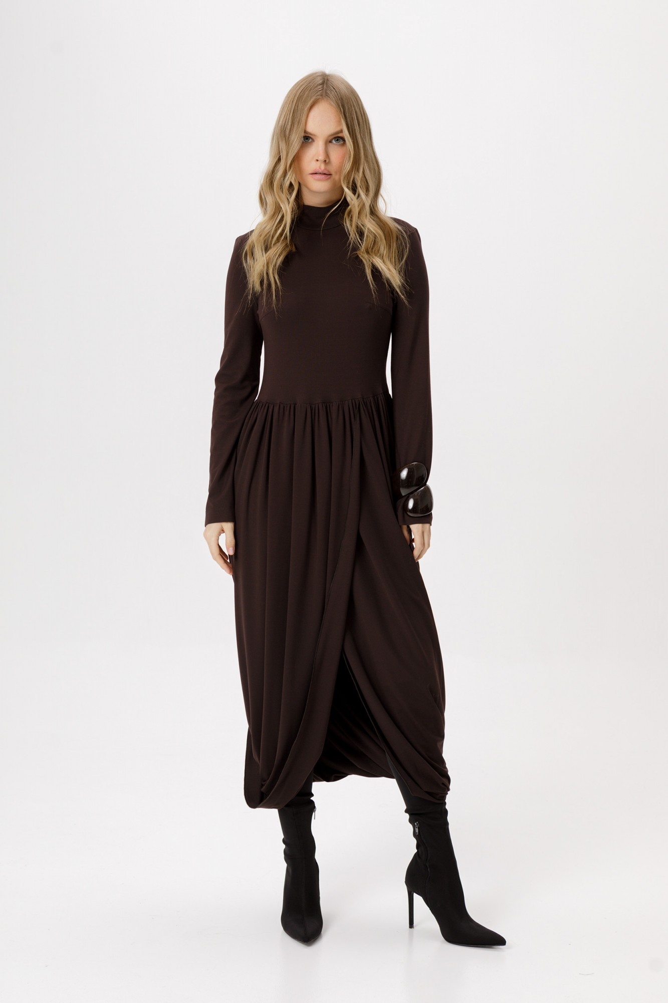 Трикотажное платье длины миди с асимметричной юбкой. Детали: прилегающий силуэт, нагрудные вытачки, платье отрезное по талии, юбка со сборками на запах, втачной одношовный рукав, воротник-стойка.