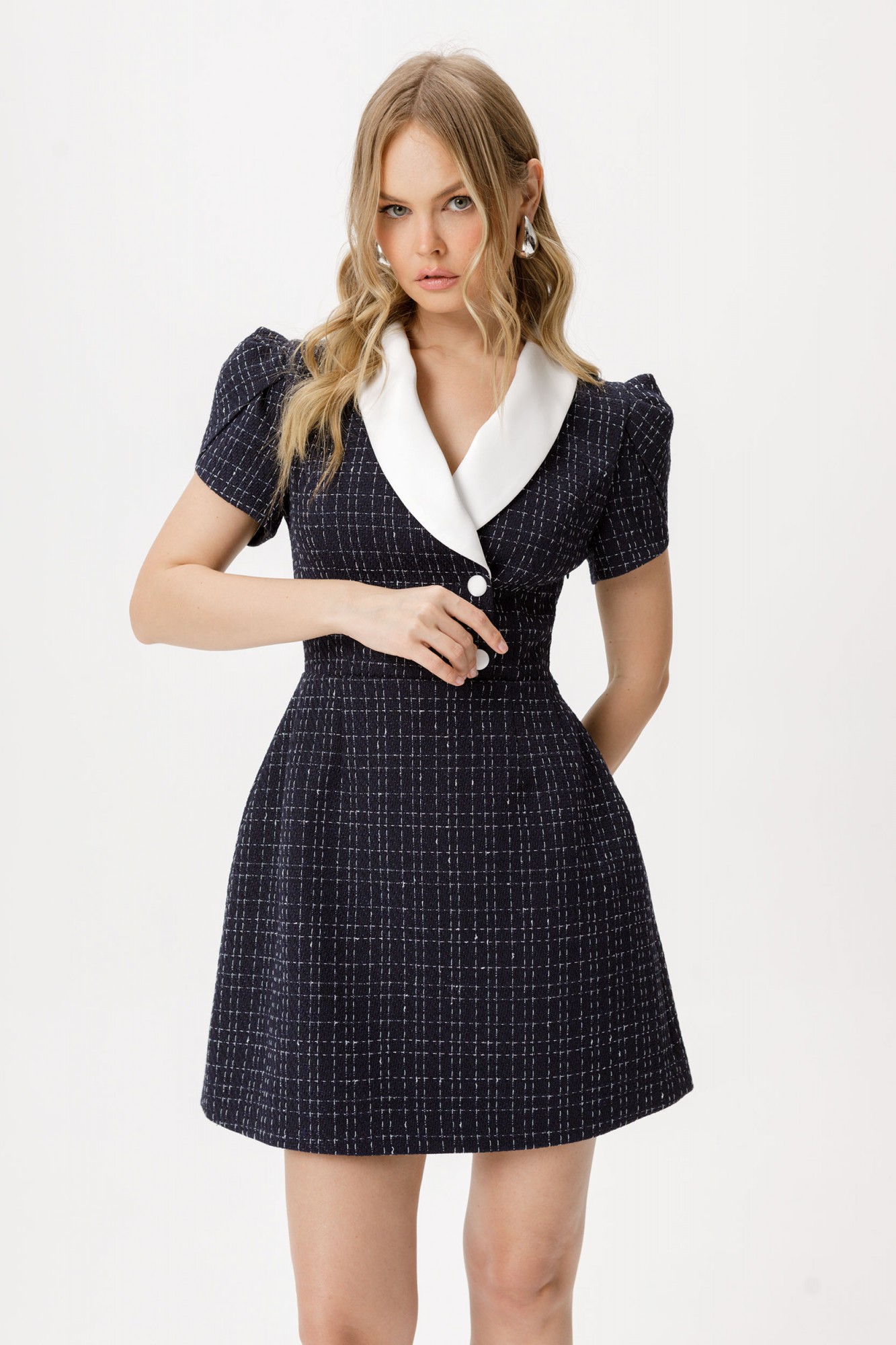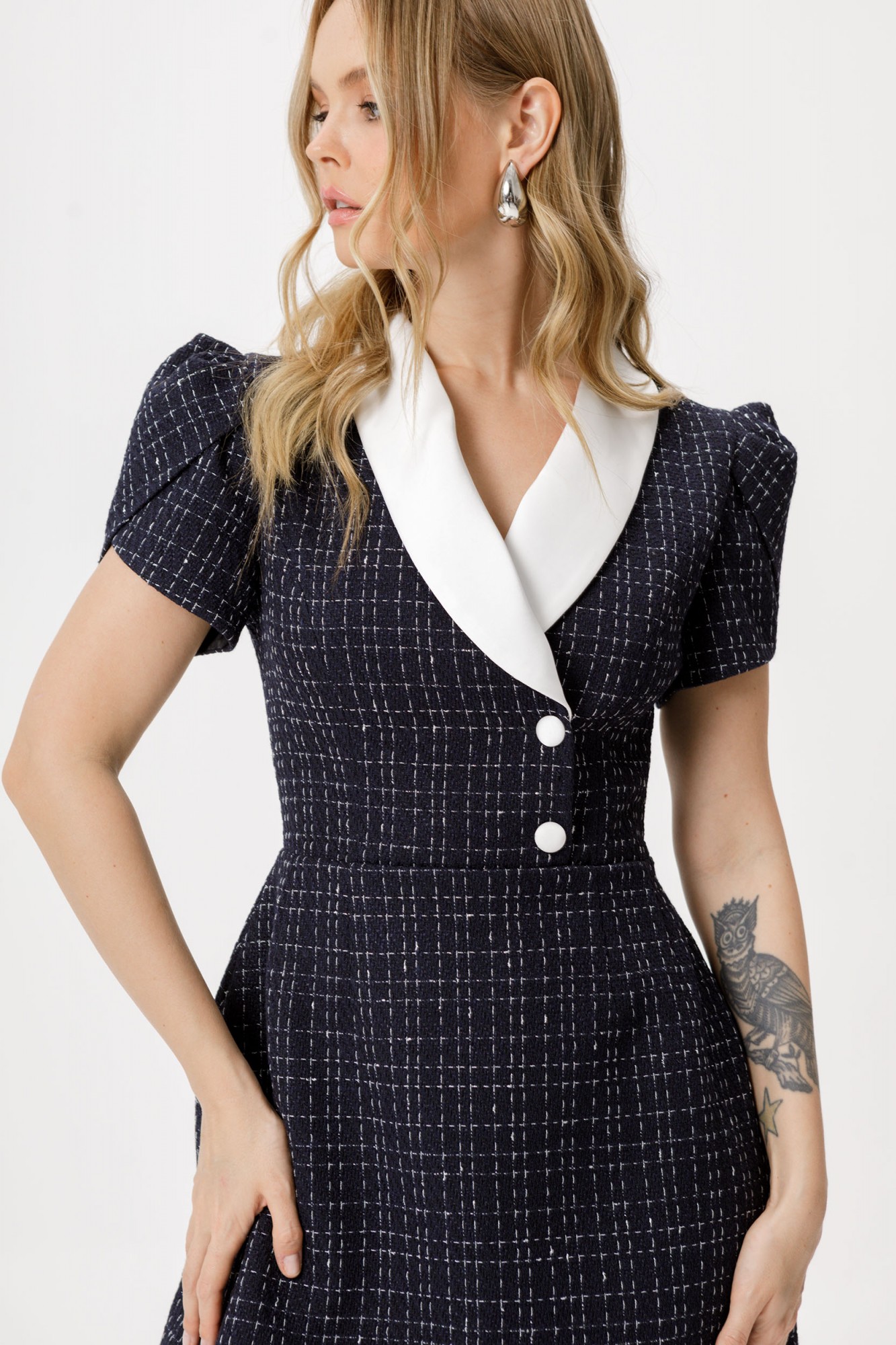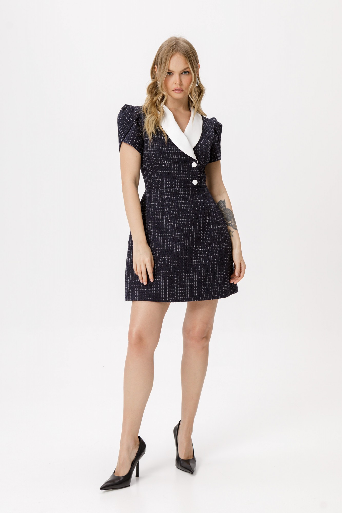 Мини платье из фактурной ткани с рукавом «фонариком». Детали: платье полуприлегающего силуэта, перед с рельефами и имитацией запаха с застежкой на две петли и пуговицы, спинка со средним швом и талиевыми вытачками, рукава втачные с запахом и бантовыми складками, шалевый контрастный воротник, платье застёгивается на потайную молнию в левом боковом шве, платье на подкладке.