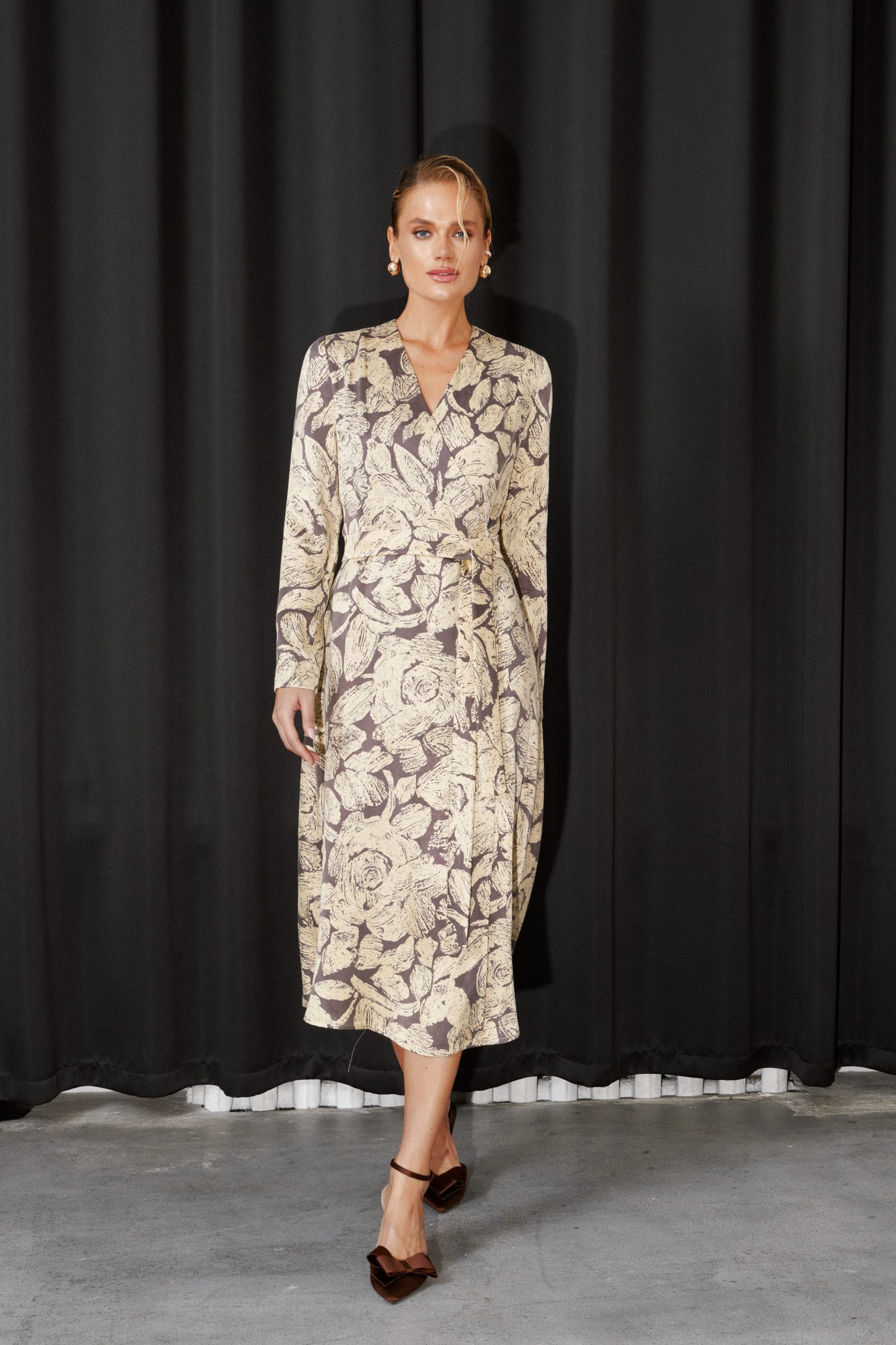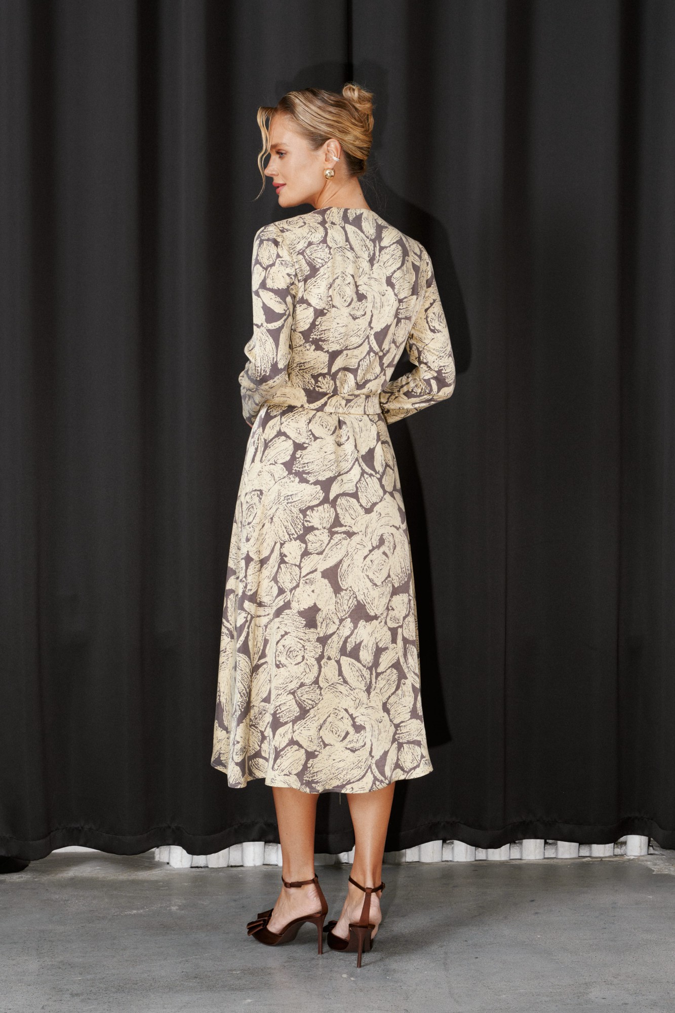 Платье Х - силуэта, на запах, из плательно-костюмной ткани, длиной миди. Отрезное по линии талии, V - образная горловина, застежка двубортная на пришивные кнопки, рукава втачные, длинные. Съемный пояс.