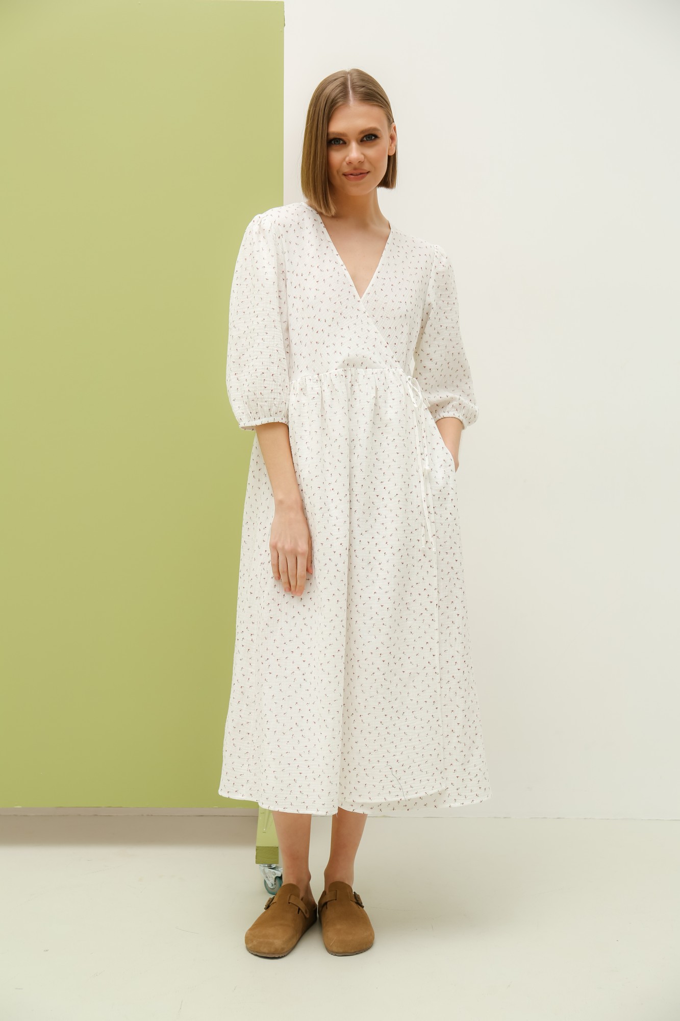 Романтичное платье , свободного силуэта на запах длиной миди. Платье отрезное по линии талии и сборкой по юбке. Рукав втачной одношовный 3/4 на резинке снизу.