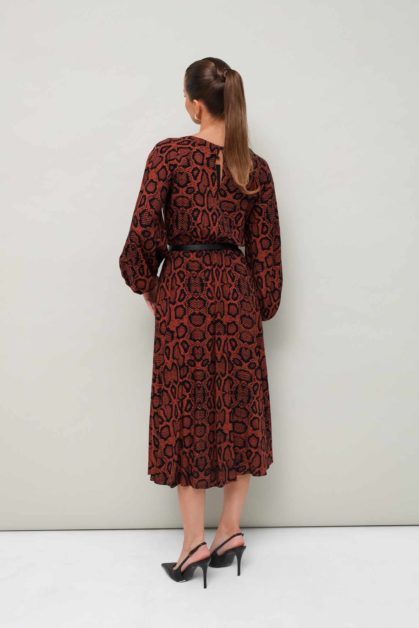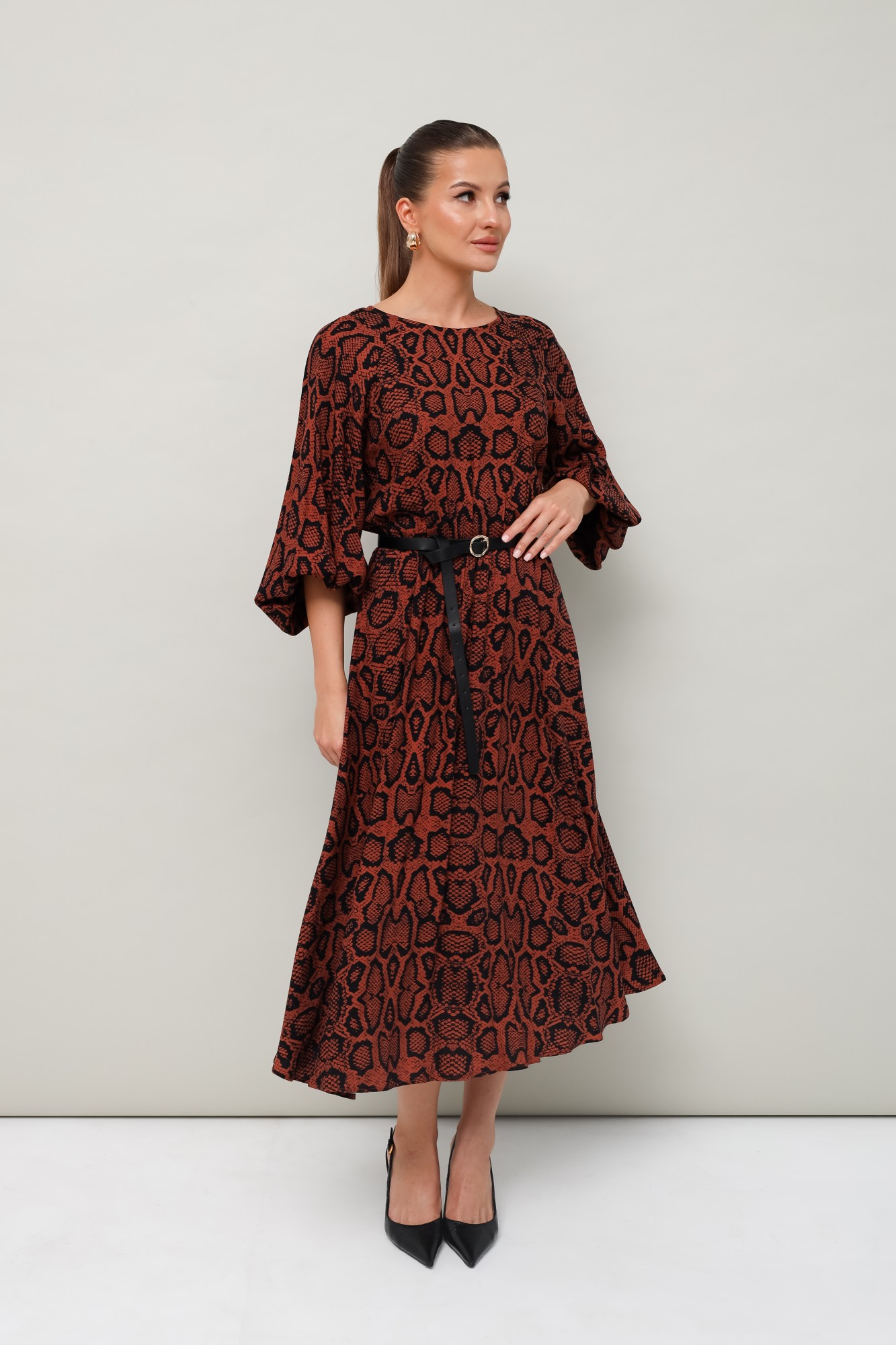 Платье отрезное по линии талии на резинке, выполнено из вискозы с принтом рептилии. Горловина с окантованным вырезом круглой формы. Рукава-реглан, в длине 3/4 собраны на резинку по низу. По спинке обработан разрез с застежкой в среднем шве на навесную петлю и пуговицу. В комплекте прилагается съемный ремень.