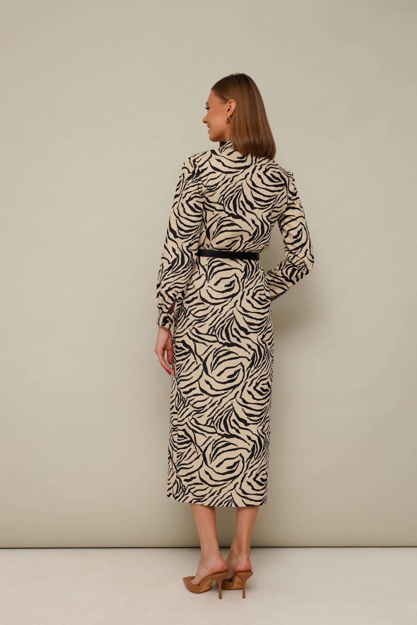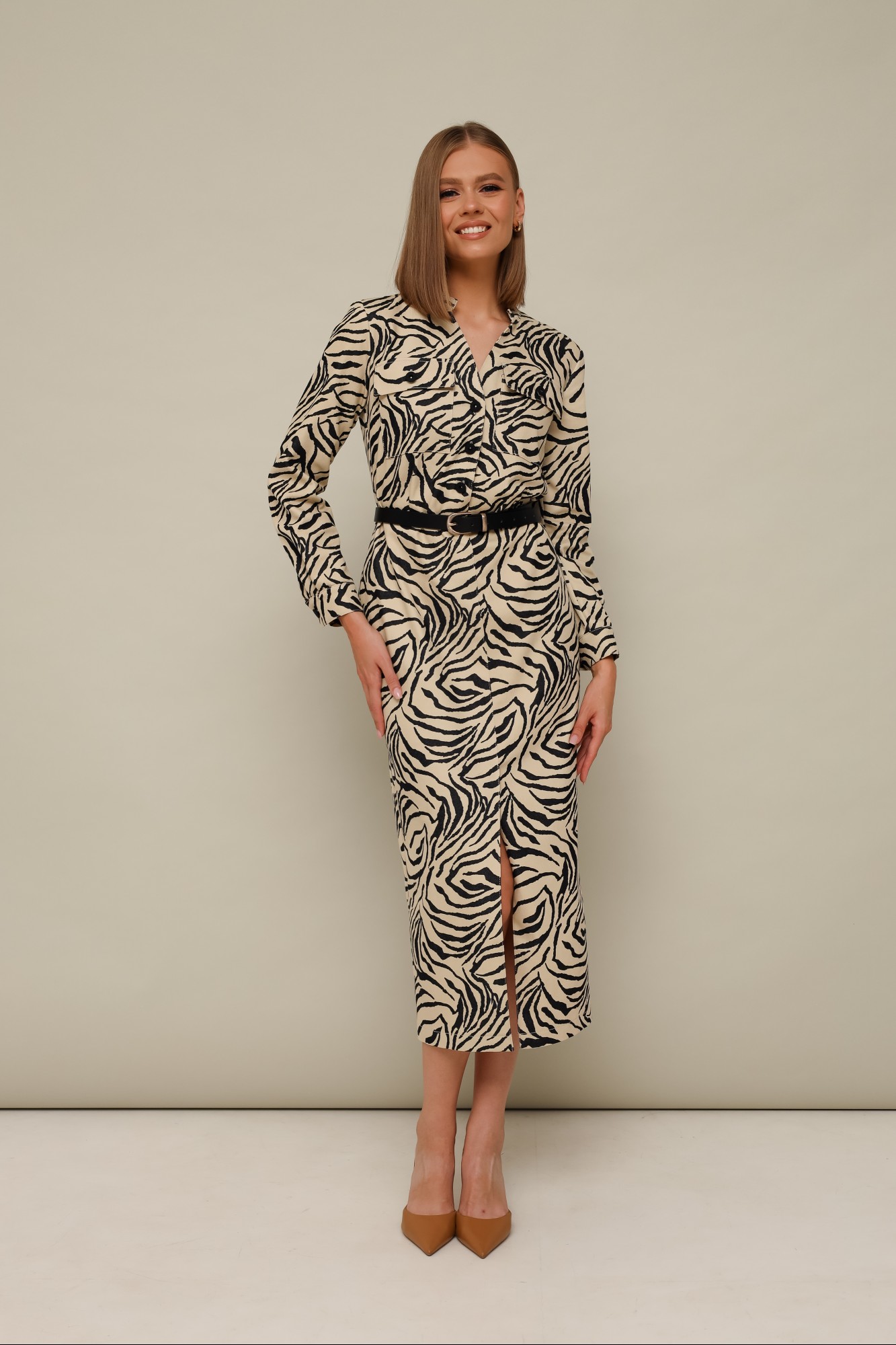 Женское платье полуприлегающего силуэта, отрезное по линии талии, выполнено из джинсовой ткани с анималистичным принтом. Фигурный вырез горловины с притачным воротником-стойкой. Лиф с центральной застежкой на петли, пуговицы и с накладными карманами с клапанами. Юбка с разрезом в среднем шве, который обеспечивает свободу движения. Рукава втачные с притачной манжетой с застежкой на пуговицы. Спинка с талиевыми вытачками. В комплекте прилагается ремень.