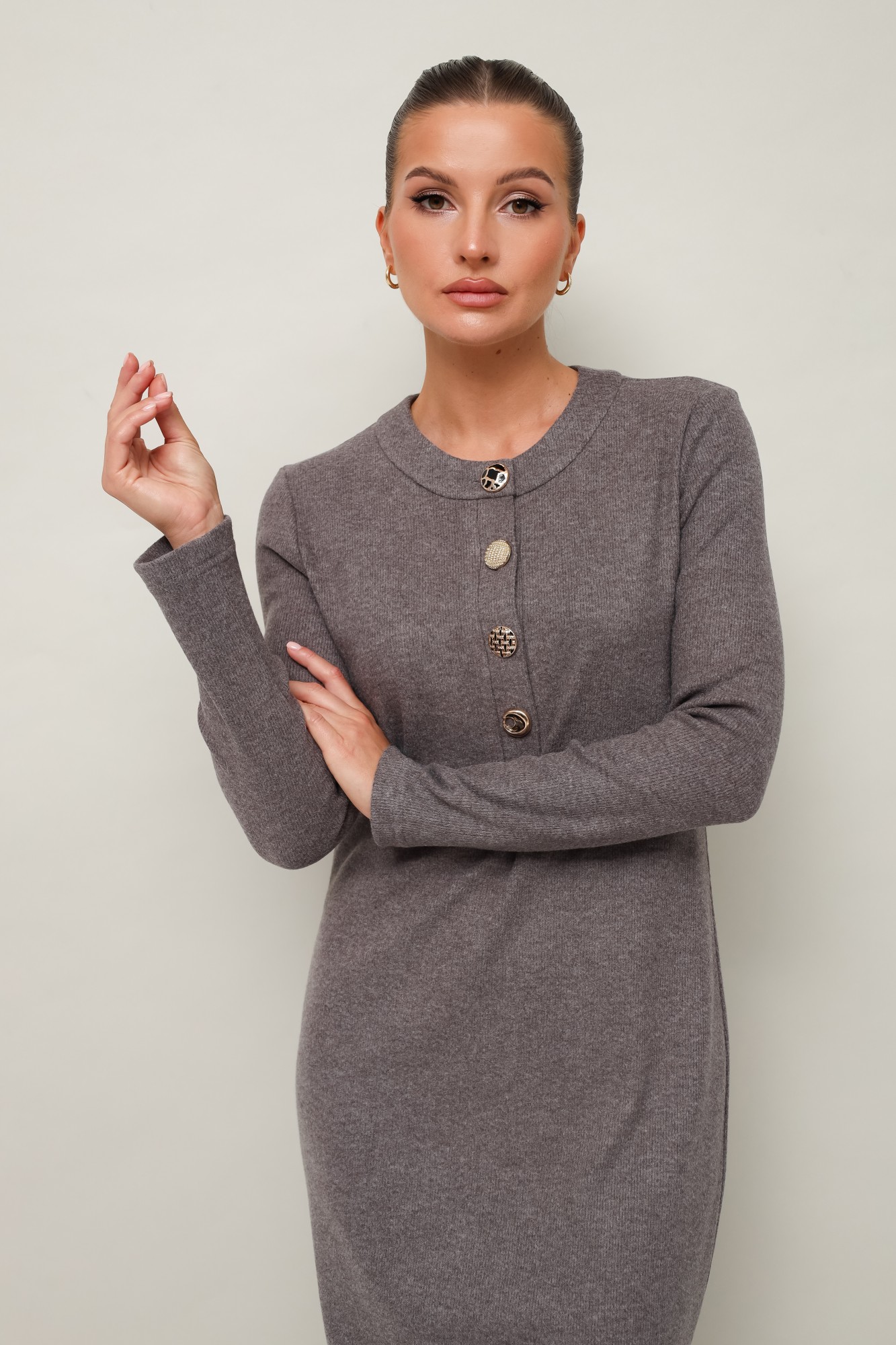 Стильное платье полуприлегающего силуэта, выполнено из трикотажного полотна. Горловина округлой формы, с центральной застежкой на петли и 4 разных пуговицы. Рукава длинные втачные. В боковых швах обработаны высокие разрезы.