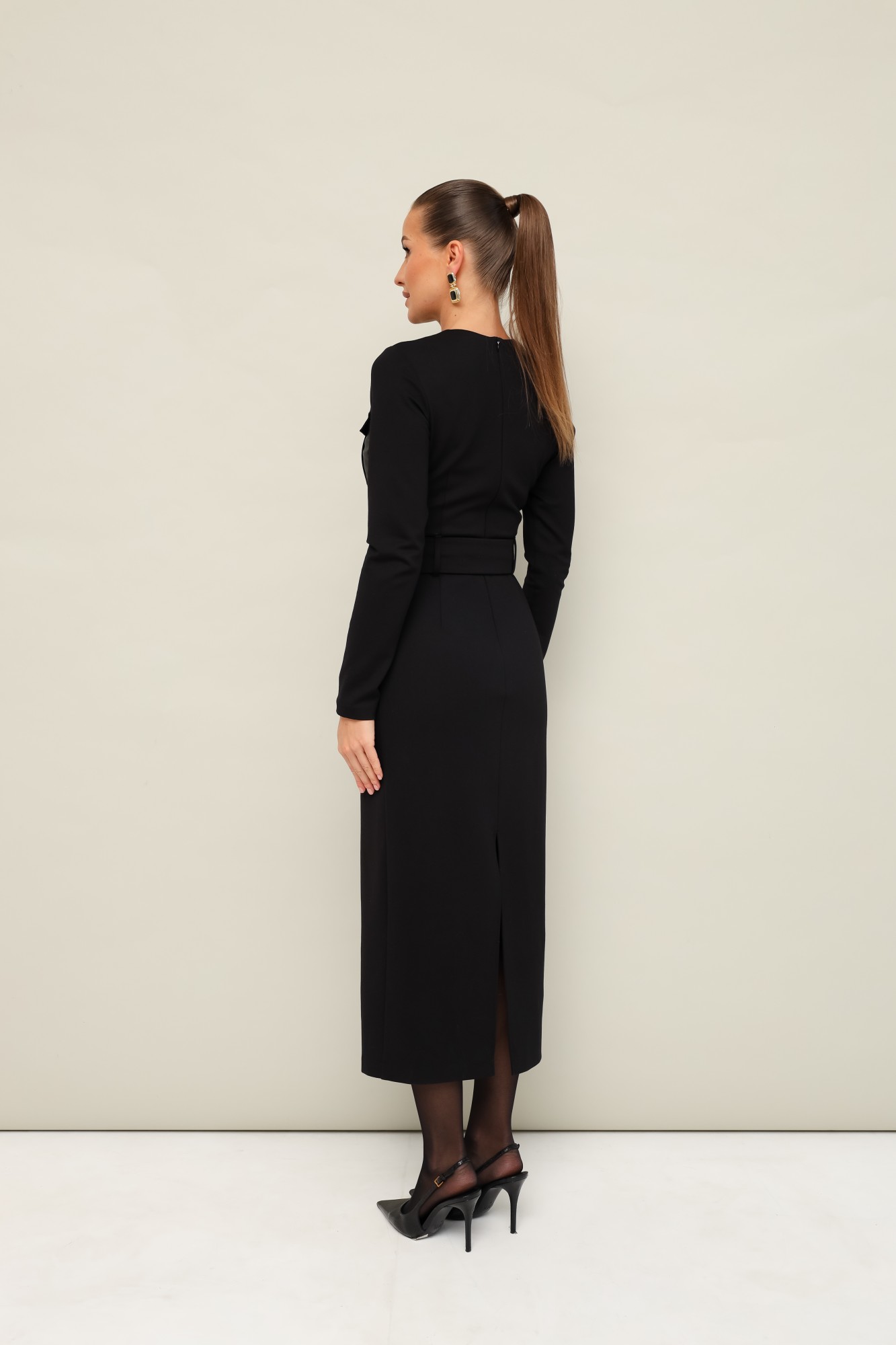 Платье прилегающего силуэта, отрезное по линии талии, выполнено из эластичного трикотажного полотна. Горловина округлой формы. По лифу обработана планка с пуговицами и нагрудные накладные карманы с клапанами. Длинные втачные рукава. Спинка с застежкой на потайную молнию в среднем шве. Для удобства движения сзади обработан разрез. По поясу предусмотрены шлевки. В комплекте прилагается пояс из основной ткани с пряжкой.