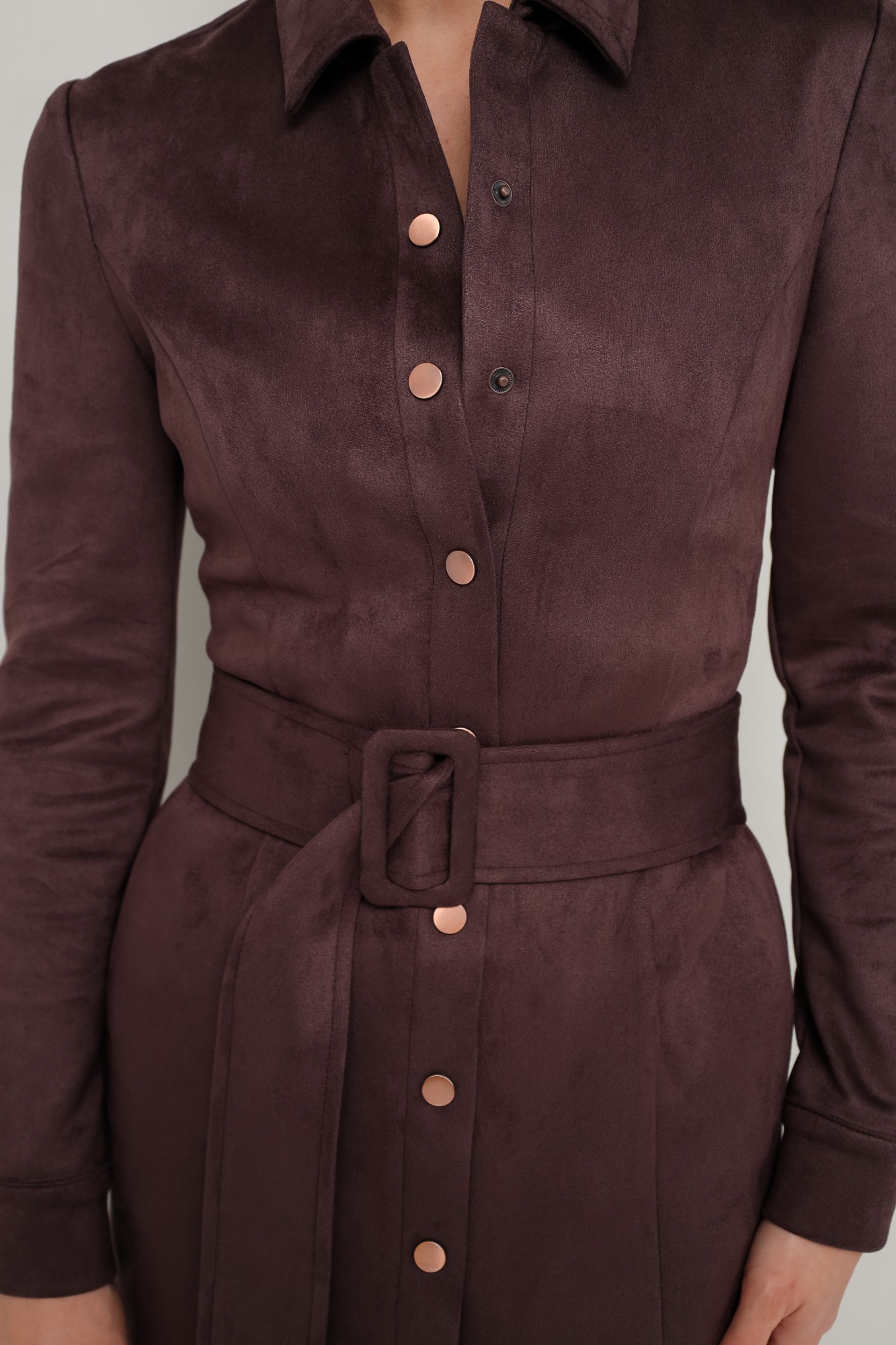 Силуэтное платье в длине миди, выполнено из экозамши. Отложной воротник с цельнокроеной стойкой. Центральная застёжка на кнопки. Перед с рельефными швами. Втачные двухшовные рукава с манжетами с застежкой на кнопки. Спинка со средним швом. В комплекте прилагается пояс из основной ткани с пряжкой.