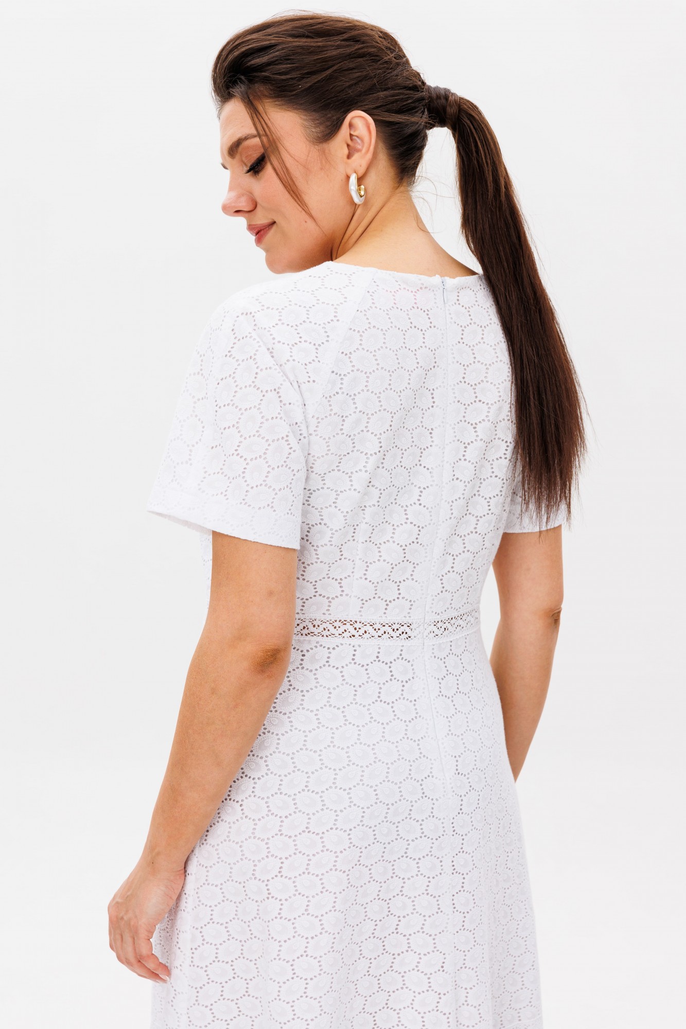 В этом платье словно воплотилась сама нежность — струящийся полуприлегающий силуэт мягко обволакивает фигуру, подчеркивая изящество линий. Круглый вырез горловины, скромный и элегантный, обрамляет лицо, даря ощущение легкости и чистоты. Короткий рукав-реглан, словно вторящий естественным изгибам плеч, добавляет образу воздушности. Застёжка-молния, скрытая на спинке, делает платье удобным, сохраняя при этом безупречную гладкость силуэта. Слегка завышенная талия визуально удлиняет стройность, а воланы по подолу, трепещущие при каждом движении, наполняют образ лёгкой динамикой. Но главное очарование — в кружеве ришелье. Ажурные узоры, словно сотканные из солнечных бликов на белоснежных лепестках, придают платью неповторимый шарм. Подкладка бережно скрывает прозрачность кружева, оставляя лишь его нежное мерцание. Это платье от Анелли — как утренний свет в саду, как первый цветок, раскрывающийся навстречу лету. Оно создано для тех, кто хочет почувствовать себя лёгкой, женственной и в то же время изысканной, словно героиня романтической истории. Рост модели 173 см, размер 52. Для того чтобы подобрать для себя идеальный размер, обязательно сверяйтесь с замерами в описании, мы их делаем индивидуально к каждому изделию.