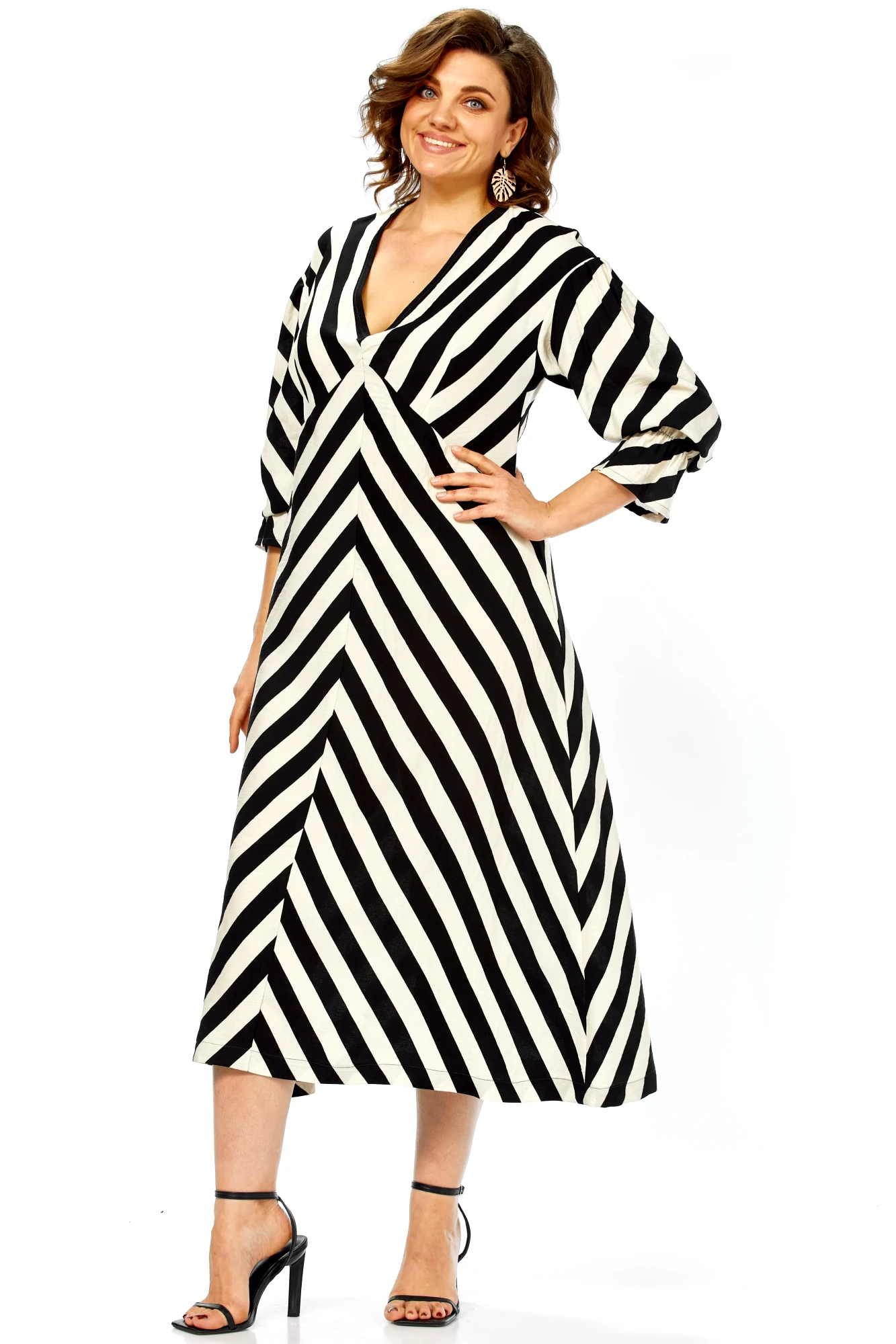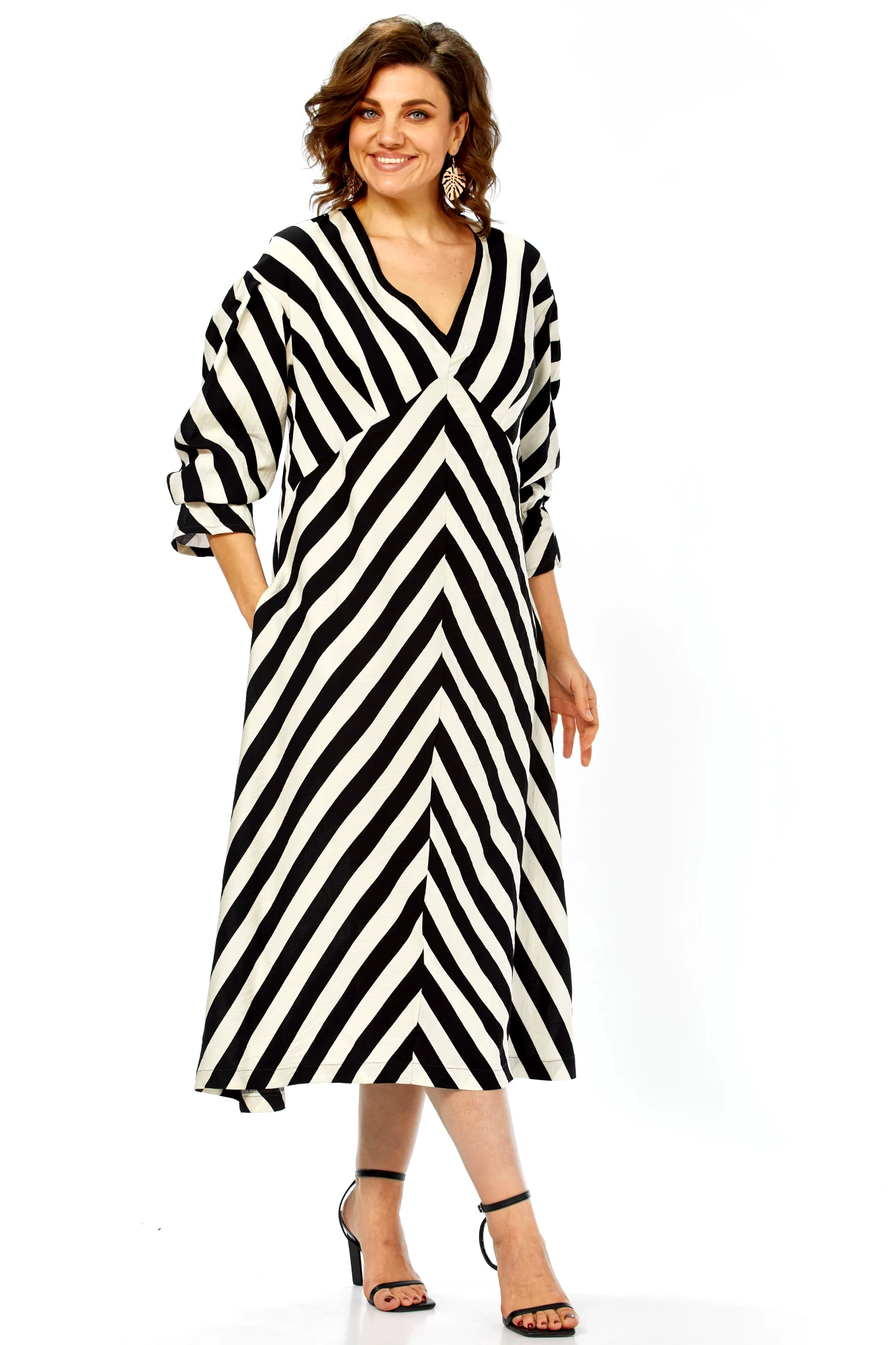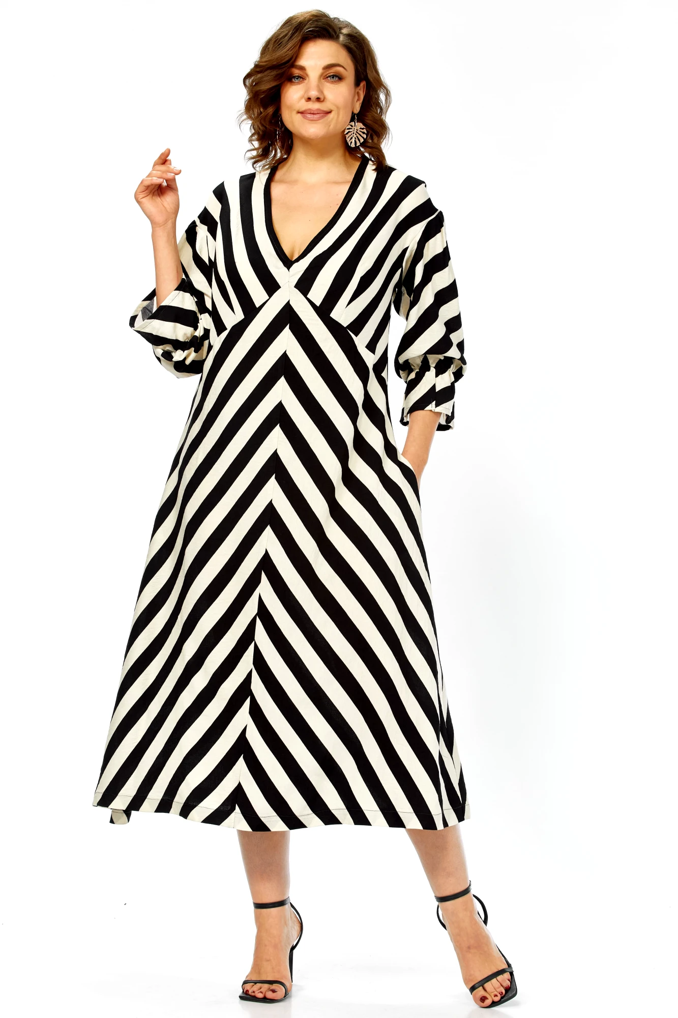 Это платье — воплощение летней элегантности и комфорта. Созданное из натурального хлопка, оно подарит ощущение легкости и свободы, а благодаря своему выразительному дизайну станет настоящим украшением вашего гардероба. Платье имеет прямой, но свободный силуэт, который создает ощущение непринужденности и комфорта. Оно не сковывает движений, но при этом сохраняет женственность благодаря продуманному крою. Длина — миди, элегантно прикрывающая колени, длина платья составляет 125см, длина рукава 62см. Главная изюминка модели — контрастный черно-белый принт в широкую полоску. Уникальность ему придают особым образом расположенные полосы: на лифе они идут по диагонали, а на юбке — вертикально, сходясь по центру передней полочки (полоска не совмещается). Такое расположение полос придает платью графичность и визуально вытягивает силуэт.