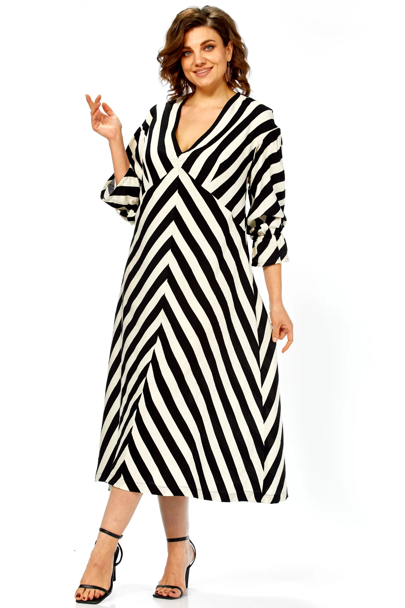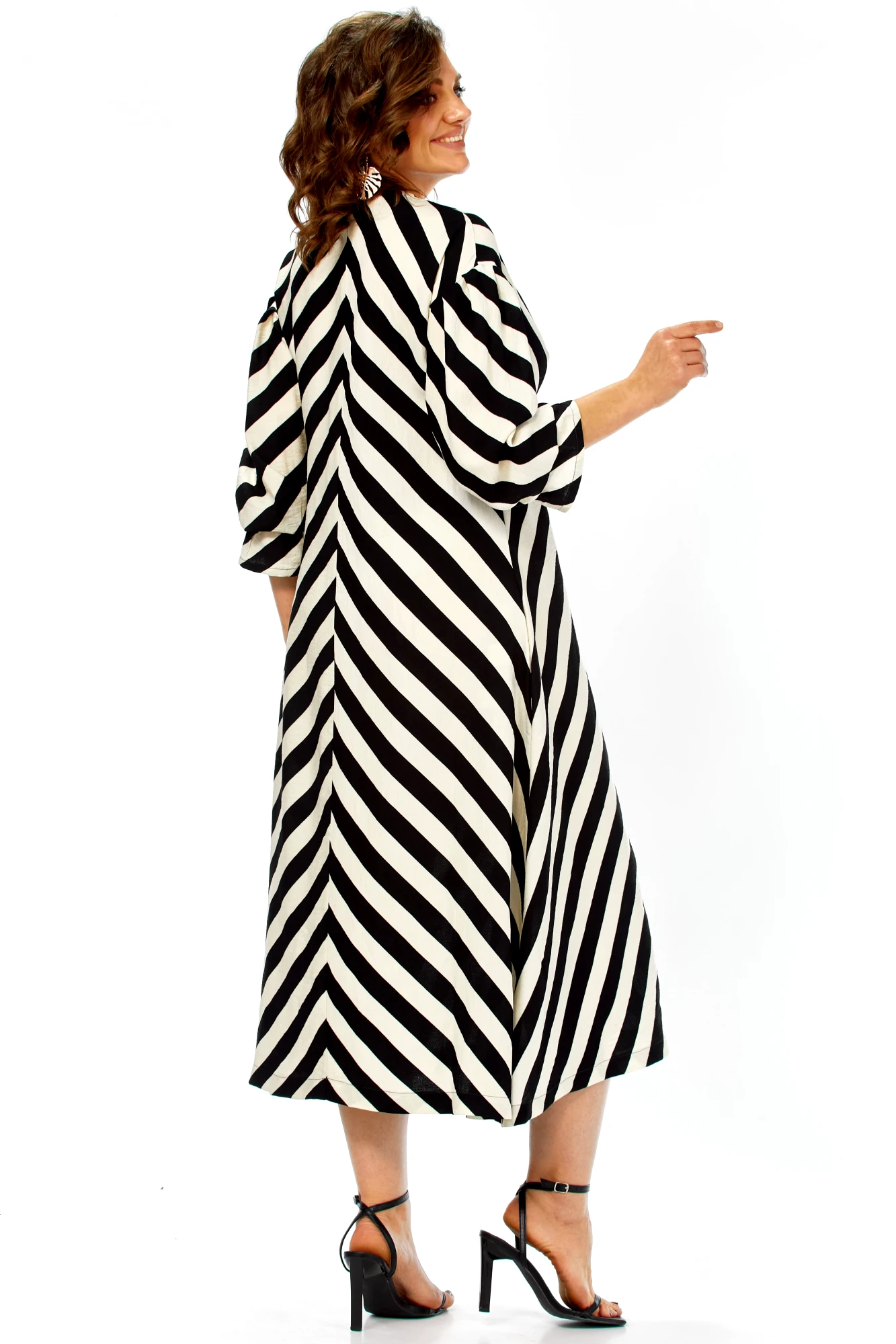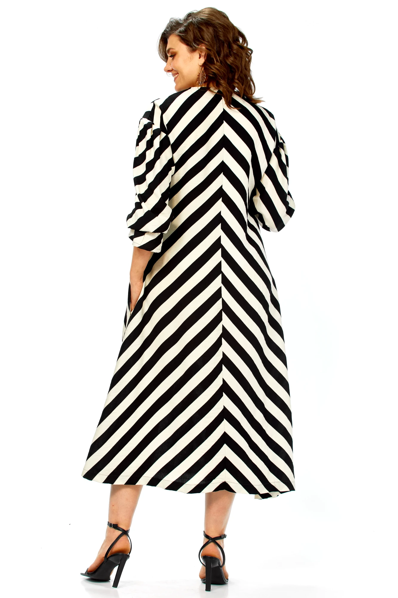Это платье — воплощение летней элегантности и комфорта. Созданное из натурального хлопка, оно подарит ощущение легкости и свободы, а благодаря своему выразительному дизайну станет настоящим украшением вашего гардероба. Платье имеет прямой, но свободный силуэт, который создает ощущение непринужденности и комфорта. Оно не сковывает движений, но при этом сохраняет женственность благодаря продуманному крою. Длина — миди, элегантно прикрывающая колени, длина платья составляет 125см, длина рукава 62см. Главная изюминка модели — контрастный черно-белый принт в широкую полоску. Уникальность ему придают особым образом расположенные полосы: на лифе они идут по диагонали, а на юбке — вертикально, сходясь по центру передней полочки (полоска не совмещается). Такое расположение полос придает платью графичность и визуально вытягивает силуэт.