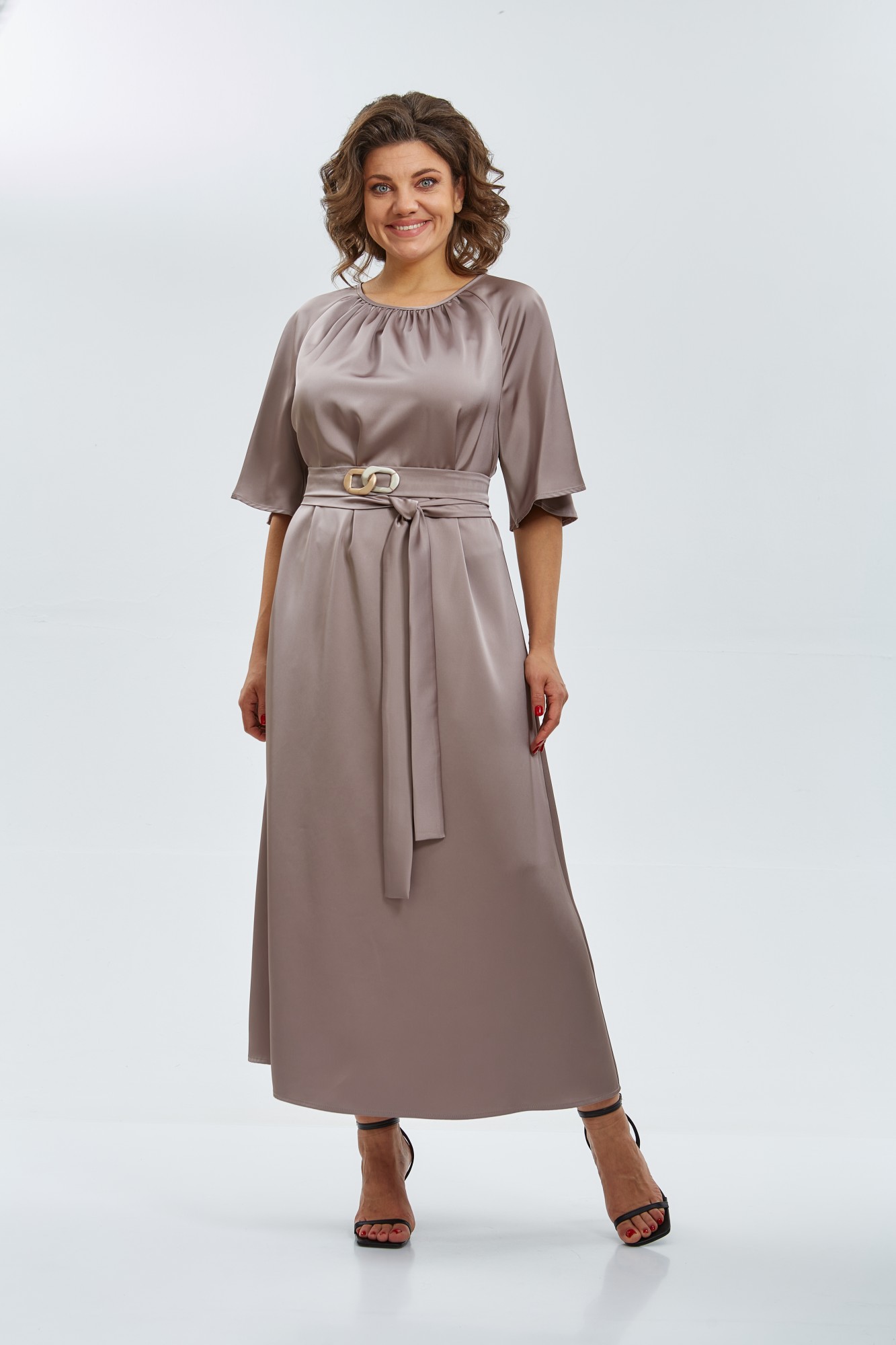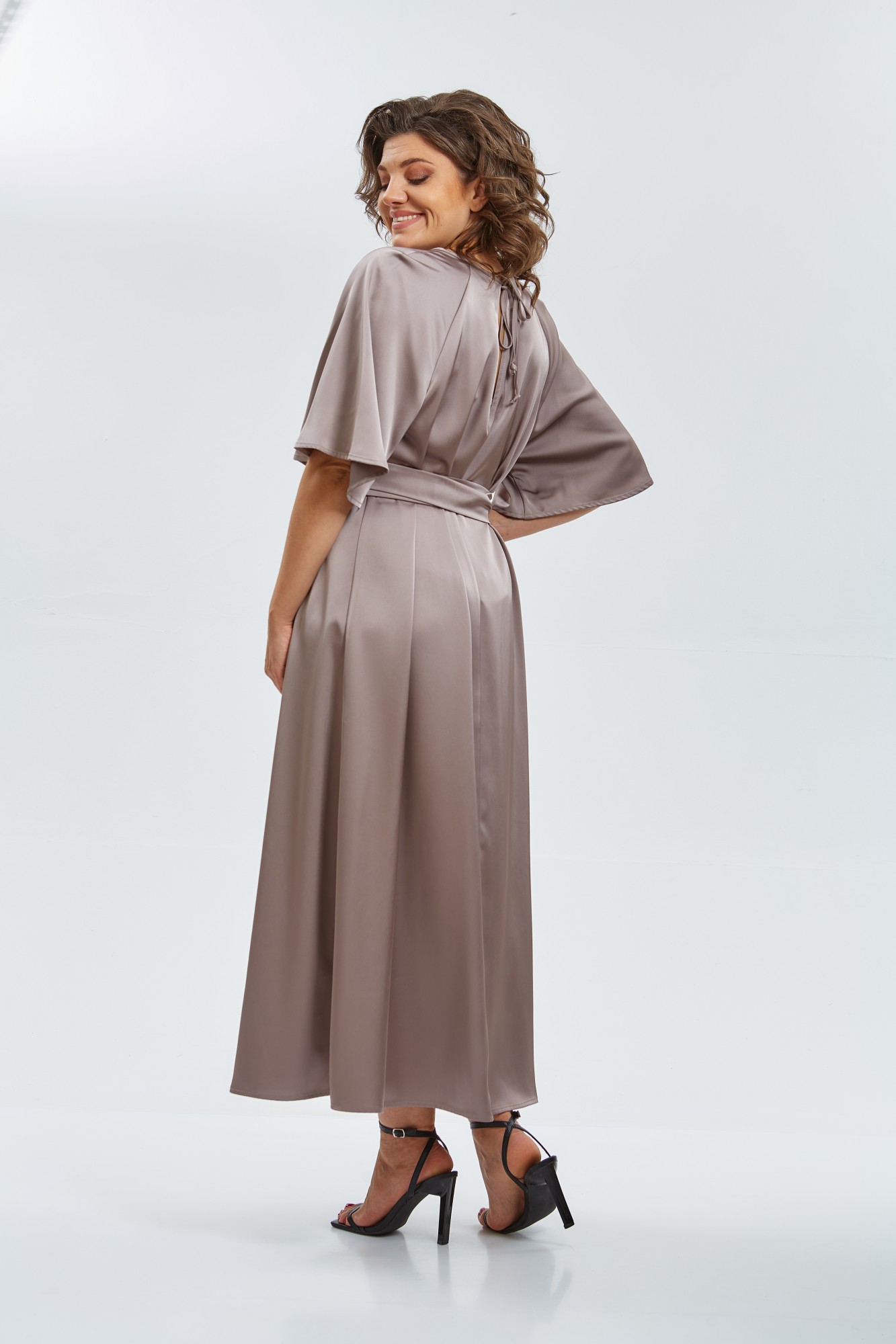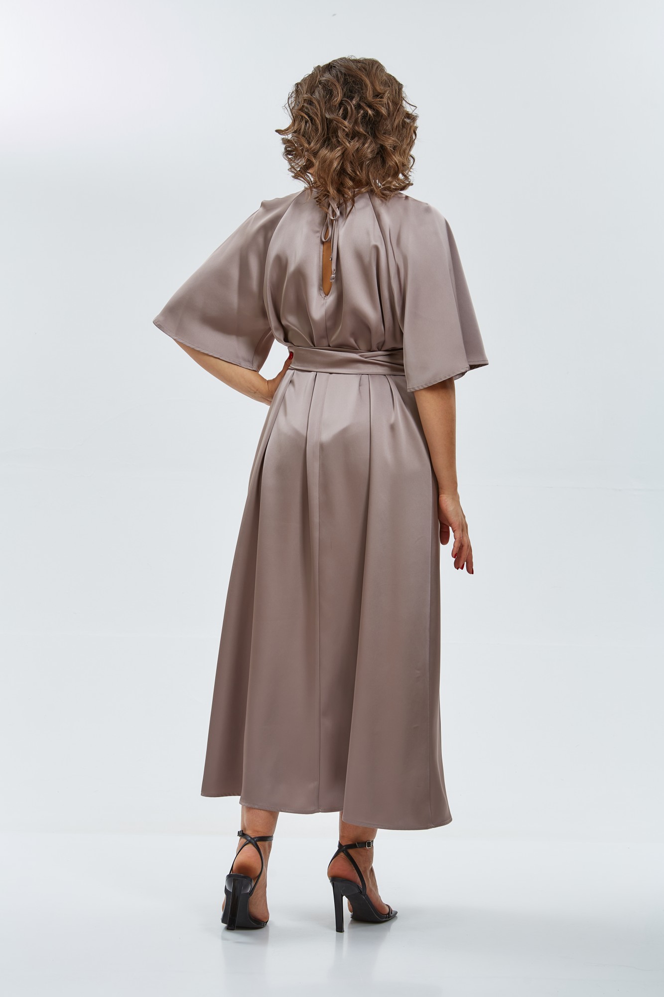 Cочетание элегантности и изысканности. Минималистичное по крою платье длины макси из двустороннего сатина. Вырез горловины округлый, спереди на сборке. Рукав реглан, расширенный к низу. Спинка со средним швом и углубленным разрезом сверху. Линия талии дополнительно подчёркивается поясом с декоративной фурнитурой.