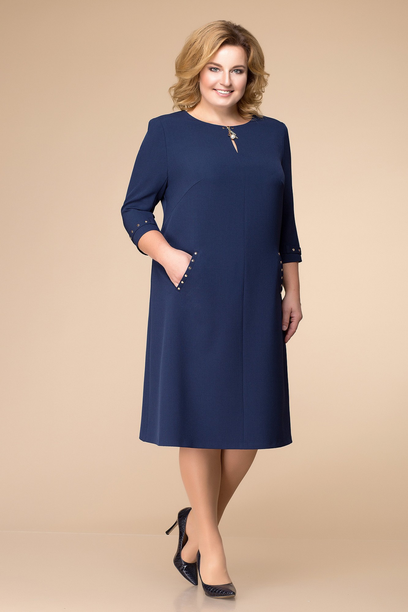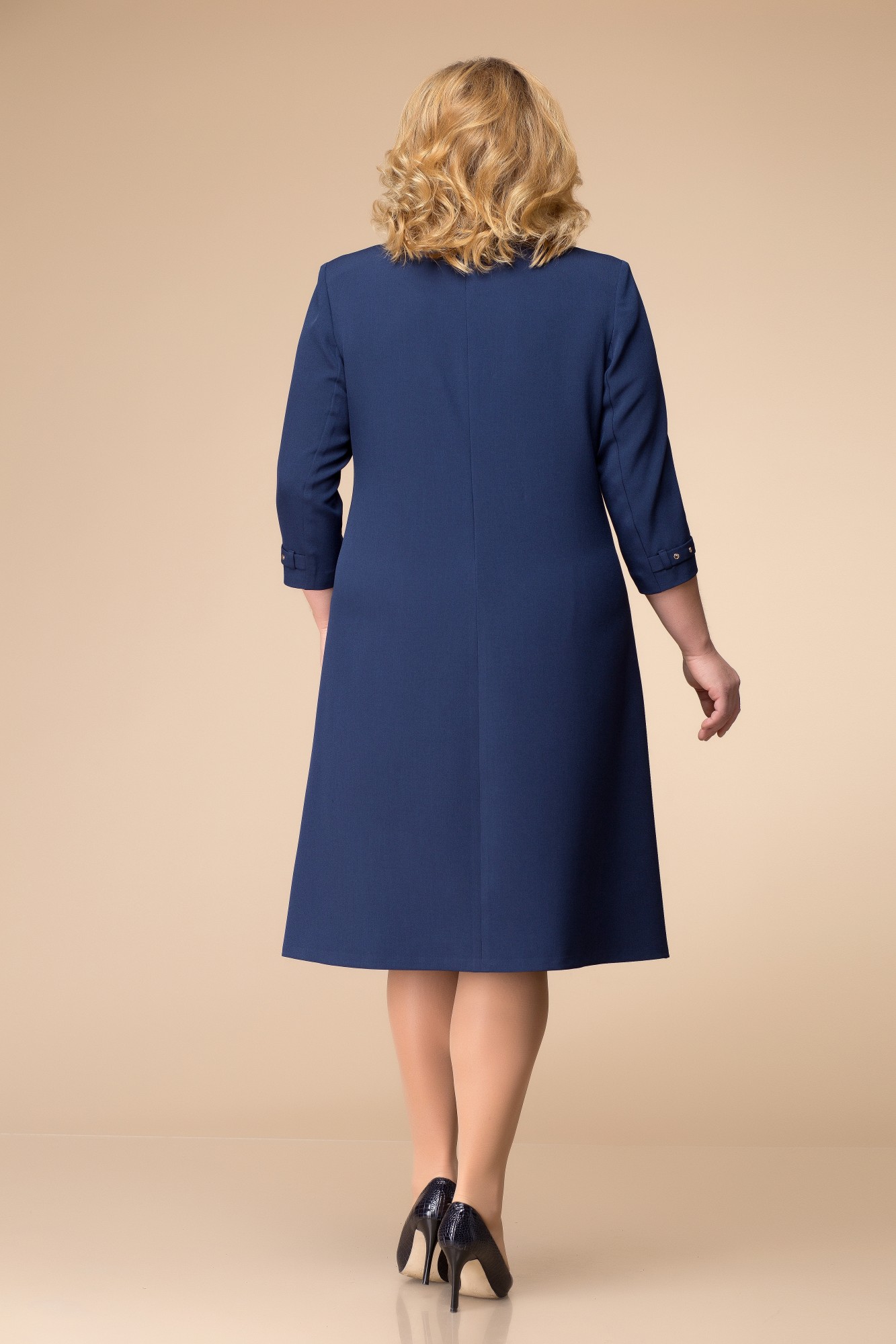 Платье женское расширенное книзу, длиной за колено, предназначено для повседневной носки. Перед с двумя нагрудными вытачками, с двумя прорезными карманами с листочками, с втачными концами на уровне линии бедер, со средним швом, вверху с разрезом, фиксирующимся пришивным украшением с двумя пробивными хольнитенами. Спинка со средним швом. Застежка на потайную тесьму-молнию в среднем шве спинки. Горловина круглая, обтачная, без воротника. Рукав втачной, двух шовный, длиной 3/4. Внизу верхнего рукава пата, фиксирующаяся в две настрочные шлевки. Пата с шестью пробивными хольнитенами. Платье с плечевыми накладками.
