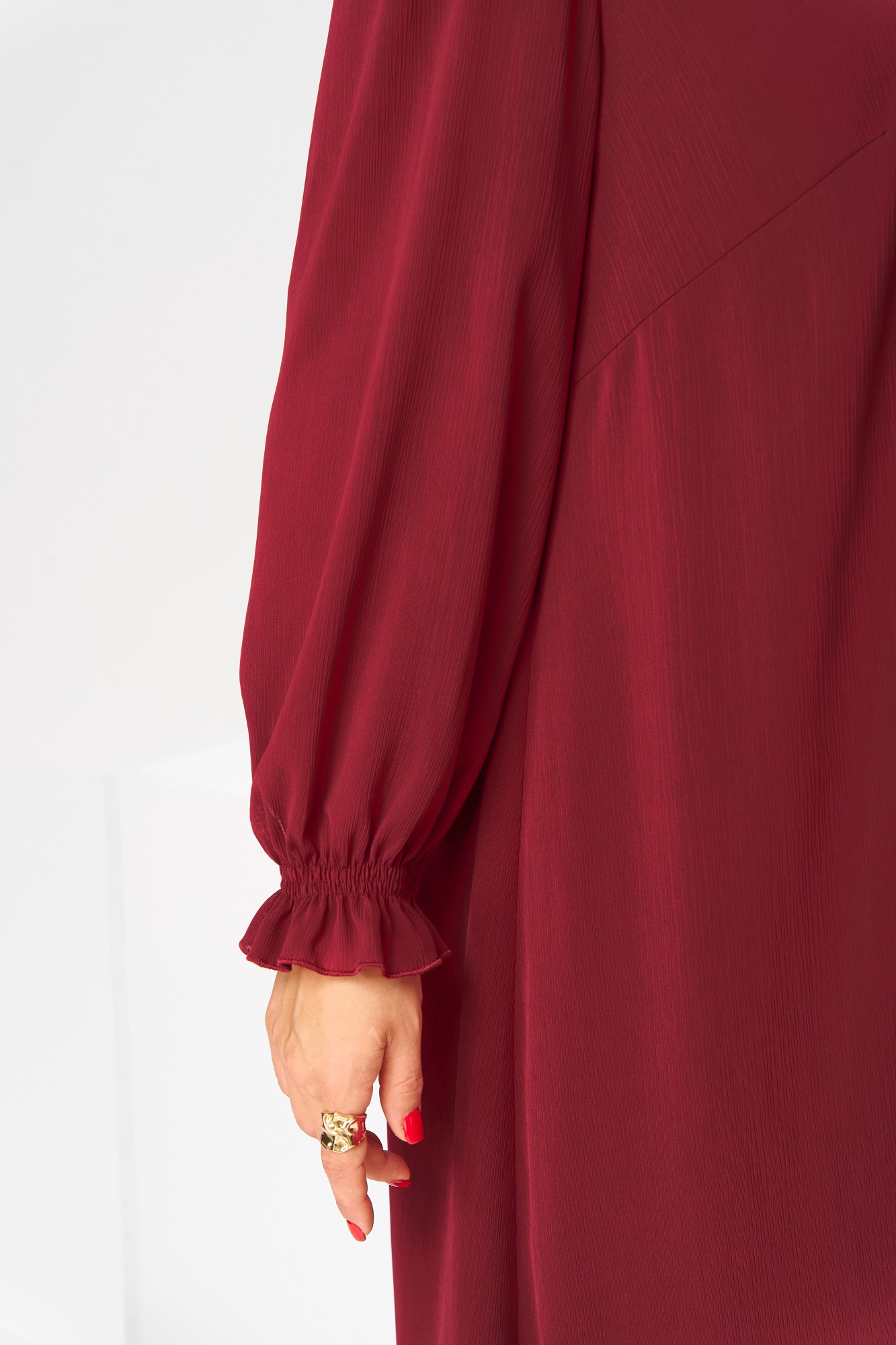 Платье женское расширенное к низу, длиной за колено. Перед с двумя нагрудными вытачками, с разрезом по центру, фиксирующимся на 10 навесных петель и 10 пришивных пуговиц с одной бантовой складкой, выходящей из-под разреза. Спинка цельнокроеная. Горловина круглая, обтачная, без воротника. Рукав полуреглан, втачной, длинный, одношовный, низ рукава собран на эластичную тесьму. Платье на подкладке.