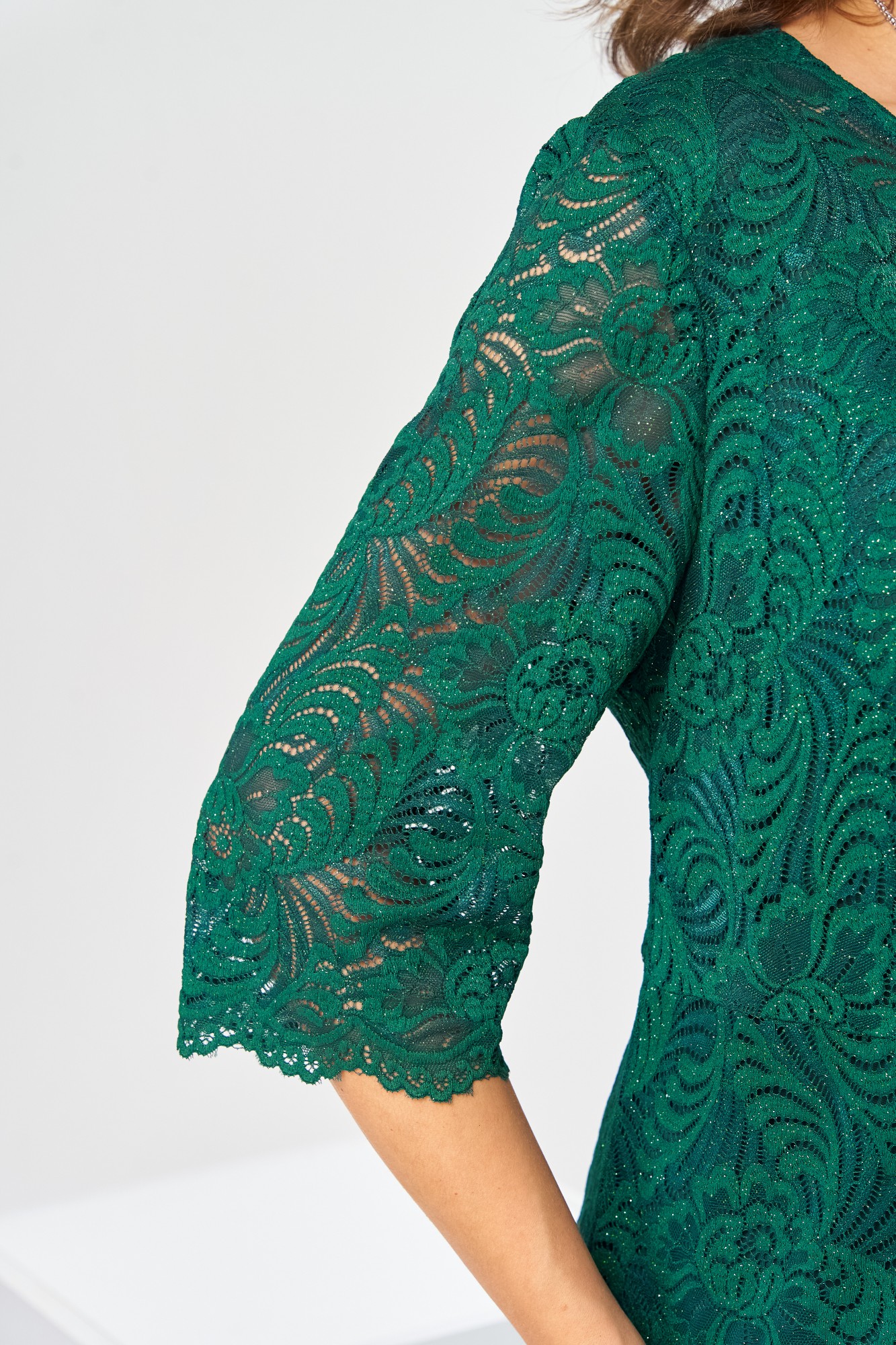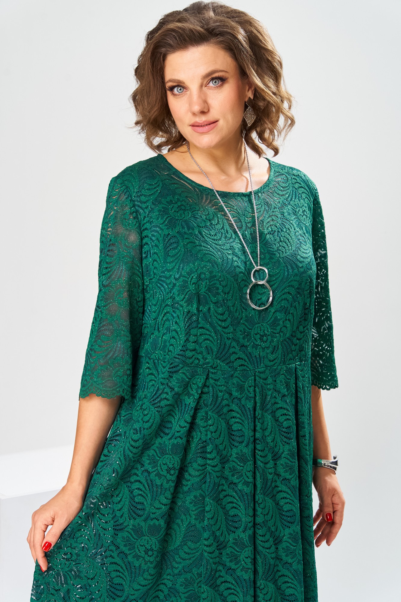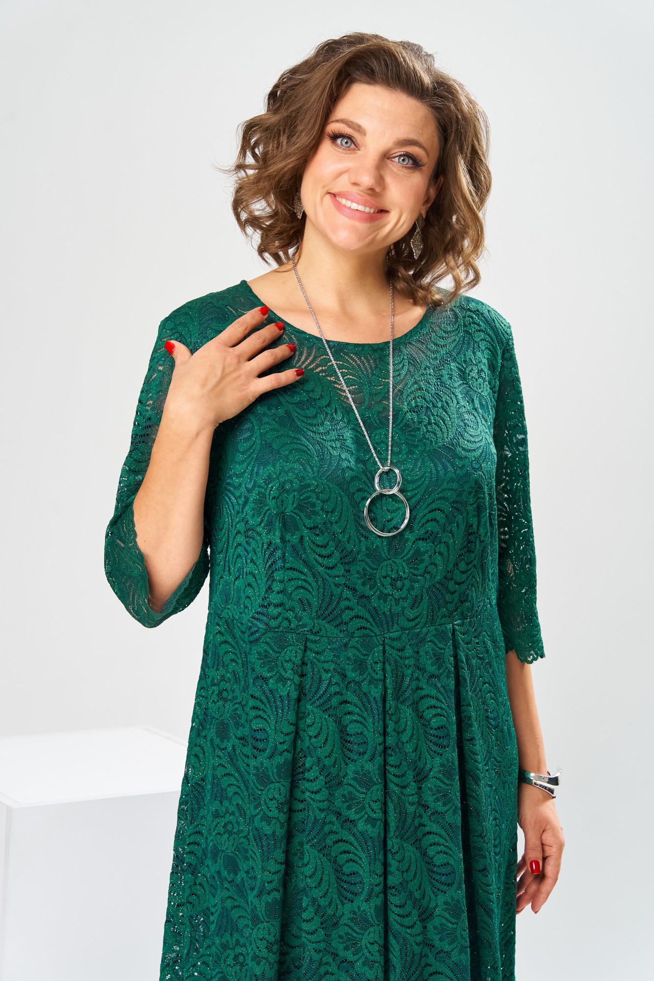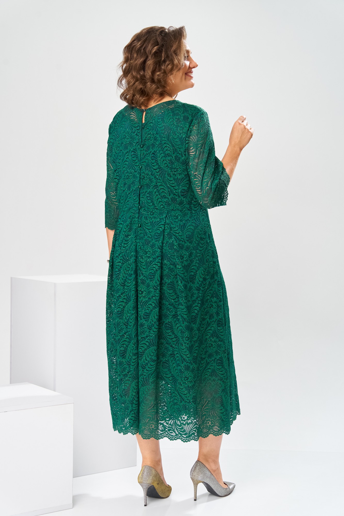 Платье женское отрезное по линии талии, предназначено для торжественного выхода. Перед: верхняя часть с двумя таллиевыми вытачками, нижняя часть с тремя встречными бантовыми складками. Горловина круглая, обтачная, без воротника. Застежка на 7 пришивных пуговиц в среднем шве спинки. Рукав втачной, одно шовный, длиной 3/4. Платье на подкладке с плечевыми накладками.