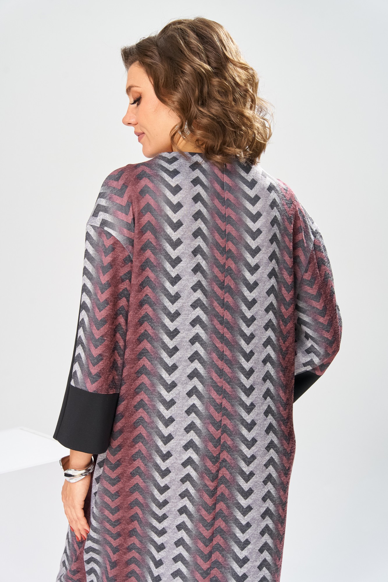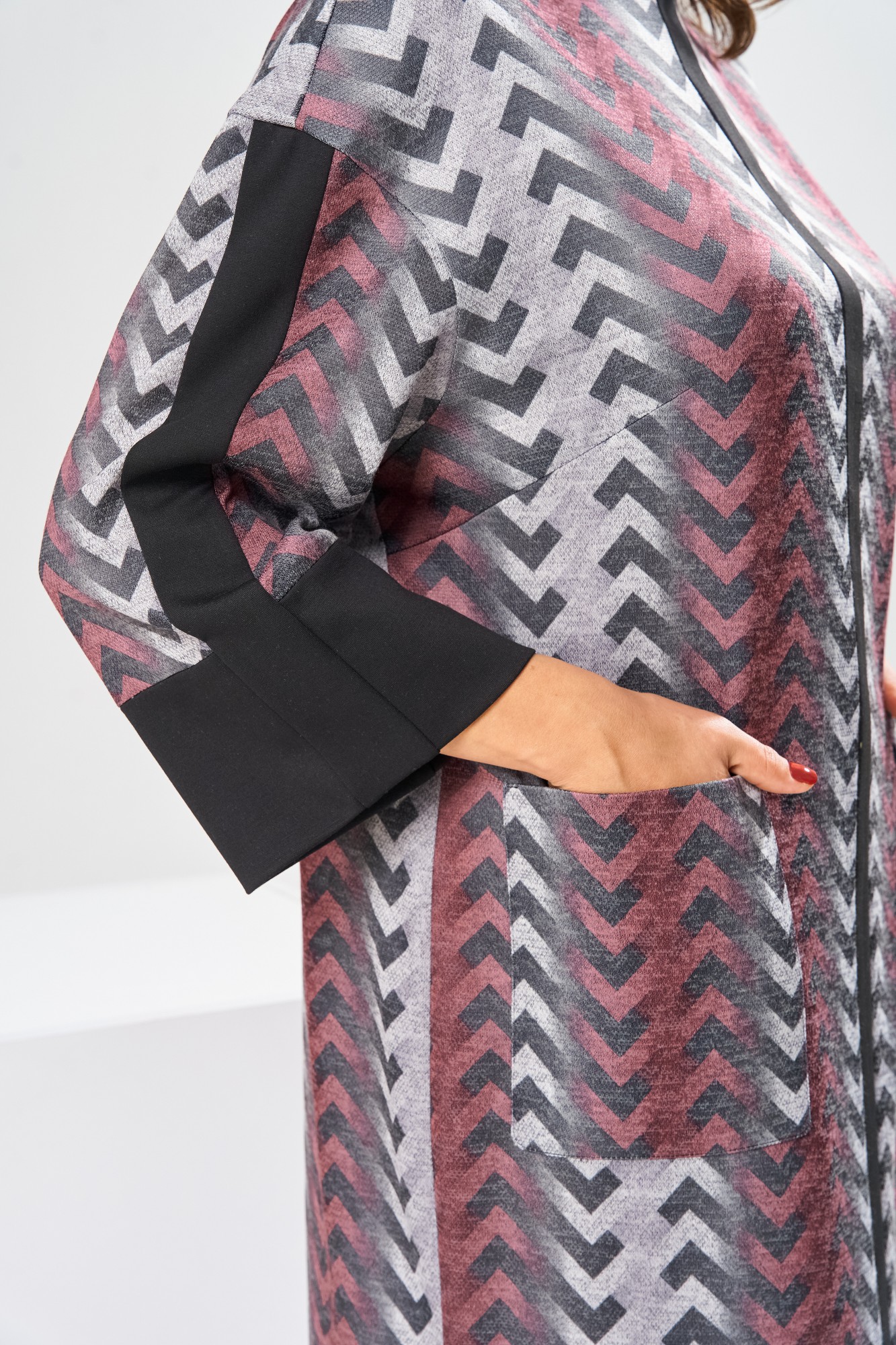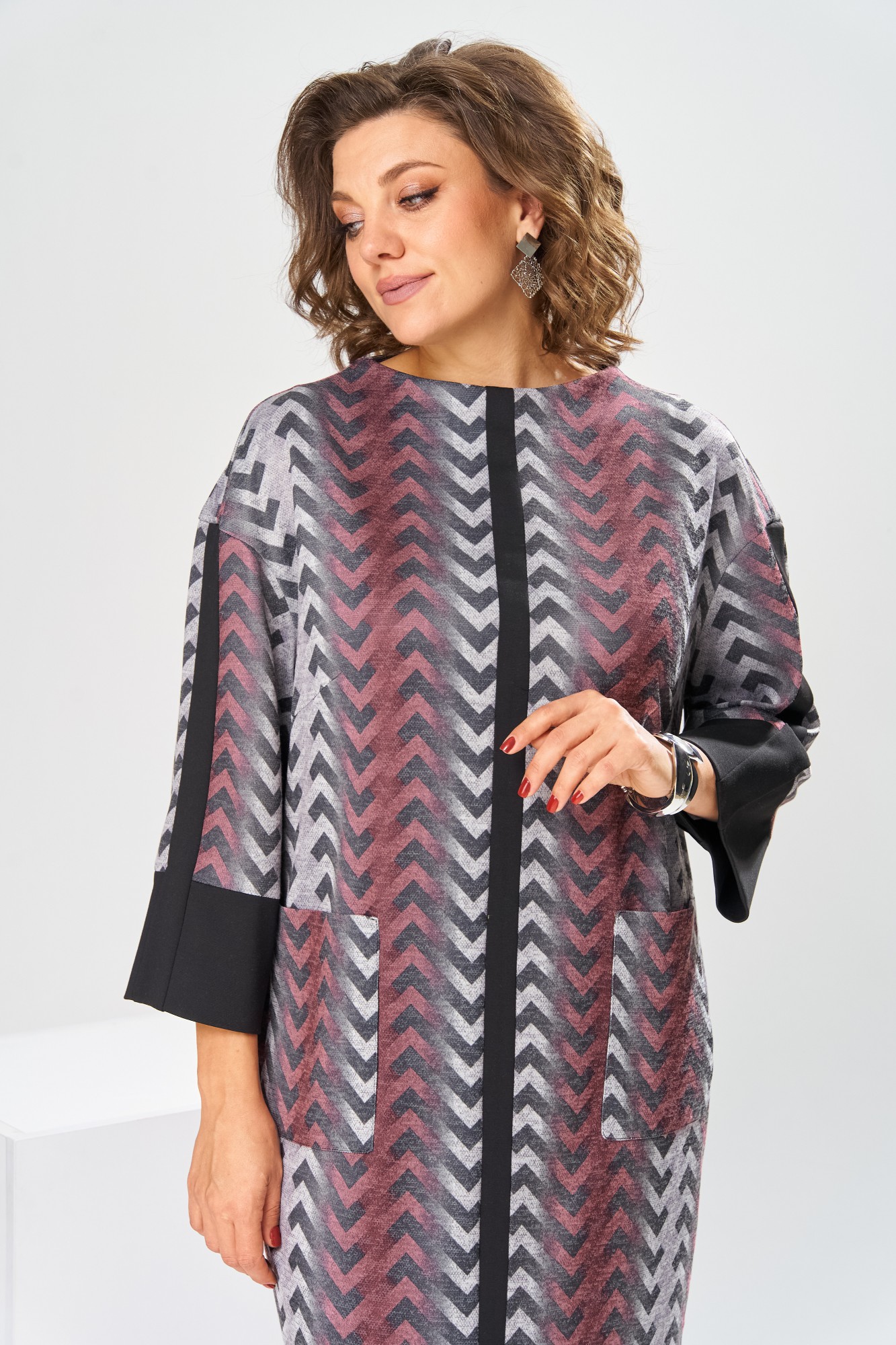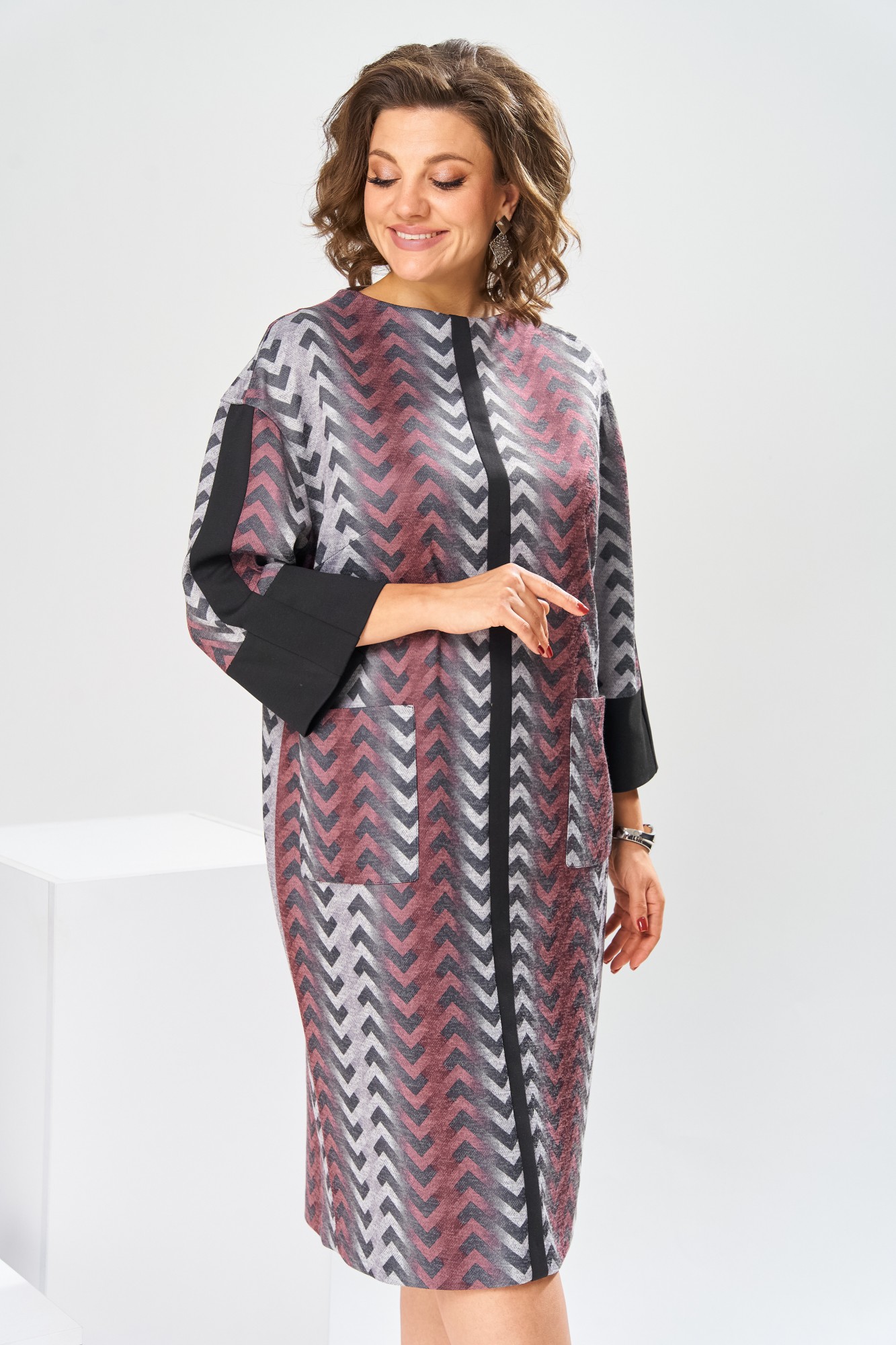 Платье женское для повседневной носки. Платье женское полу прилегающего силуэта, длиной за колено. Перед с 2-мянагрудными выточками, с 2-мя накладными прямоугольными карманами, на уровне линии бёдер, с приточной вертикальной планкой из отделочной ткани. Спинка со средним швом, заканчивающимся разрезом. Застёжка на потайную тесьму-молнию в среднем шве спинки. Горловина с цельнокроеной стойкой, обточная. Платье со спущенным плечом. Рукав втачной, длиной 7/8 с приточной манжетой из отделочной ткани и приточной вертикальной планкой из отделочной ткани по центру. Платье без плечевых накладок.