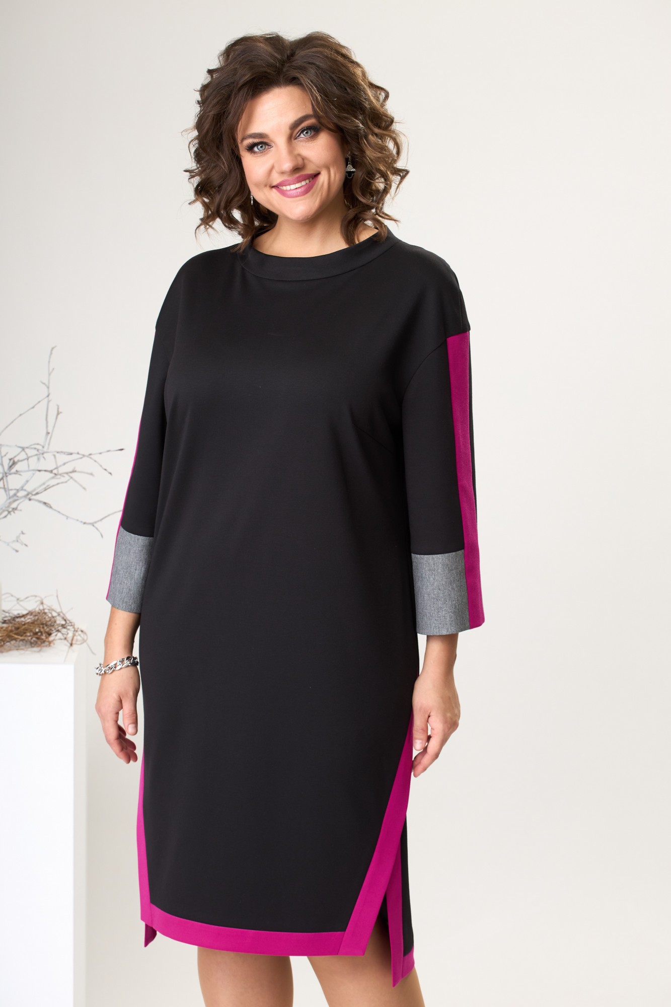 Платье женское для повседневной носки. Платье женское прямого силуэта, длиной за колено, с фигурным низом "ступенька". Перед с двумя нагрудными вытачками. Спинка цельнокроеная. Боковые швы с фигурными разрезами. Разрезы и низ платья с приточными планками из отделочной ткани. Горловина круглая с втачной стойкой. Платье со спущенным плечом. Рукав втачной, длиной 7/8, с приточной вертикальной планкой из отделочной ткани по центру и приточной манжетой из отделочной ткани. Платье без плечевых накладок.