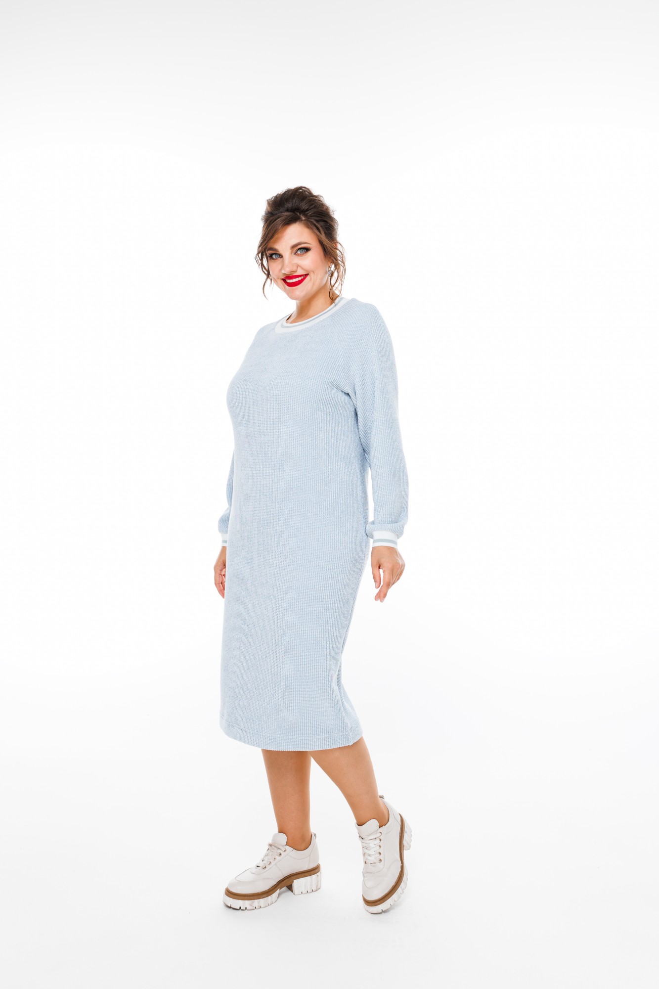 Платье женское, предназначено для повседневной носки. Платье женское, прямого силуэта, длиной за колено. Перед и спинка цельнокроеные. Горловина круглая, с втачной отделочной планкой, шов соединения который декорирован надстрочной отделочной тесьмой. Рукав втачной, длинный, реглан с притачной отделочной манжетой, шов соединения которой декорирован надстрочной декорированной тесьмой. Платье на подкладке. Платье без плечевых накладок. Длина спинки платья 107 см, длина рукава 67 см.