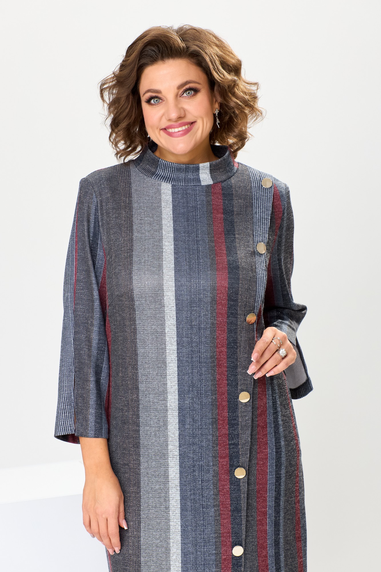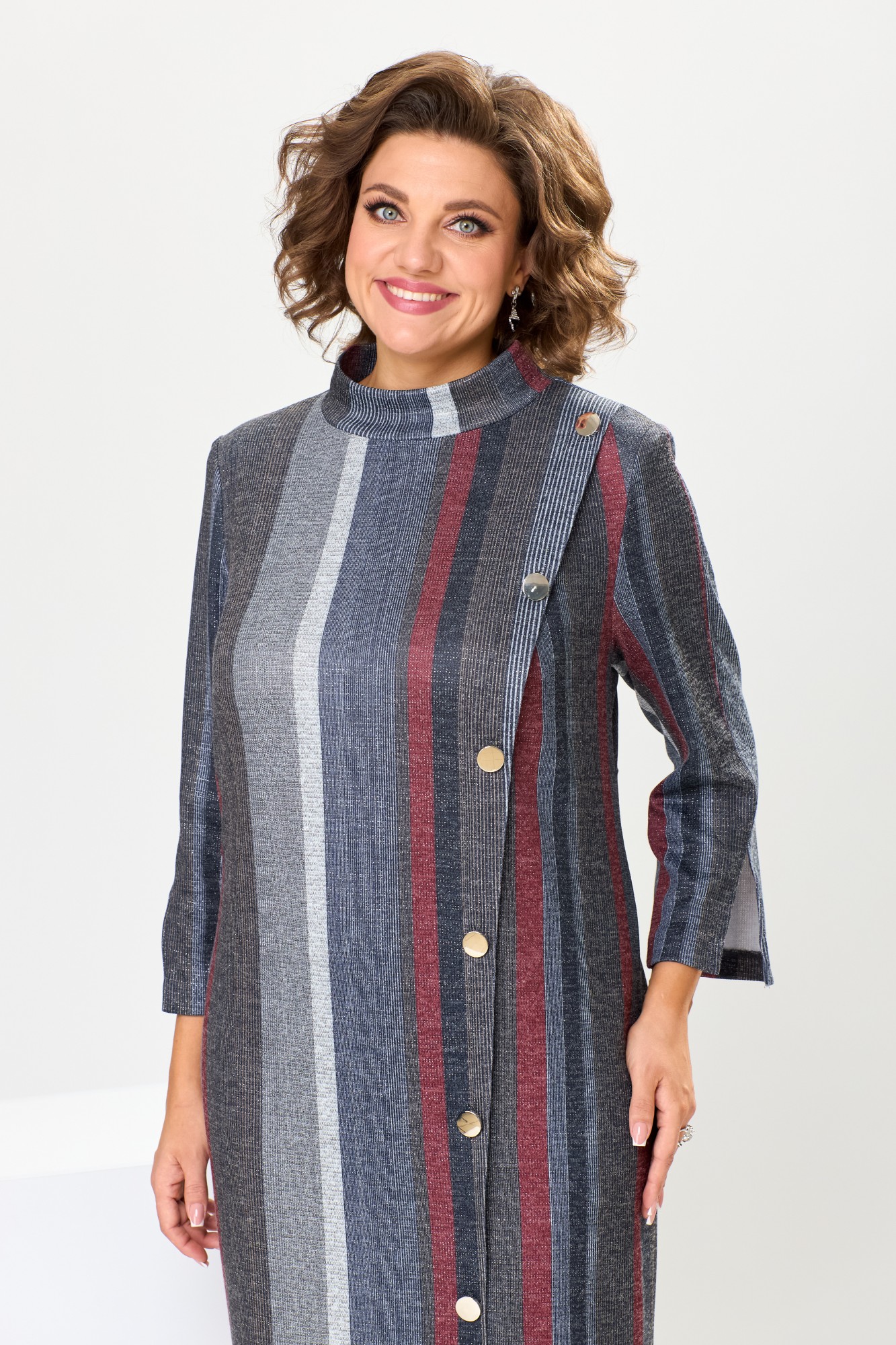 Платье женское предназначено для повседневной носки. Платье женское полу прилегающего силуэта, длиной до нижней части икры. Перед с 1-ной нагрудной вытачкой на центральной части, с 1-ним отрезным рельефом слева, выходящим из плечевого шва, шов соединения рельефа с передом декорирован 6-ю пришивными пуговицами и заканчивается шпицей. Спинка с 2-мя таллиевыми вытачками. В боковых швах обработаны карманы. Горловина круглая с втачной стойкой. Рукав втачной, 2-х шовный, длиной 7/8, верхний шов с разрезом.