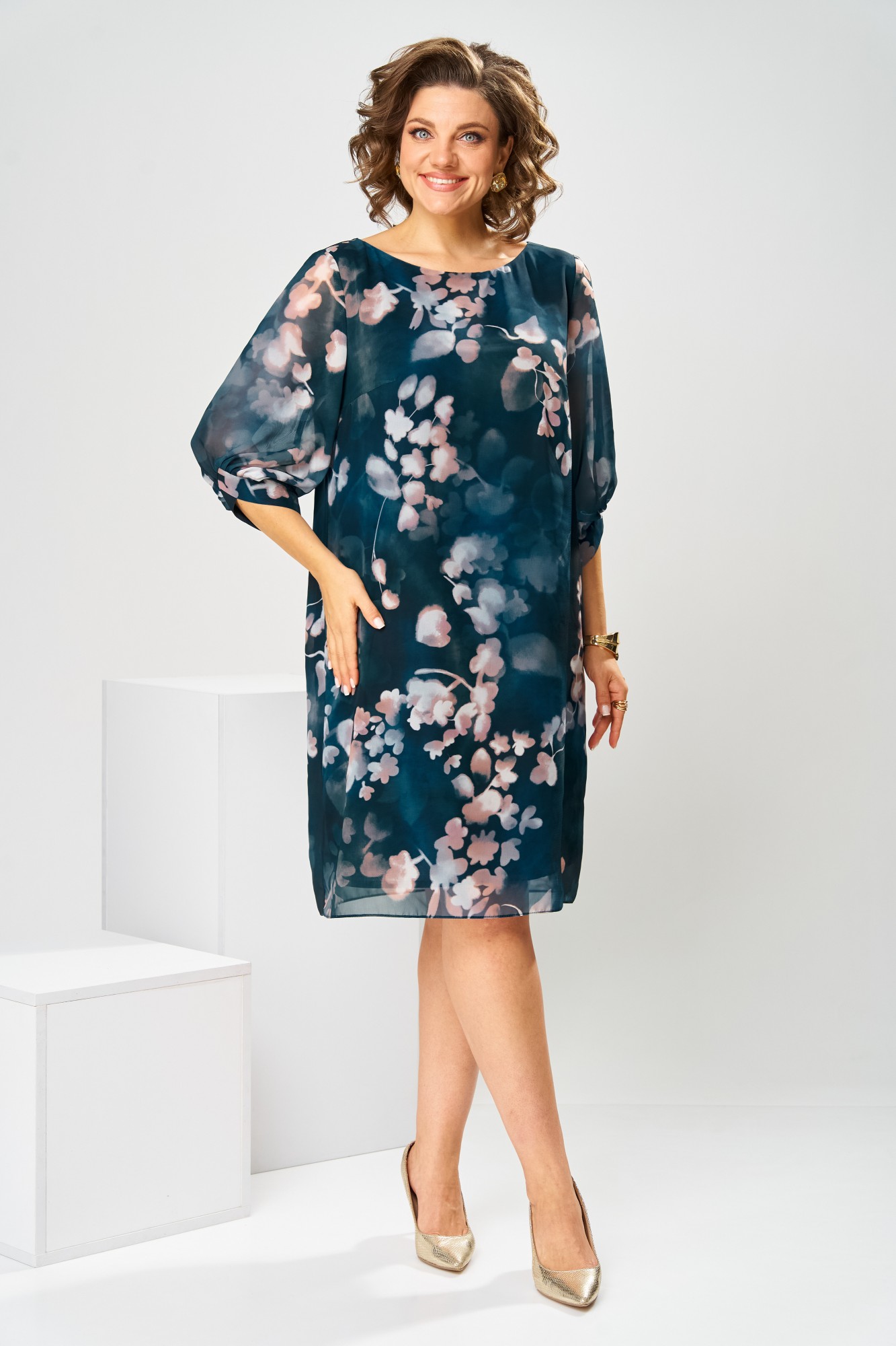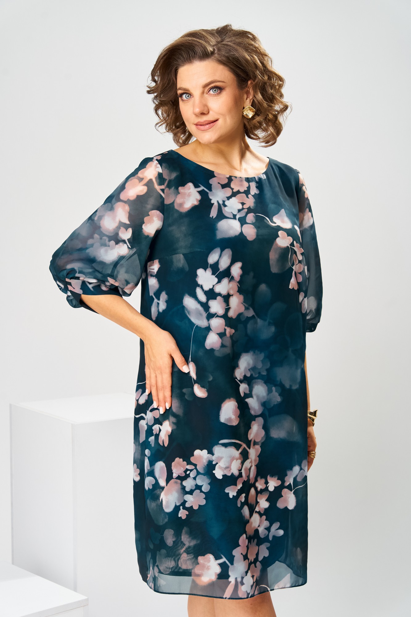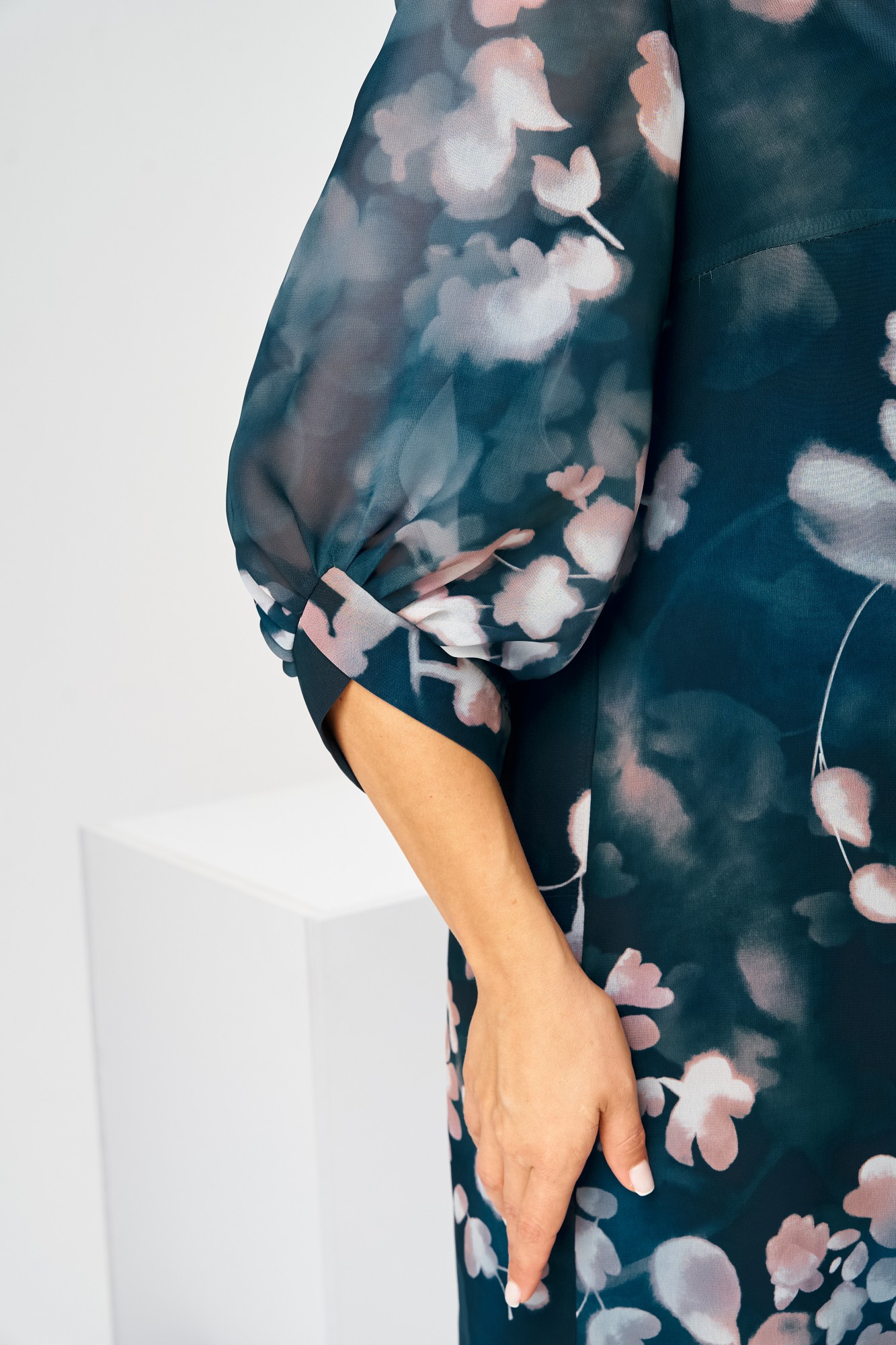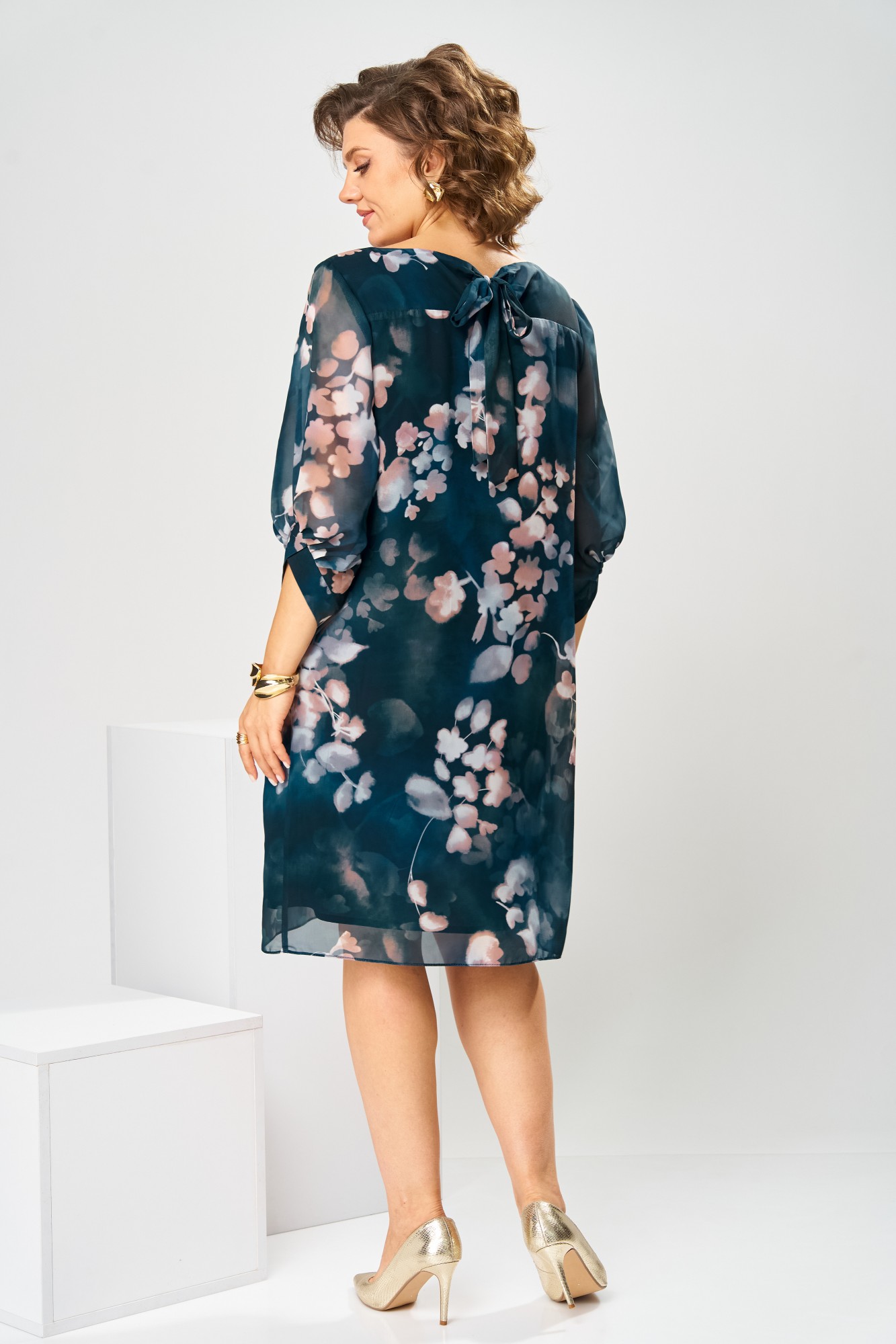 Платье женское относится к нарядной торжественной одежде. Платье женское прямого силуэта, длиной за колено. Перед с 2-мя нагрудными вытачками. Спинка с отрезной кокеткой с фигурным обтачным разрезом, фиксирующимся по горловине на 2-е обточные завязки. Горловина круглая, обтачная, без воротника. Рукав втачной, одношовный, длиной 3/4 с фигурным низом с 14-ю односторонними складками (по 7 с каждой стороны от угла манжеты), с притачной манжетой из отделочной ткани. Платье на подкладке. Платье без плечевых накладок.