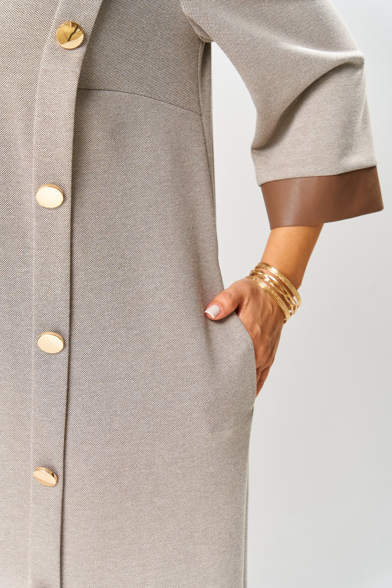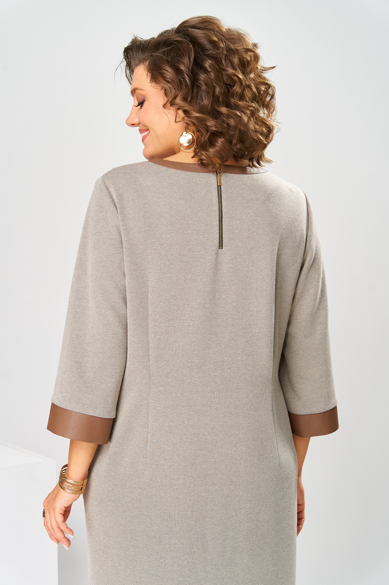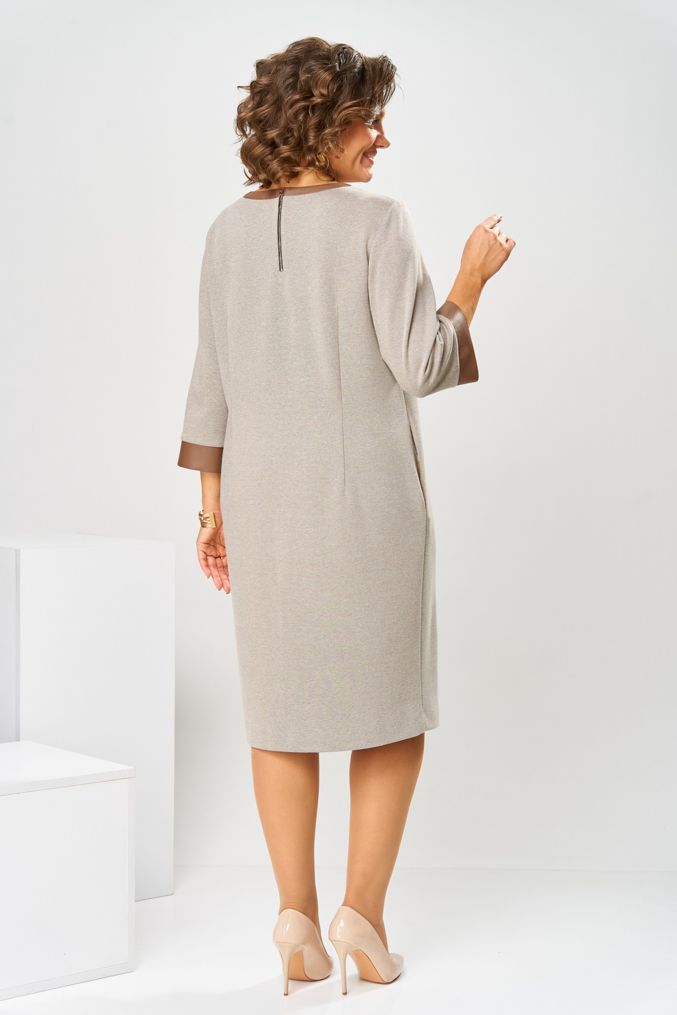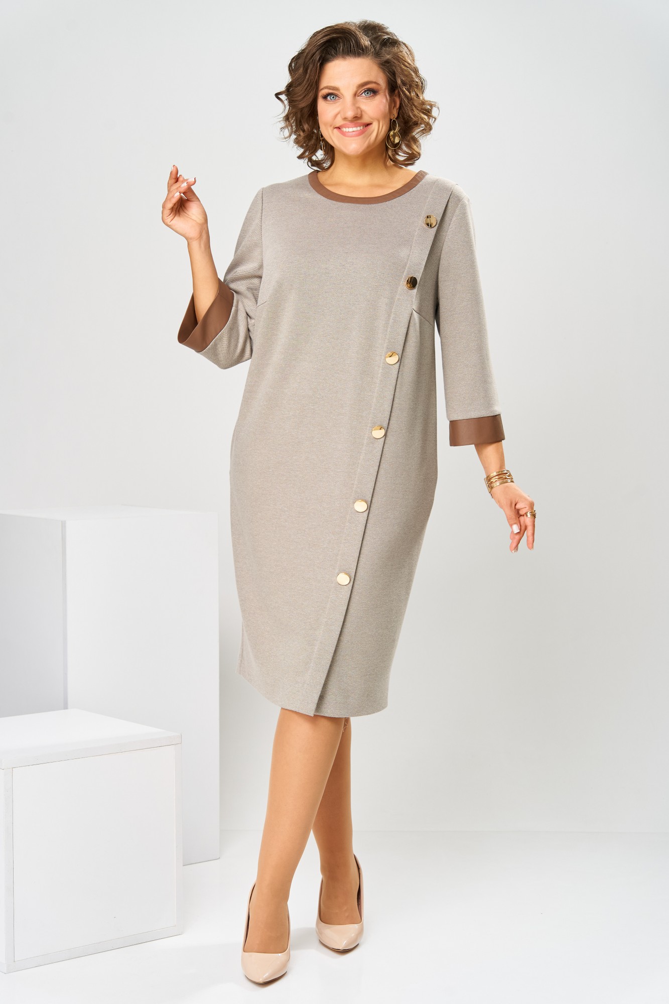 Платье предназначено для повседневной носки. Платье женское, полуприлегающего силуэта, длиной за колено. Перед с 2-мя нагрудными вытачками, с цельнокроеной вертикальной планкой шириной 3,5 см, закреплённой к переду 6-ю пришивными декоративными пуговицами; перед с втачной планкой из отделочной ткани. Спинка с 2-мя таллиевыми вытачками, с втачной металлической молнией, с втачной планкой из отделочной ткани по горловине. Платье с карманами в боковых швах. Рукав втачной, одношовный с притачной манжетой из отделочной ткани, рукав длиной 3/4. Платье с плечевыми накладками.