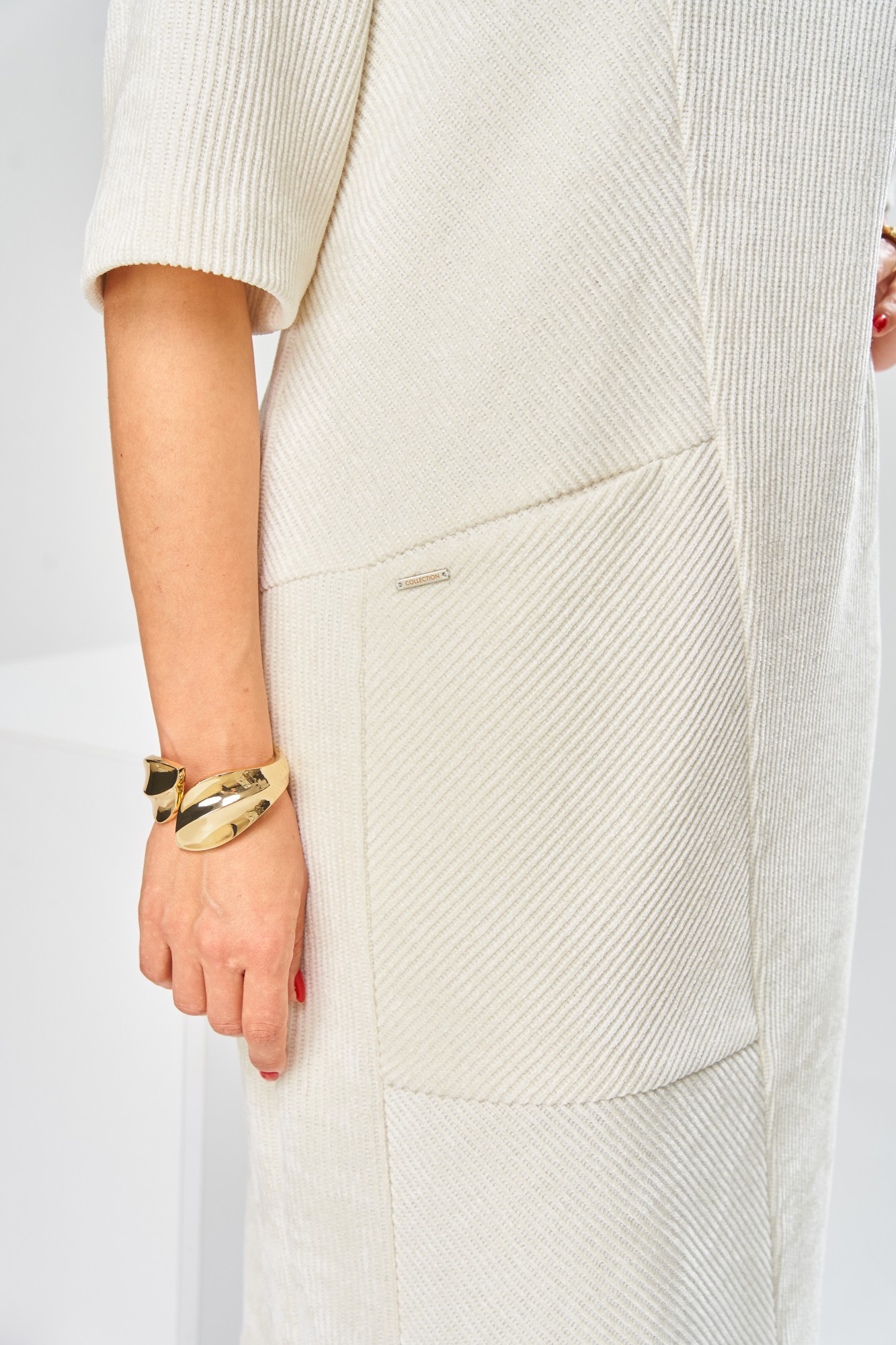 Платье предназначено для повседневной носки. Платье женское, полуприлегающего силуэта, длиной за колено. Перед с 1-ной нагрудной вытачкой слева, с 1-ним рельефом справа выходящим из плечевого шва, на рельефе обработан накладной карман, декорированный пришивной металлической пластиной. Спинка со средним швом, заканчивающимся шлицей. Горловина круглая с втачной стойкой. Платье со спущенным плечом. Рукав втачной, одношовный, длиной до локтя, левый рукав декорирован пришивной металлической пластиной. Платье на подкладке. Платье без плечевых накладок.