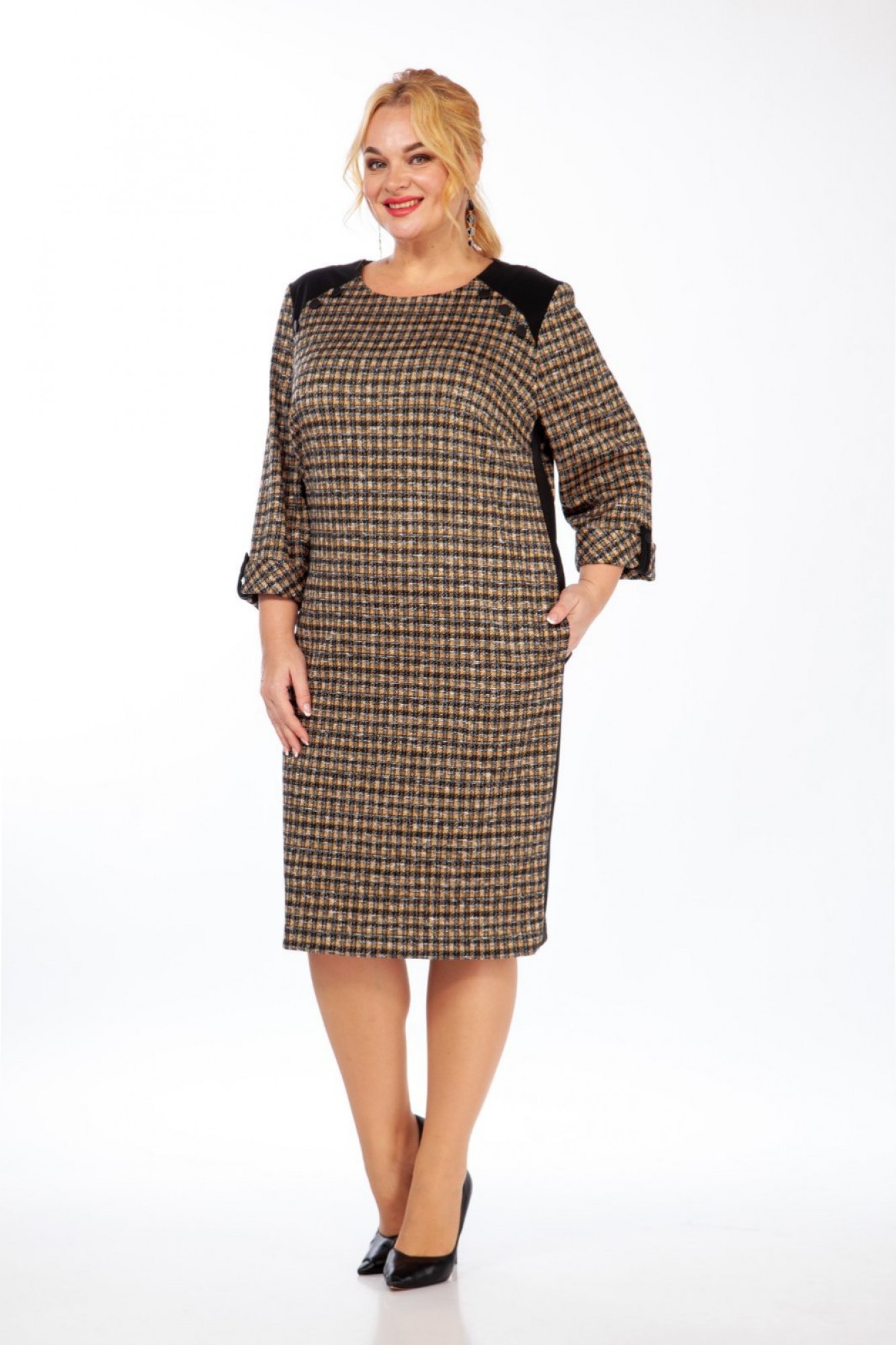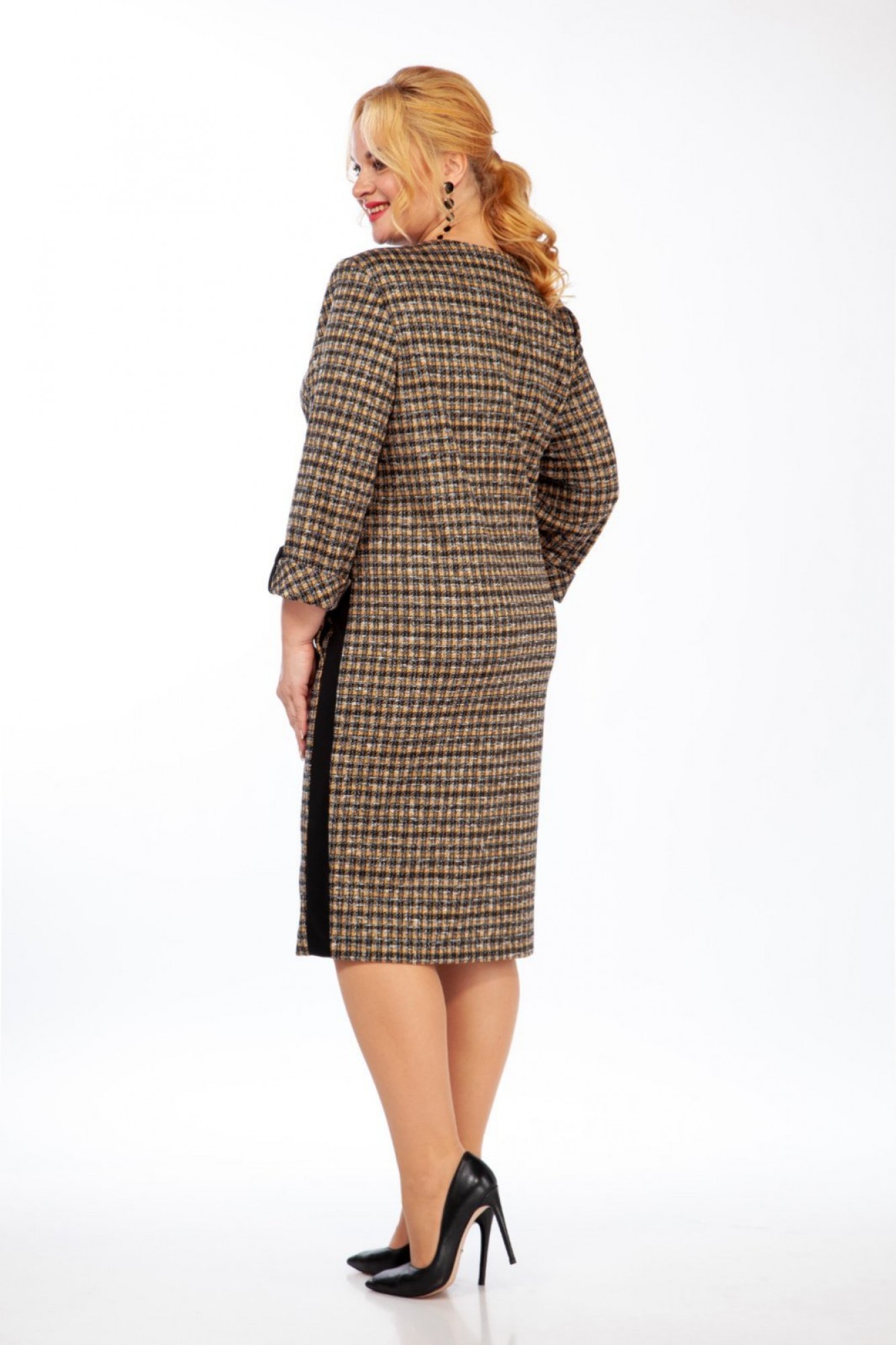 Силуэт полуприлегающий. Рукава втачные, одношовные, внизу с отворотами, закреплёнными патой контрастного цвета с застёжкой на пуговицу. Горловина закруглённая, на обтачке. Перед с нагрудными вытачками. Верх переда с кокетками контрастного цвета. Возле кокеток пришиты 3 декоративные пуговицы. По боковым швам платье отделано вставками контрастного цвета. Спереди, на уровне бёдер, в боковых швах выполнены потайные карманы.