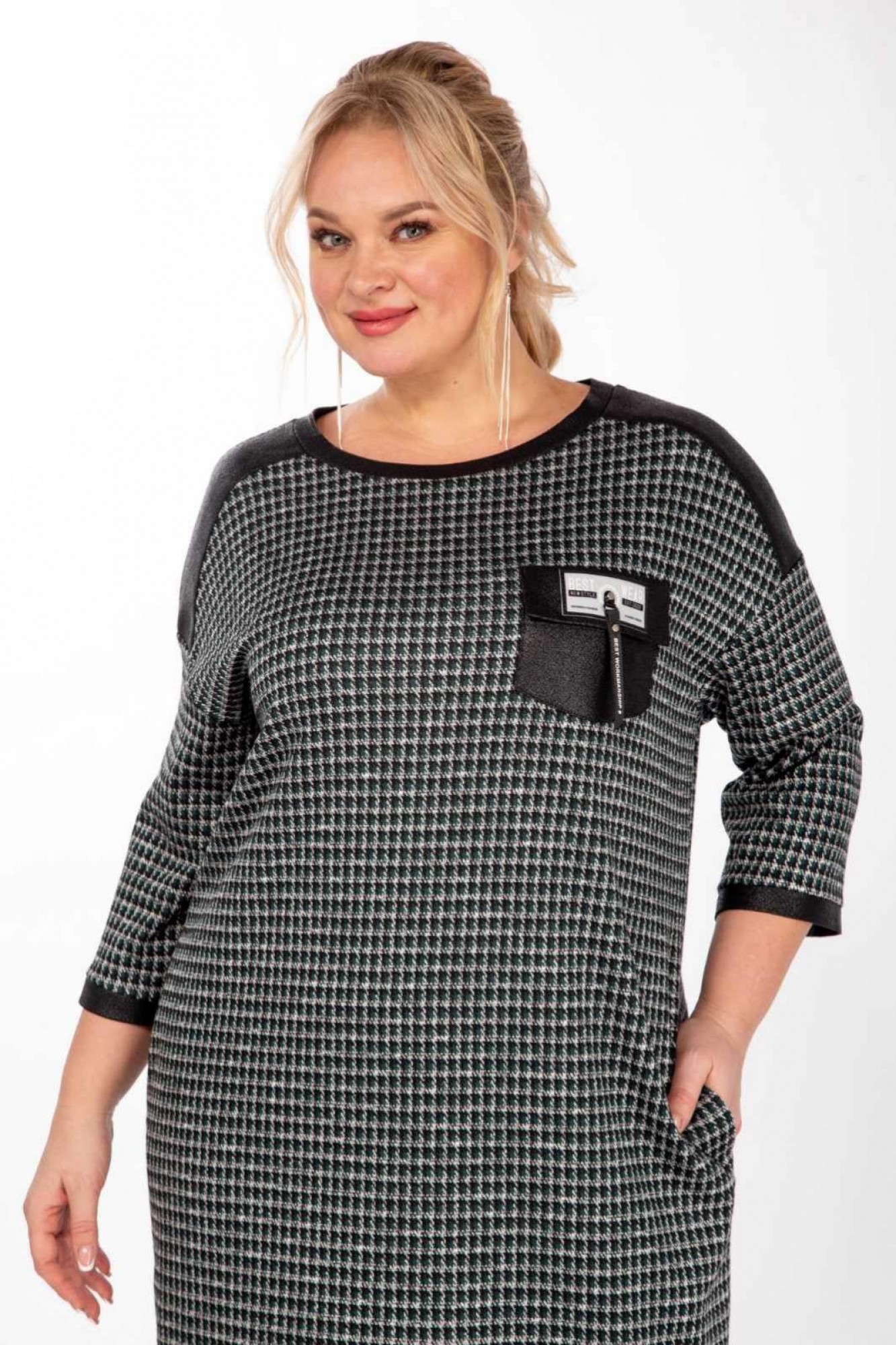 Силуэт прямой, спортивного типа. Рукав со спущенной линией плеча. Внизу рукава манжеты контрастного цвета. Горловина круглая, оформлена отрезной контрастной бейкой. Перед с отрезными кокетками контрастного цвета. В верхней части переда, слева, расположен клапан украшенный пришивным элементом. В боковых швах платья на уровне бёдер выполнены потайные карманы. Платье выполнено из плотного трикотажного полотна.