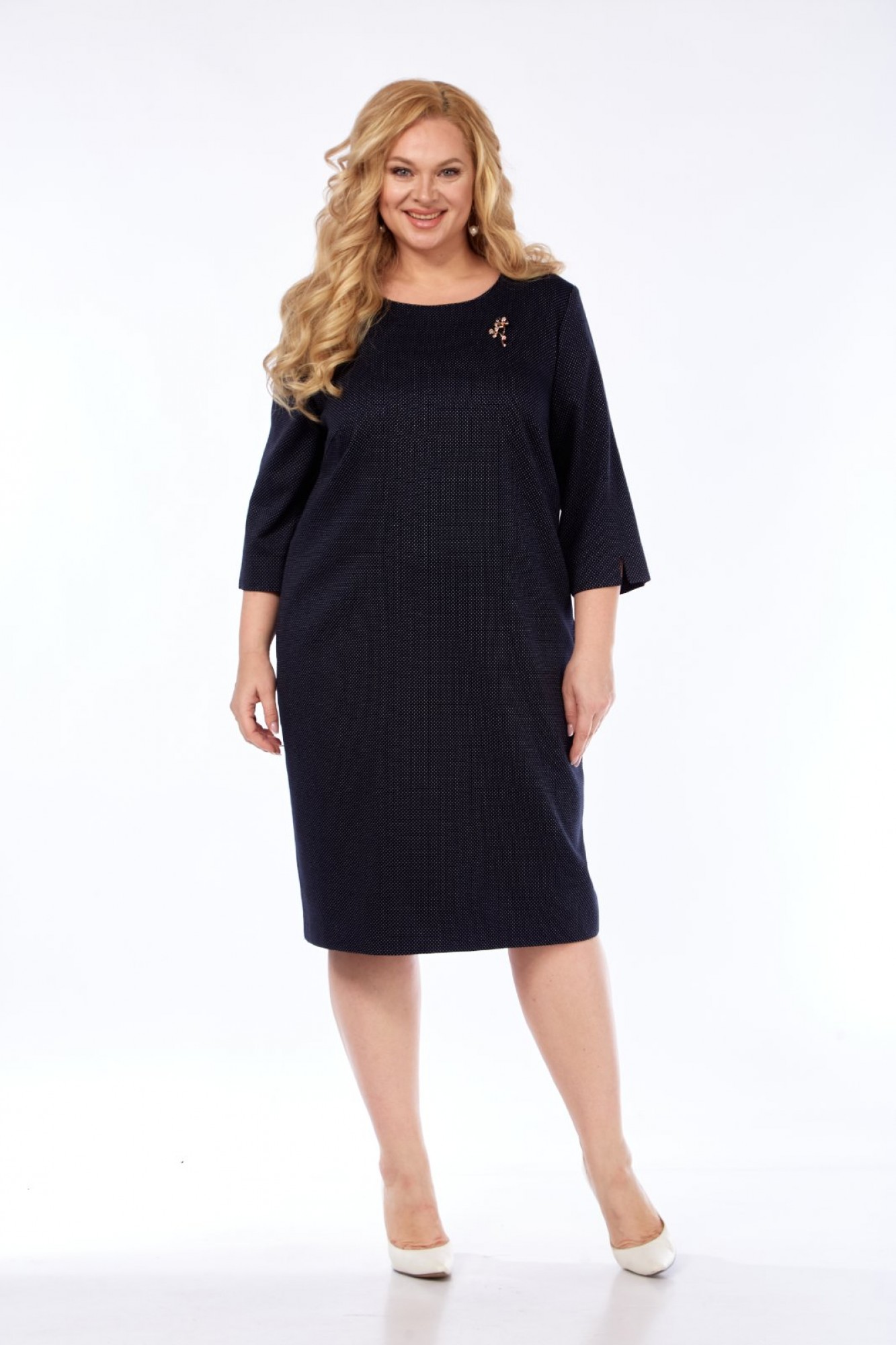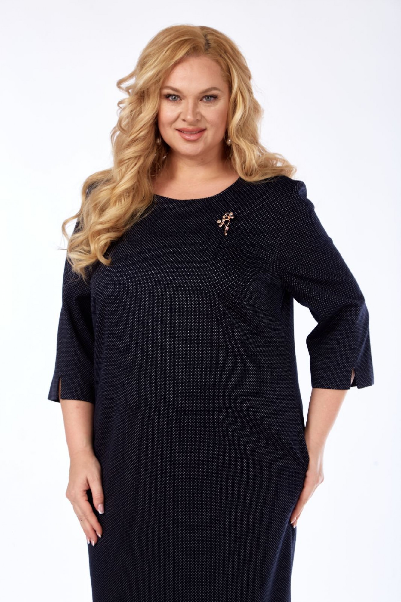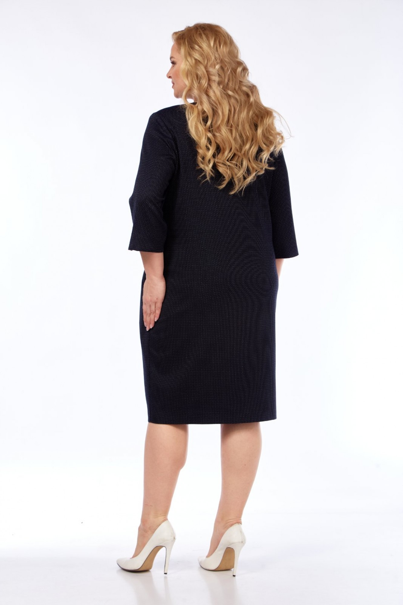 Силуэт полуприлегающий. Рукава втачные, одношовные, внизу с разрезом. Горловина закруглённая, на обтачке. Перед с нагрудными вытачками. В боковых швах платья на уровне бёдер выполнены потайные карманы.