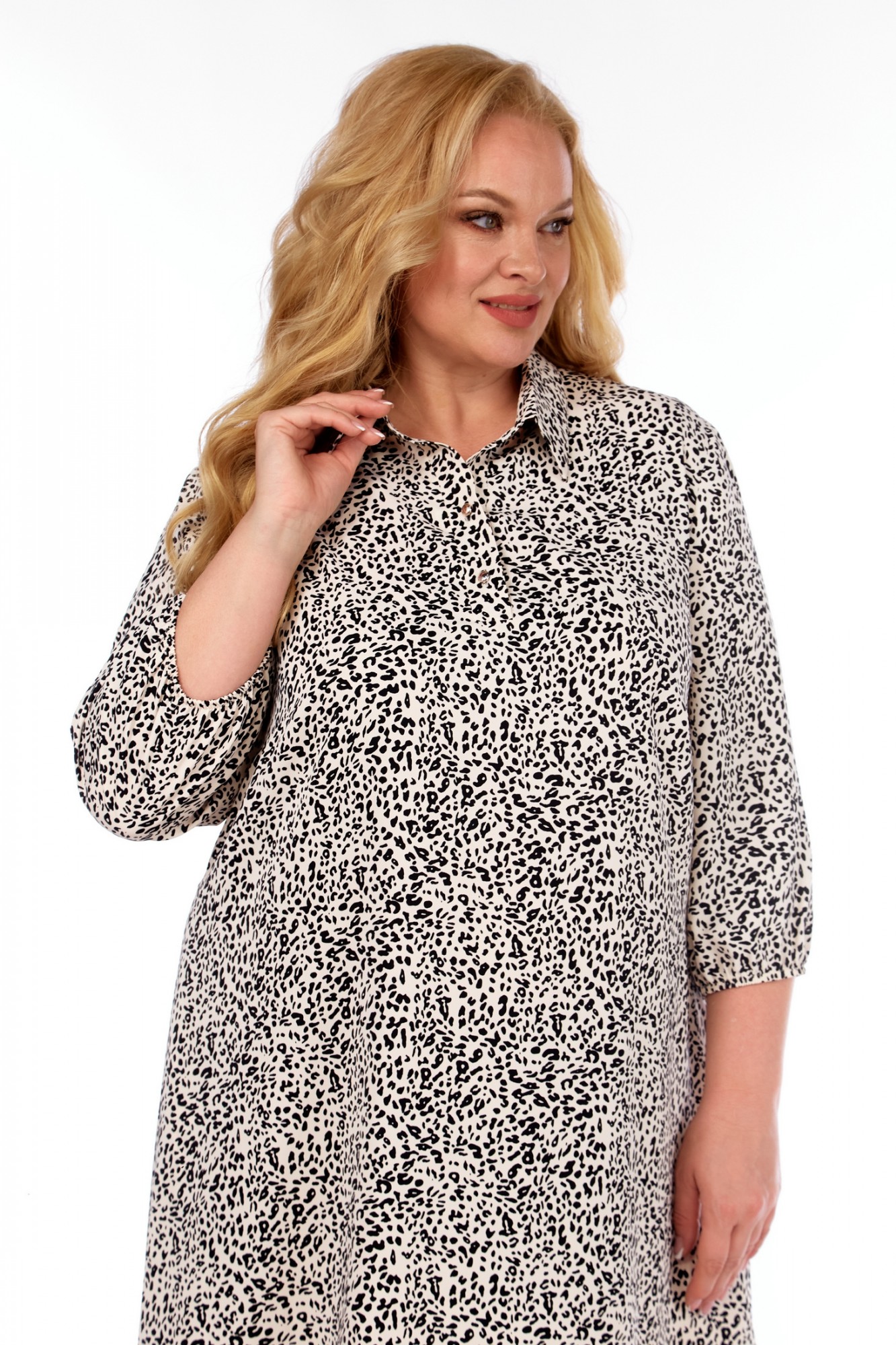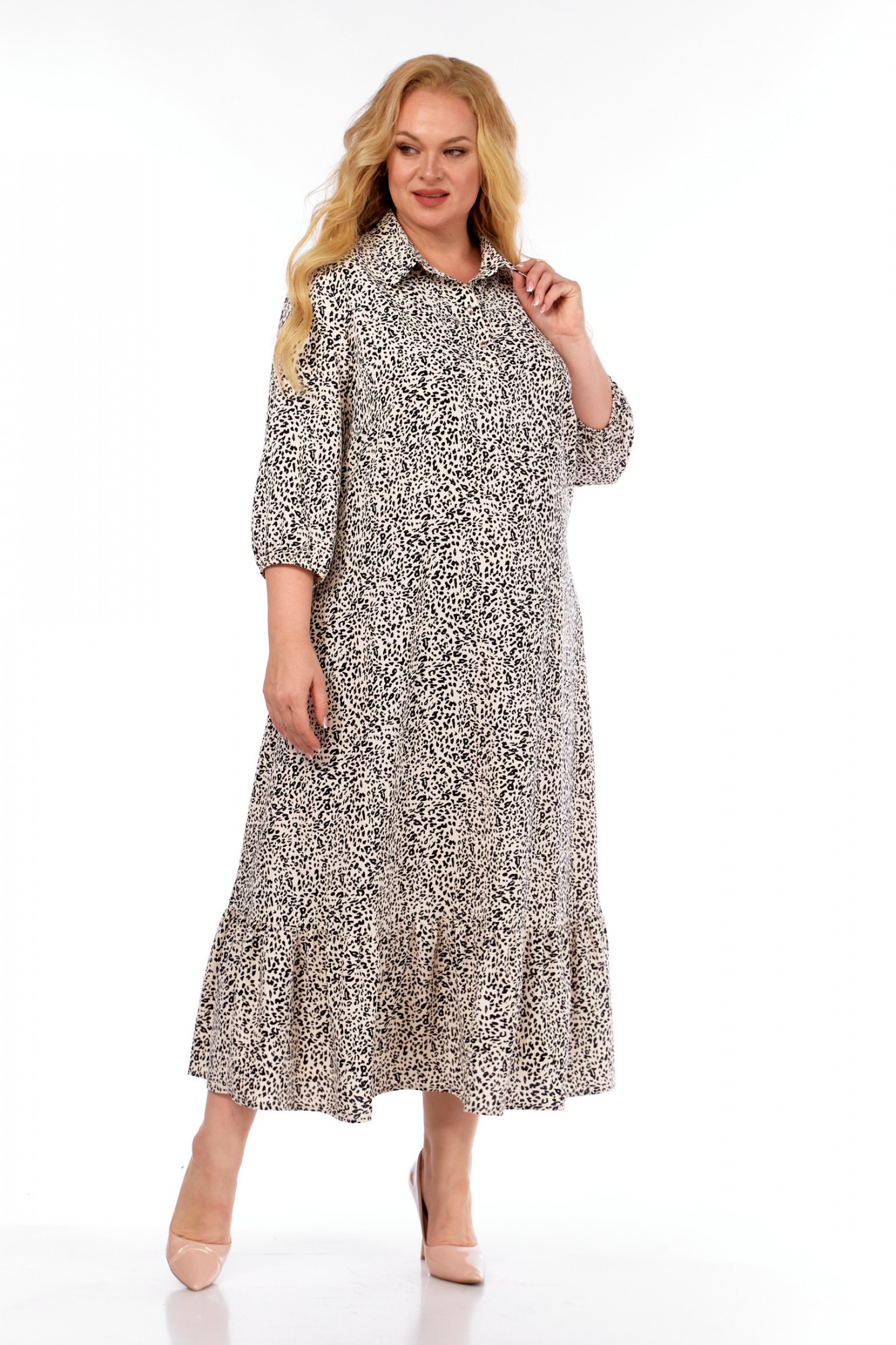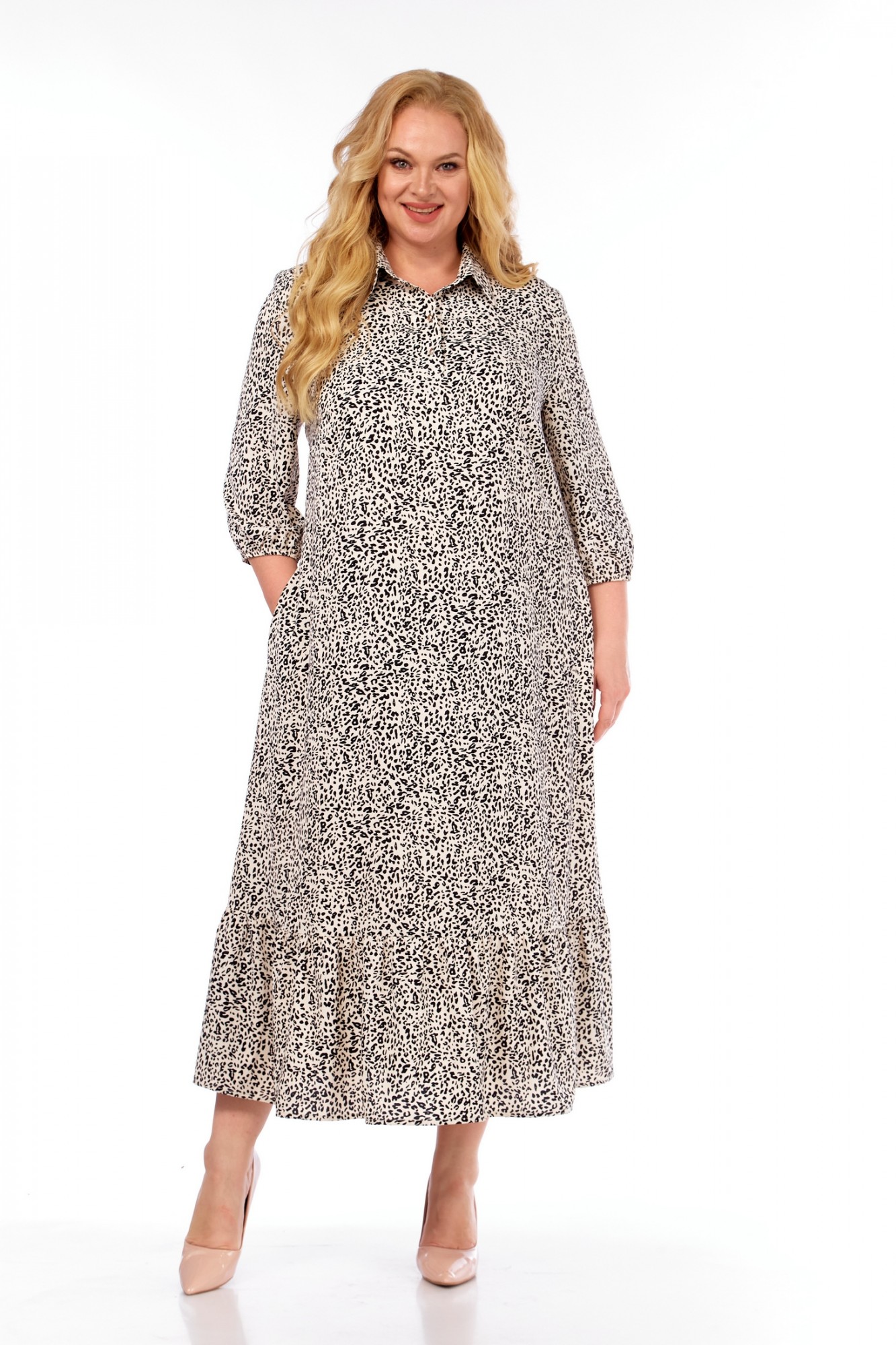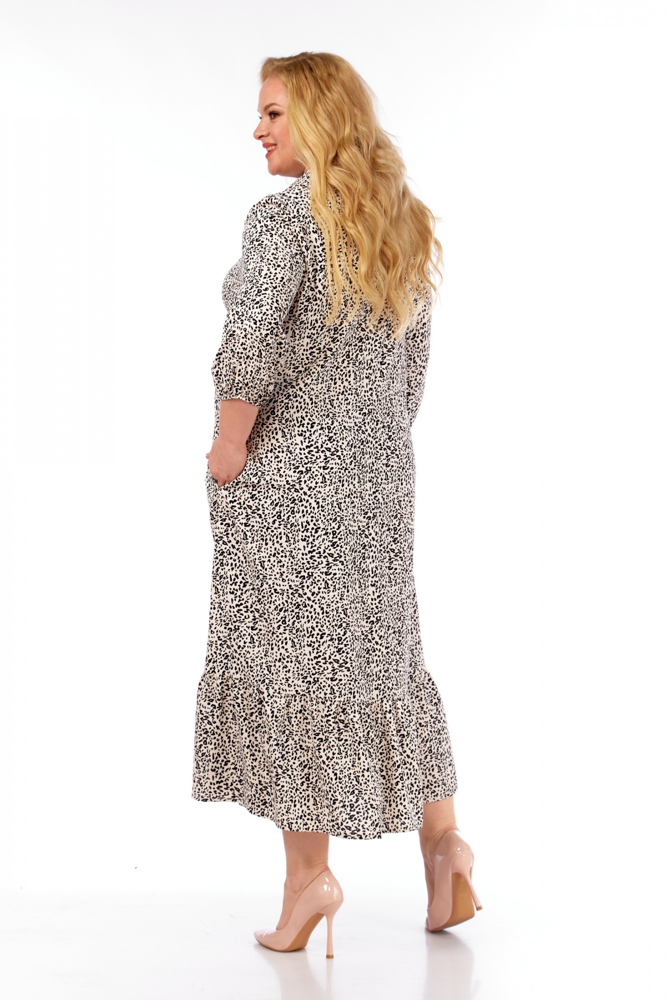 Силуэт полуприлегающий, расширенный к низу. Рукав втачной, одношовный, внизу выполнена сборка на тонкую резинку. Горловина с отложным воротником на стойке, рубашечного типа. Перед с нагрудными вытачками. По центру горловины переда выполнена отрезная планка с застёжкой на две пуговицы. Спинка со средним швом. Низ платья декорирован отрезной оборкой, по которой выполнена сборка. Платье выполнено из лёгкой плательной ткани.