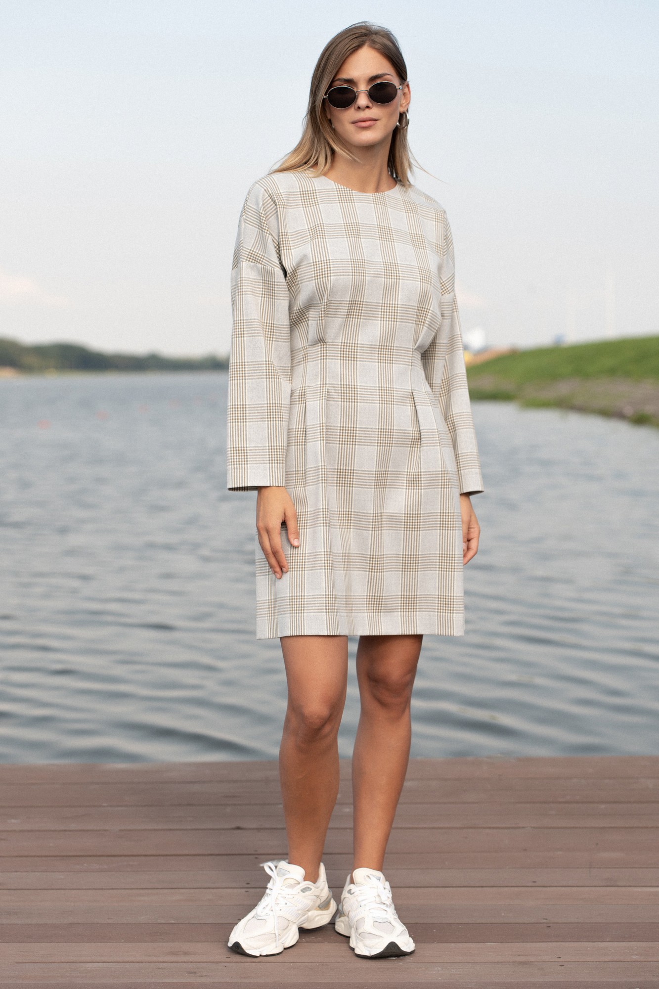 Стильное платье , приталенного силуэта в модном клетчатом принте. Центральная часть переда с застроченными складками на талии, спинка со средним швом и талиевыми вытачками. Застежка молния в среднем шве спинки. В боковых швах функциональные карманы.