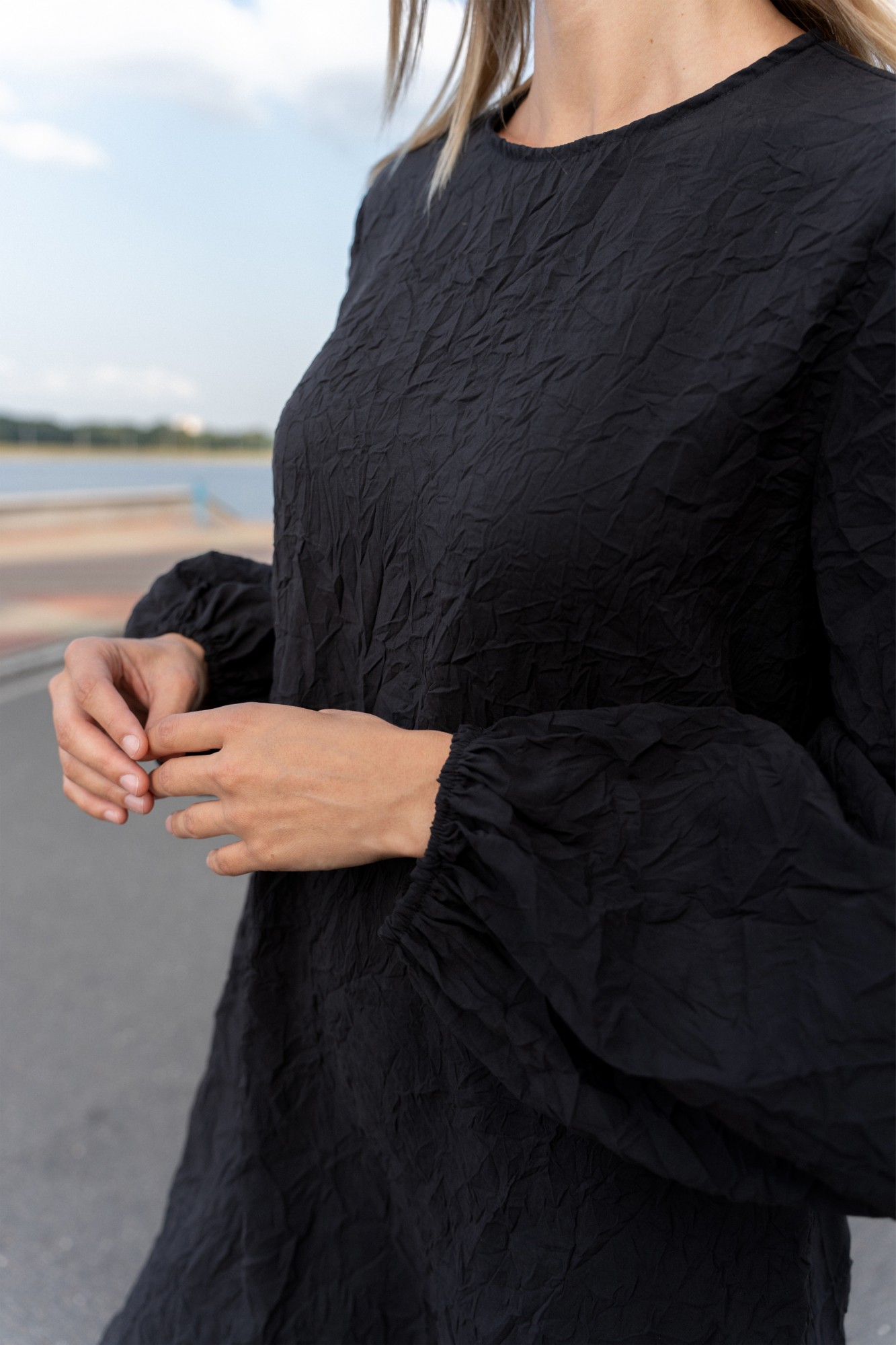 Платье свободного силуэта, слегка расклешенное к низу. Рукав втачной, расширенный к низу, на резинке. По центру спинки обработана застежка на навесную петлю с пуговичкой. Выполнено из эффектной "жатой" вискозы.